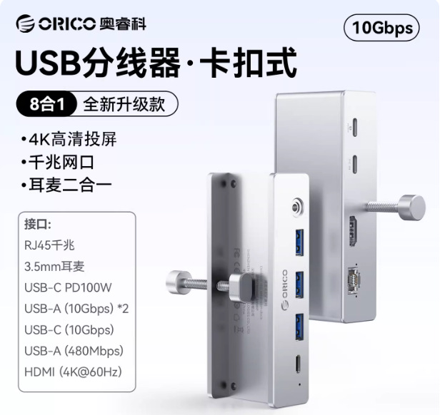 • 10Gbps 새롭게 업그레이드된* [8-in-1] U 포트 + C 포트 3.2|기가비트 이더넷 포트|4K 화면 프로젝션|오디오 2-in-1| *실버