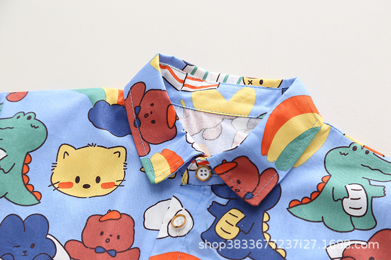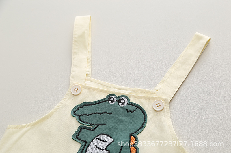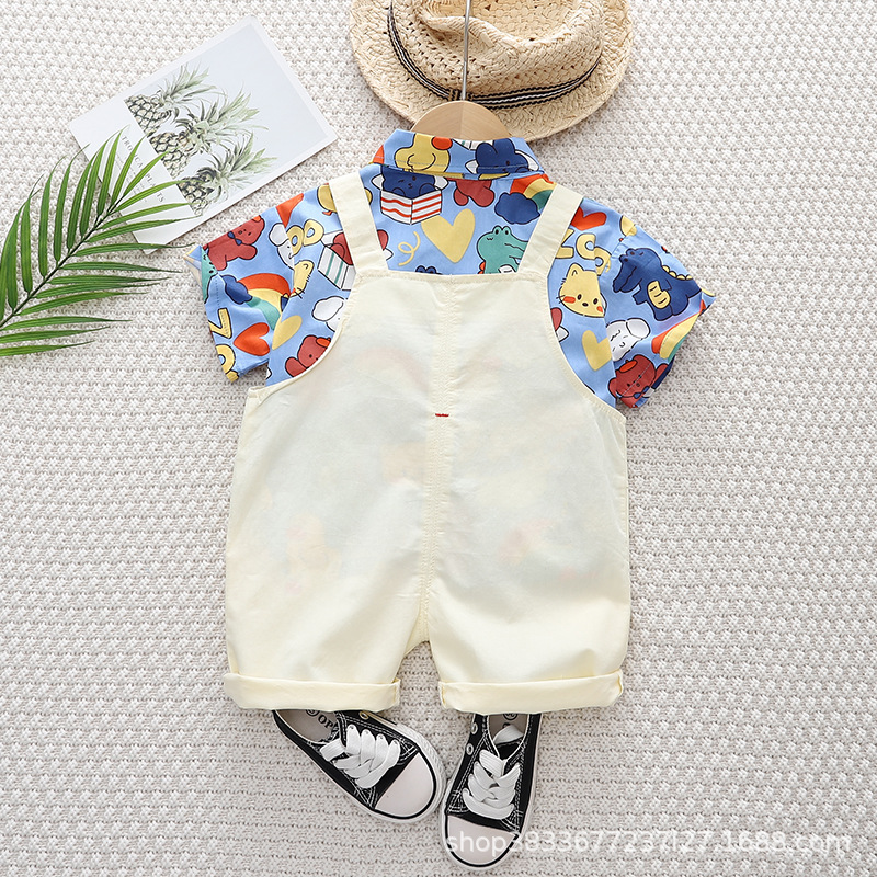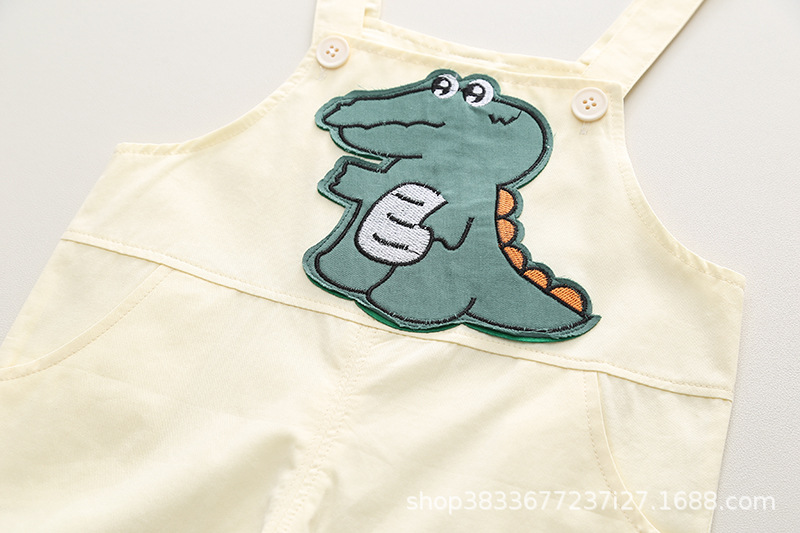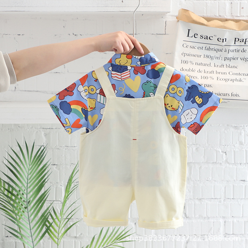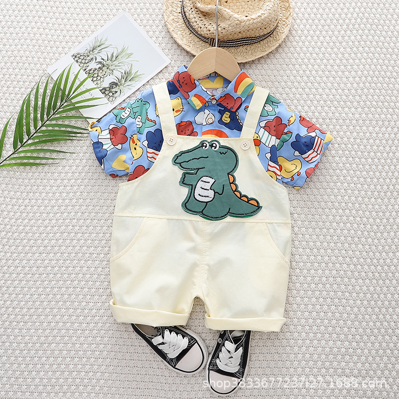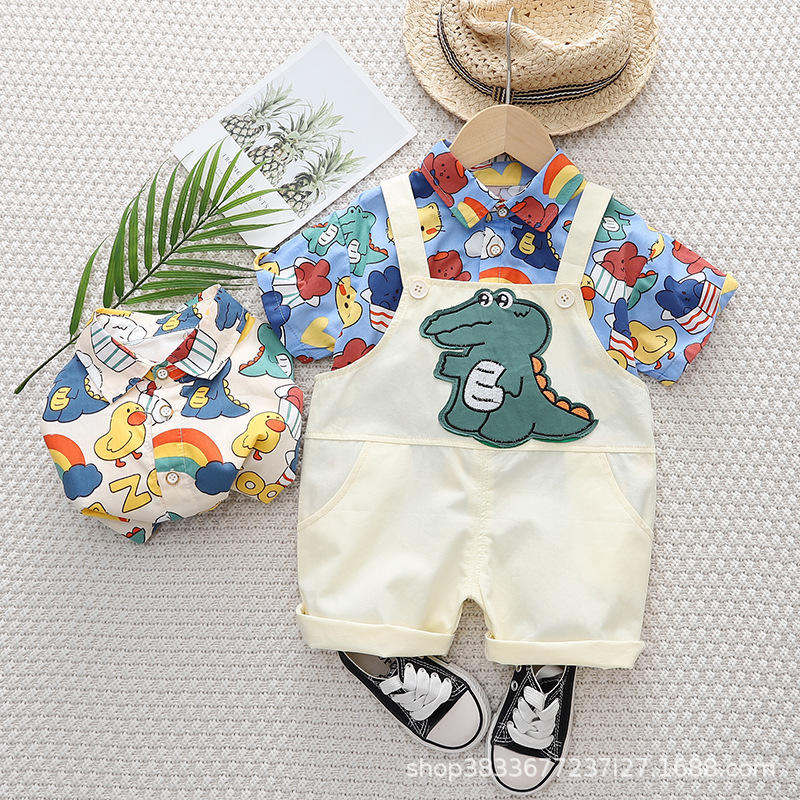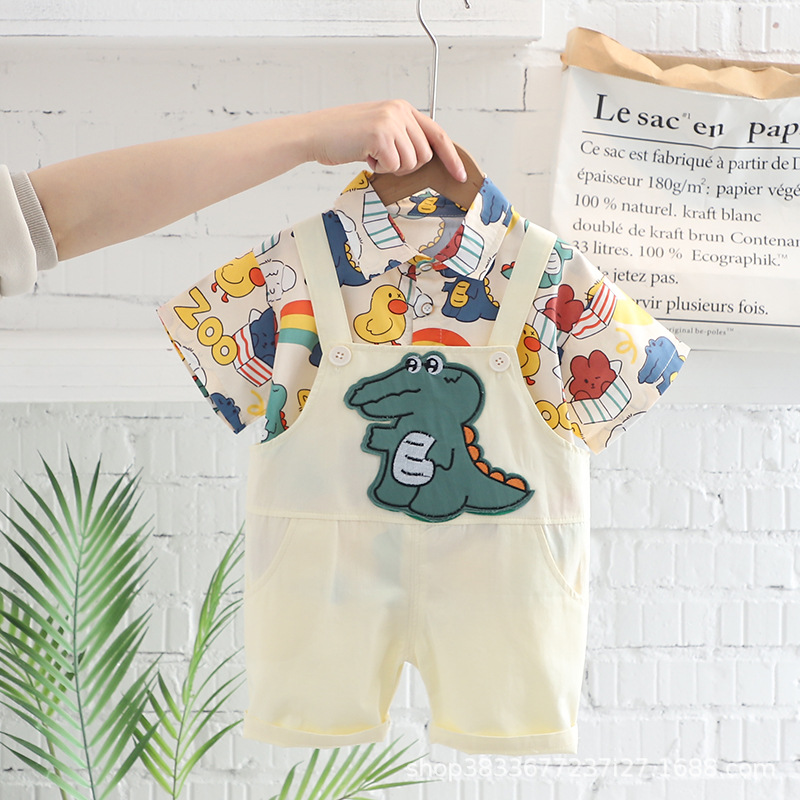 여름 아이들의 새로운 세트 소년과 소녀 아이들의 귀여운 풀 프린트 셔츠 공룡 멜빵 2 종 세트 머리카락의 세대스토어 가기