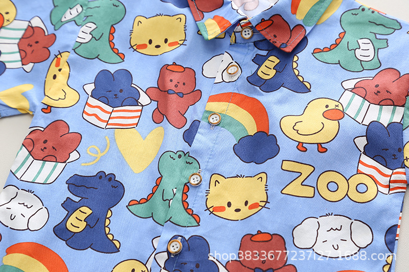 여름 아이들의 새로운 세트 소년과 소녀 아이들의 귀여운 풀 프린트 셔츠 공룡 멜빵 2 종 세트 머리카락의 세대