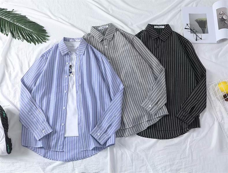 홍콩 스타일 인 스트라이프 셔츠 이너 탑 남성용 모든 매치 루즈한 레트로 셔츠 긴팔 일본식 남성 캐주얼 재킷스토어 가기