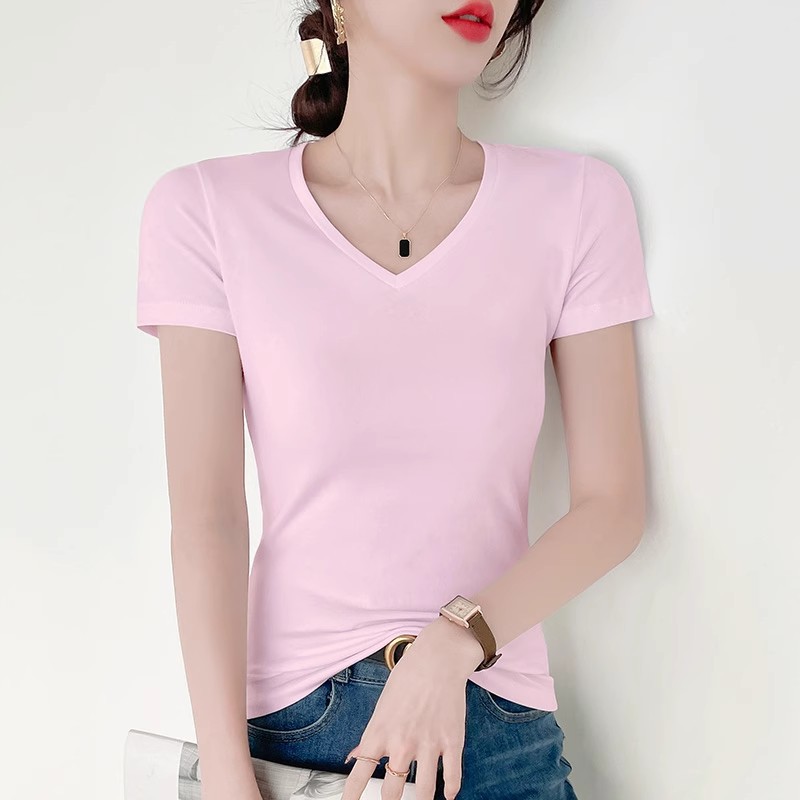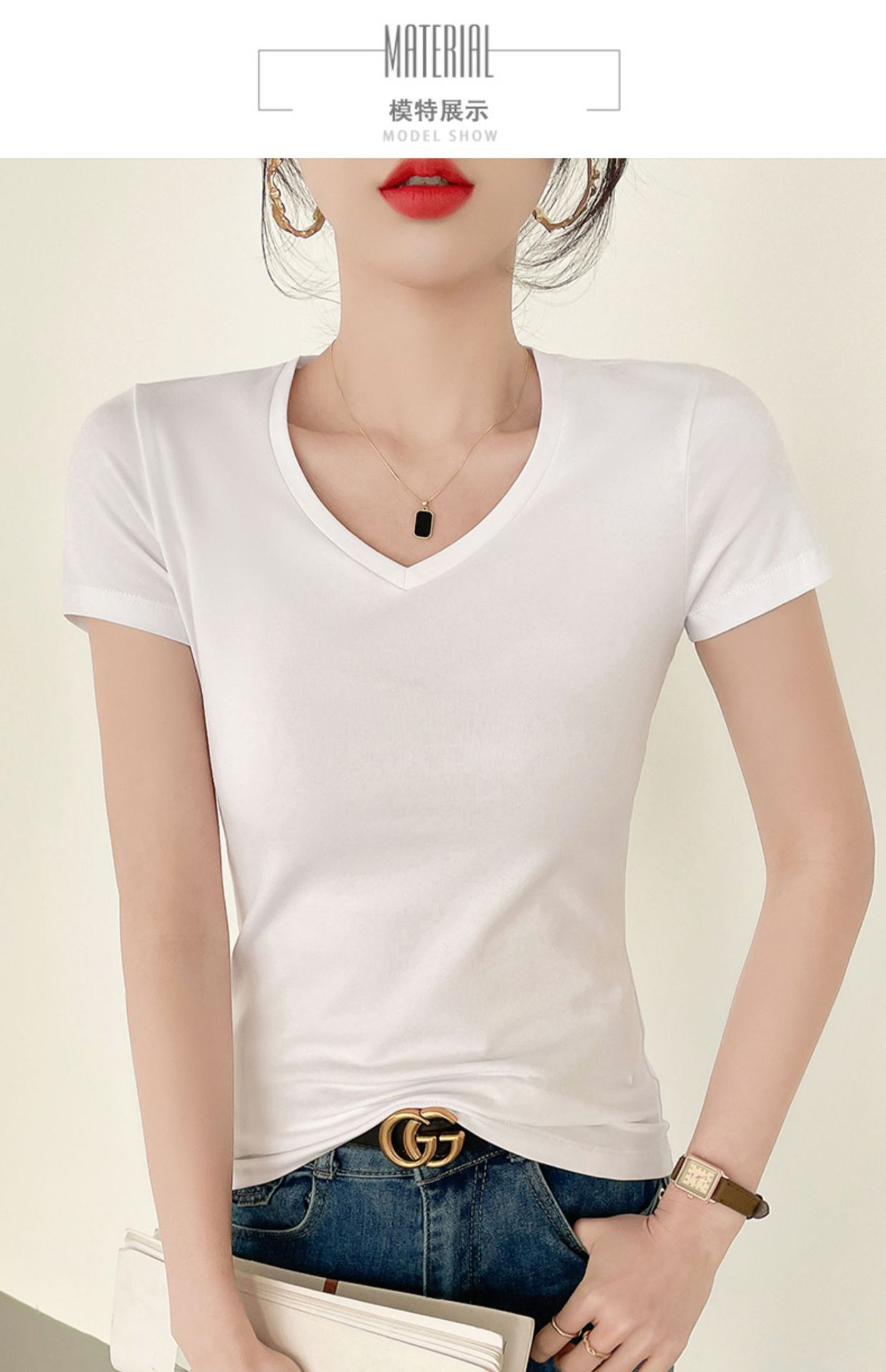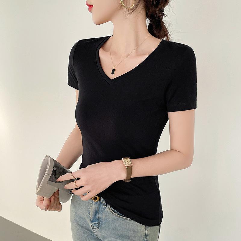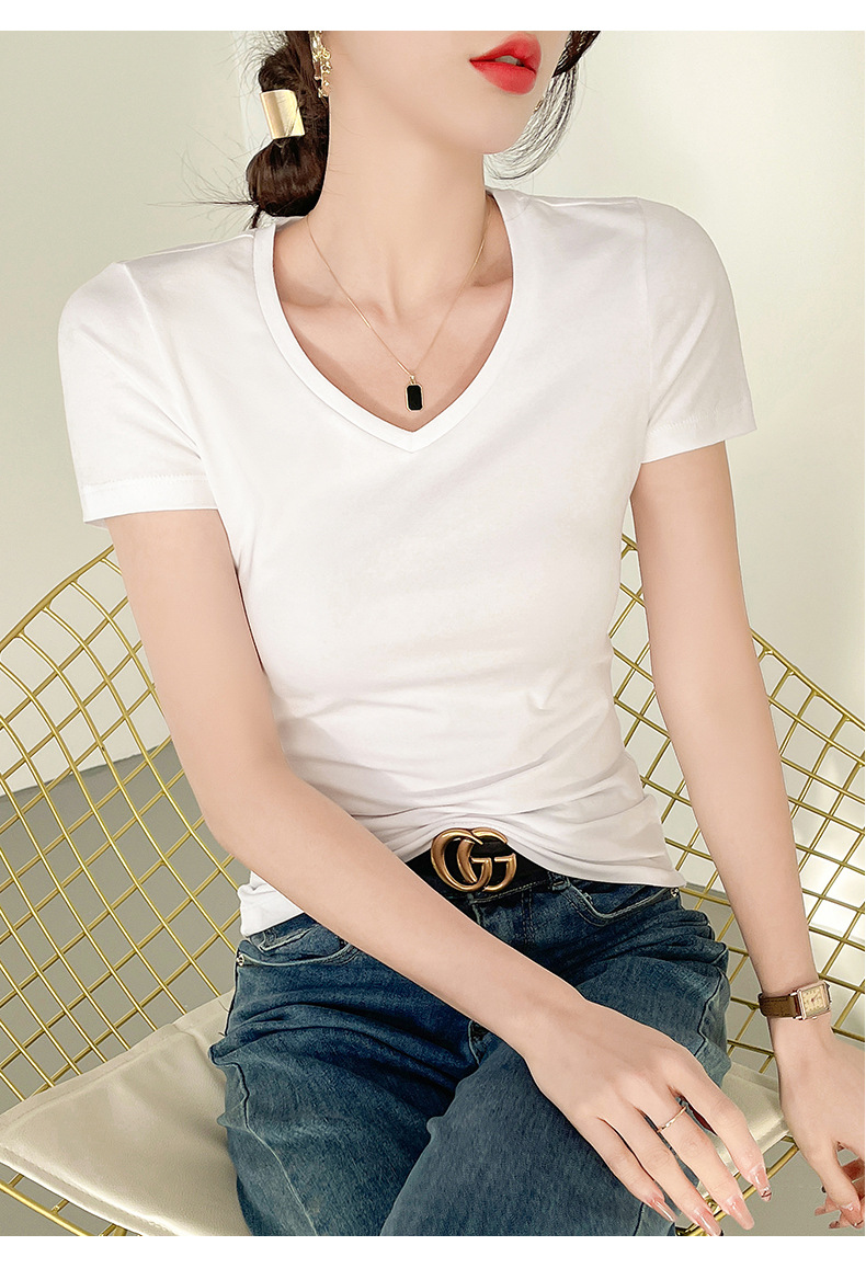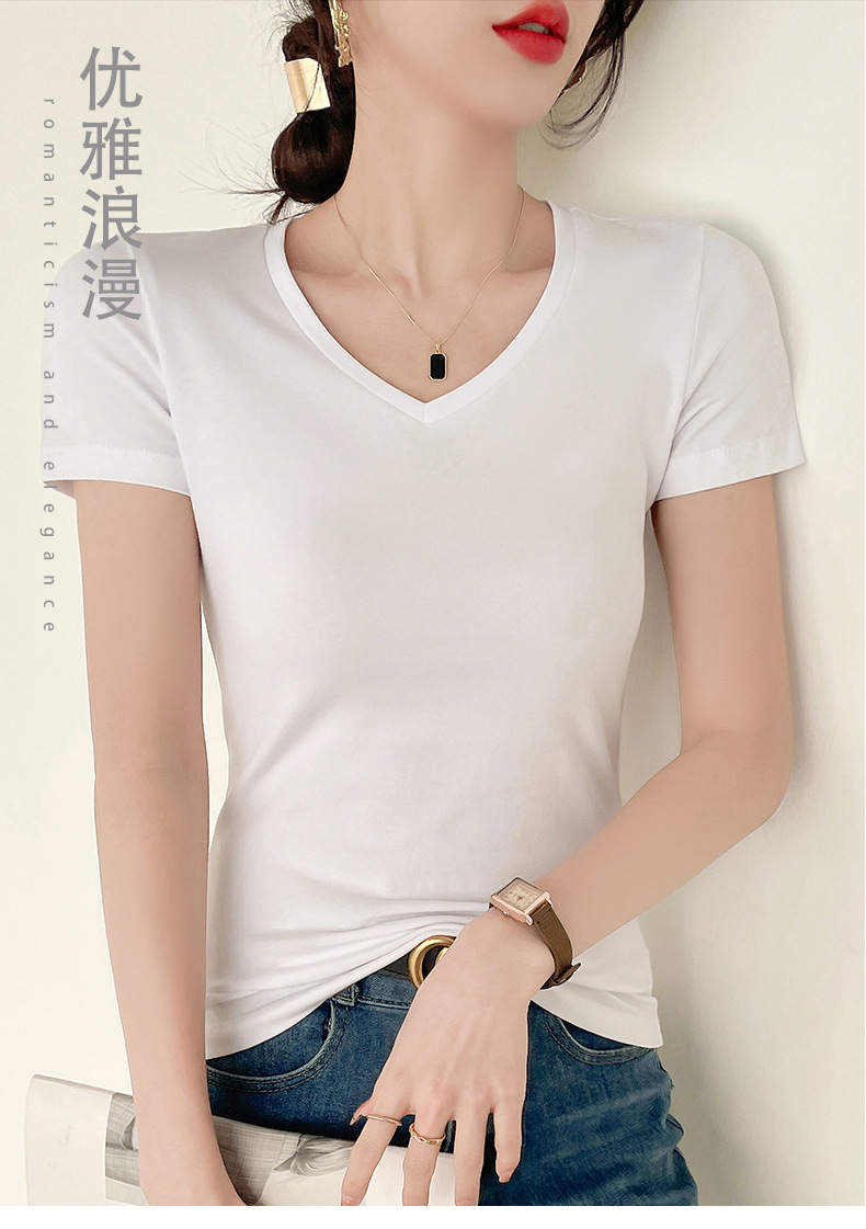 코튼 화이트 슬림 핏 V 넥 반팔 티셔츠 여성용 2025 년 새 여름 꽉 끼는 슬림 핏 치킨 칼라 탑스토어 가기