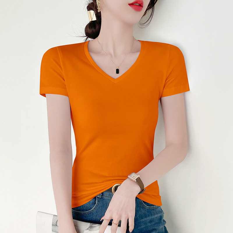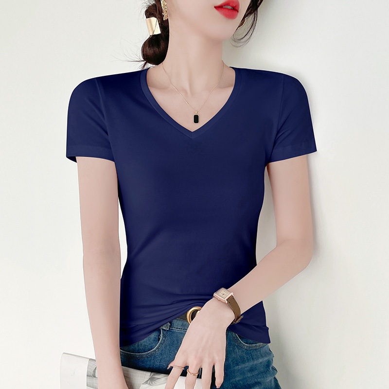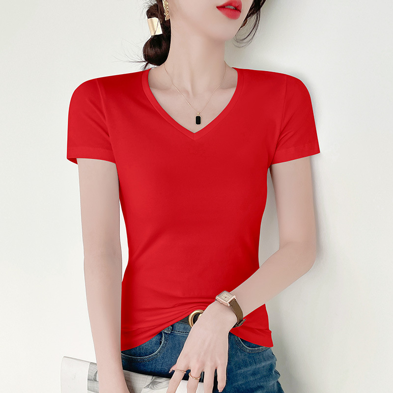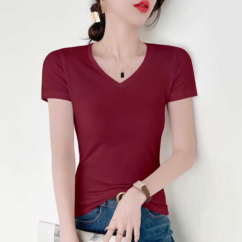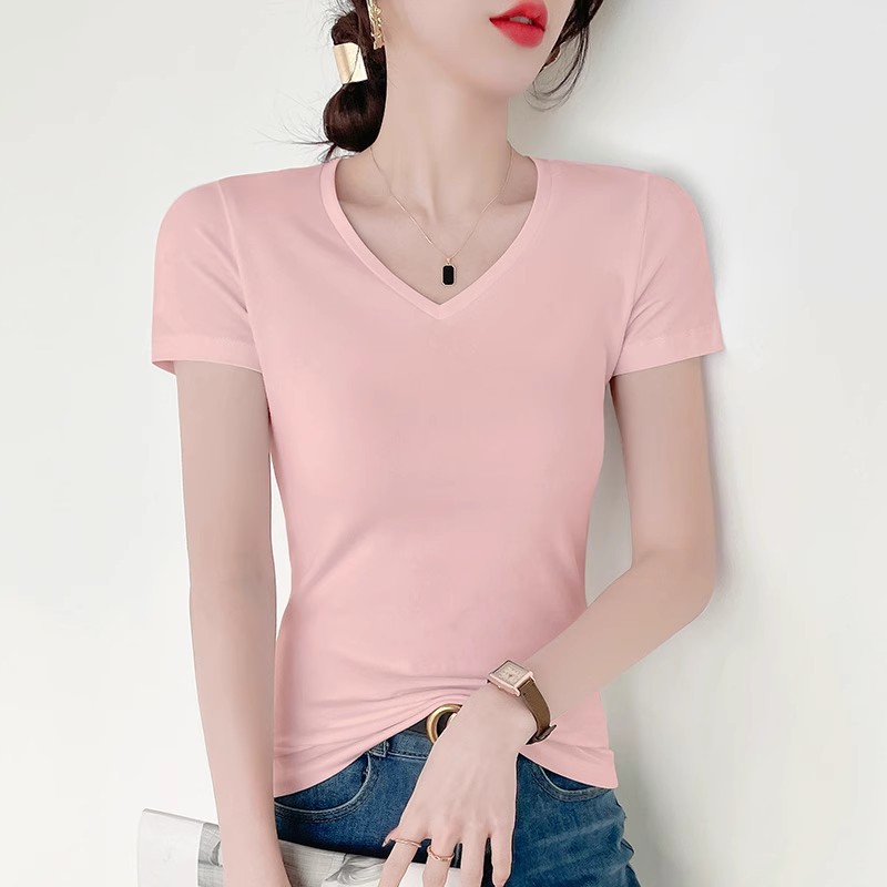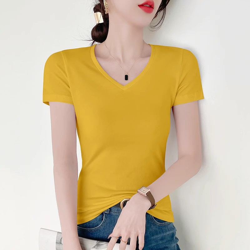 코튼 화이트 슬림 핏 V 넥 반팔 티셔츠 여성용 2025 년 새 여름 꽉 끼는 슬림 핏 치킨 칼라 탑스토어 가기