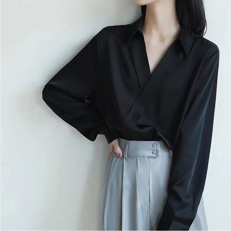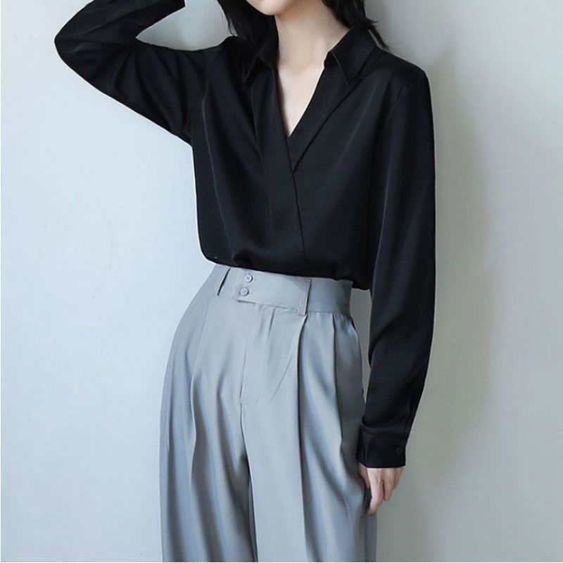 프렌치 쉬폰 브이넥 블랙 셔츠 여성용 디자인 센스 주의 봄과 가을 느슨한 슬리밍 우아한 긴팔 셔츠스토어 가기