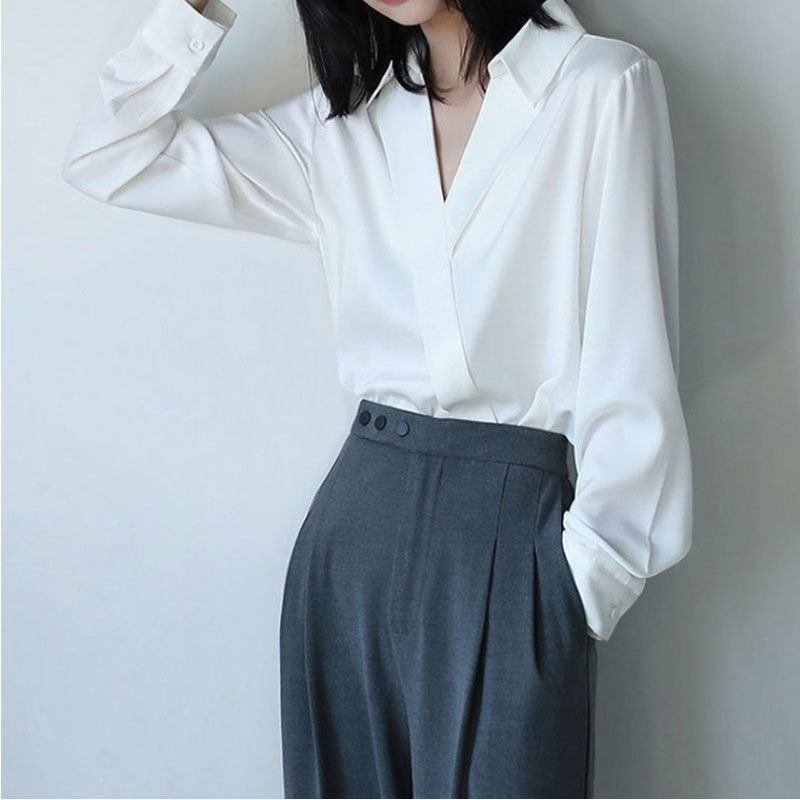 프렌치 쉬폰 브이넥 블랙 셔츠 여성용 디자인 센스 주의 봄과 가을 느슨한 슬리밍 우아한 긴팔 셔츠