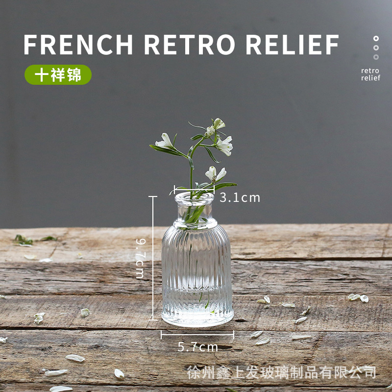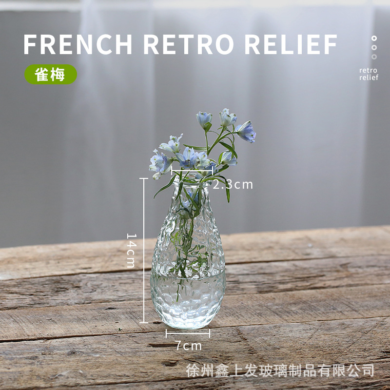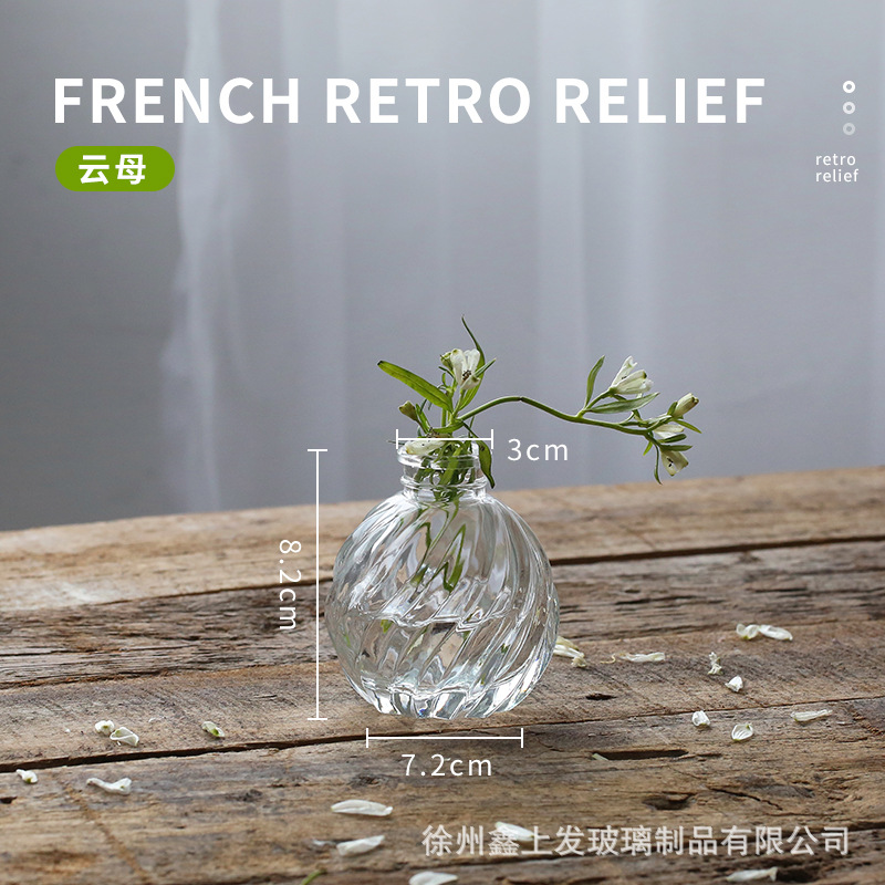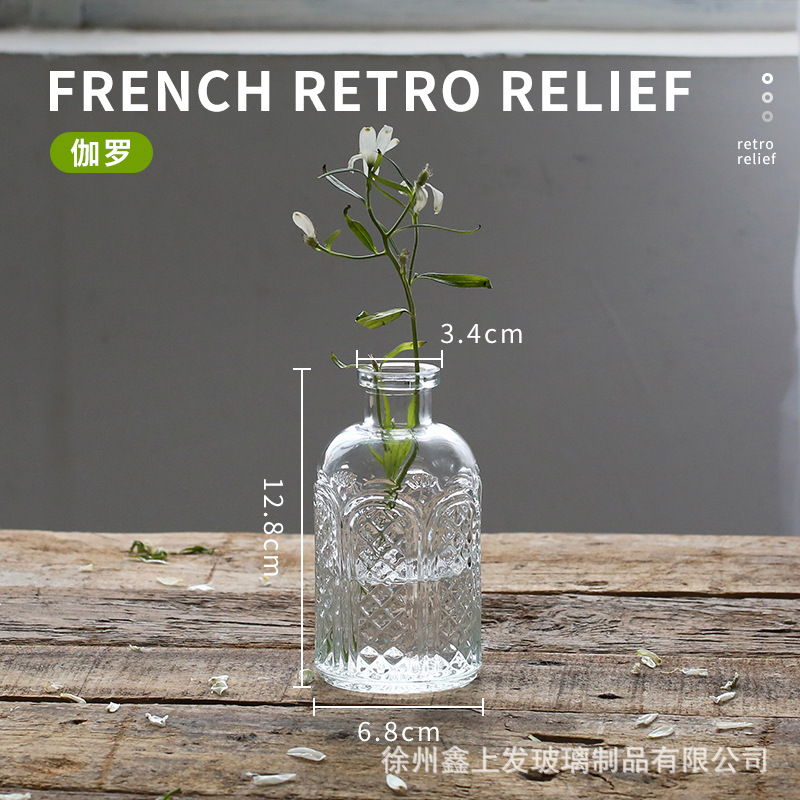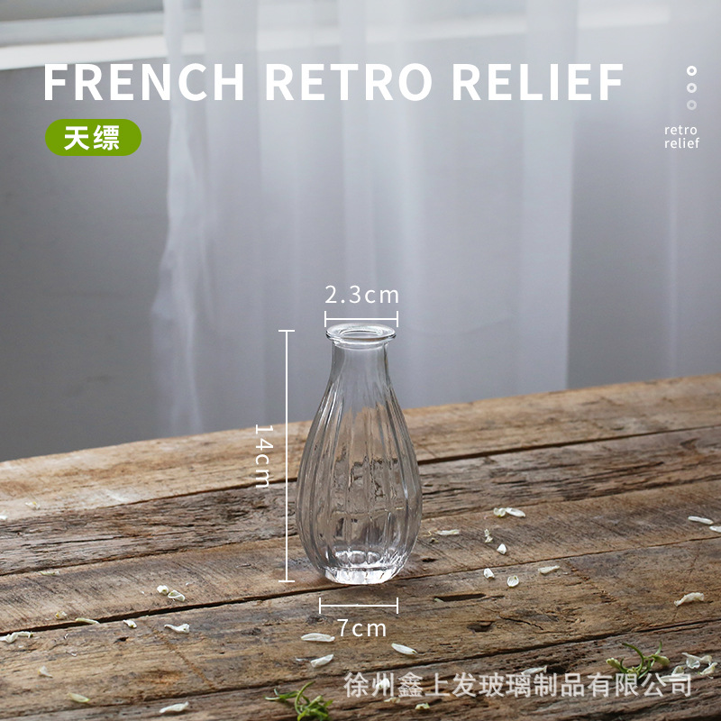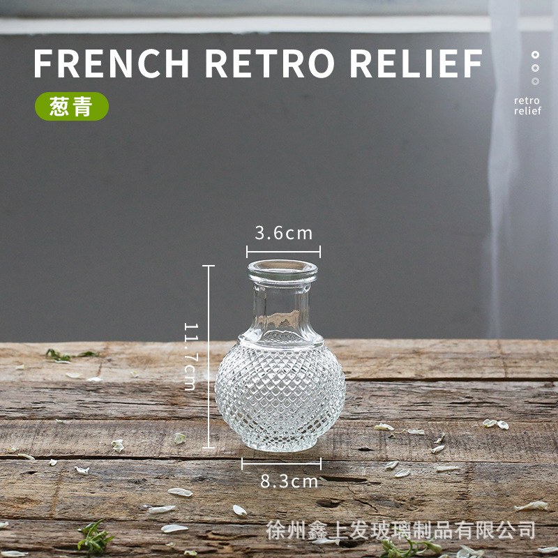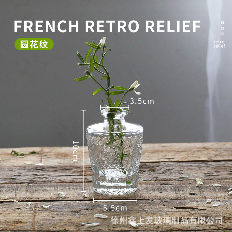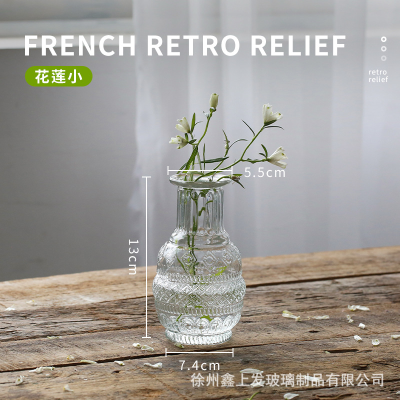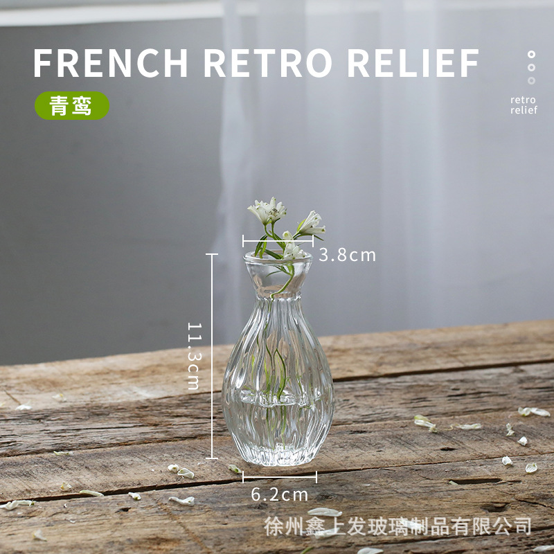 프랑스 복고풍 양각 유리 스타일 미니 작은 꽃병 투명 수경 꽃병 데스크탑 장식 장식품