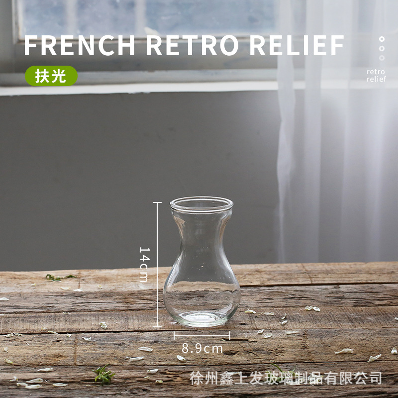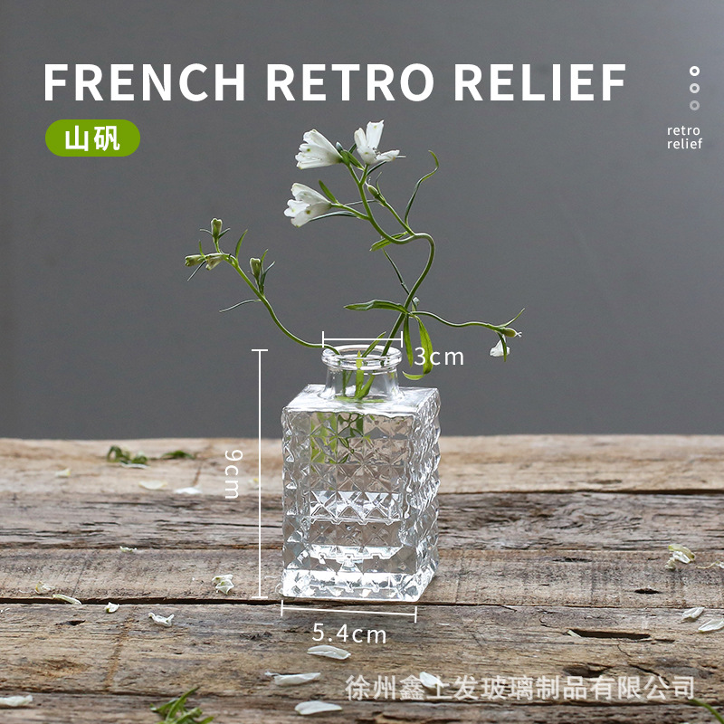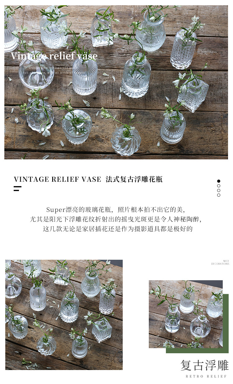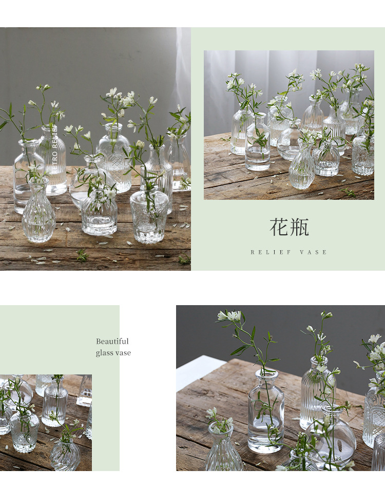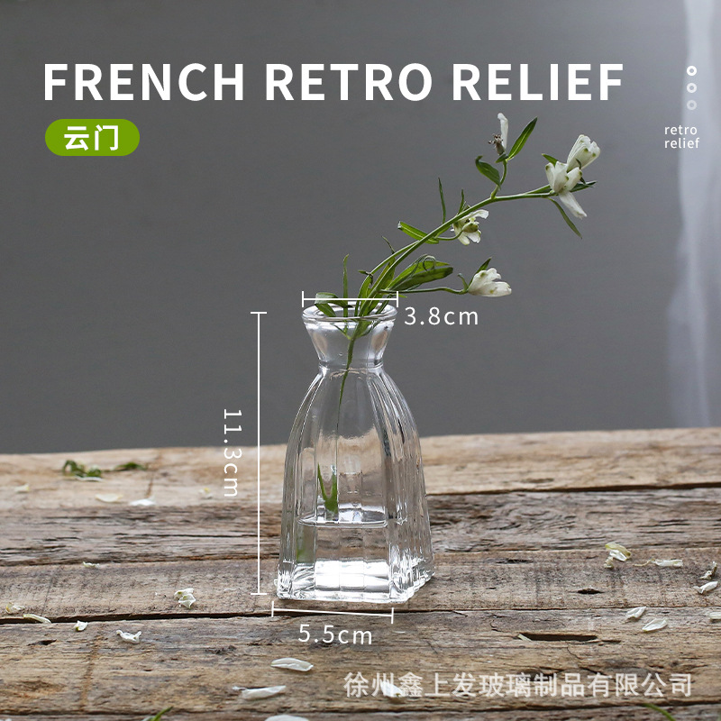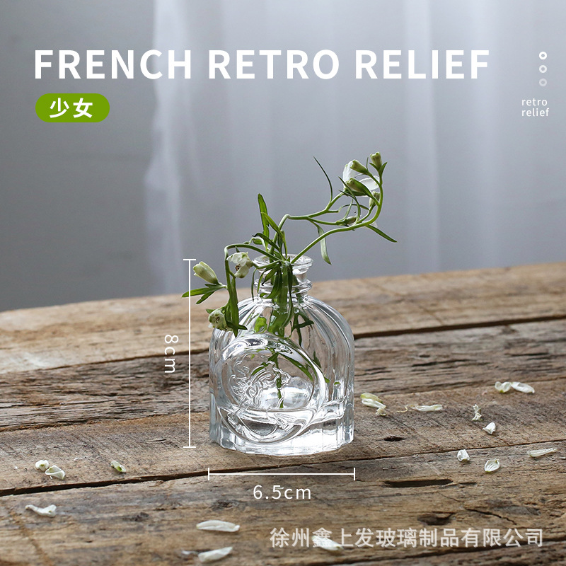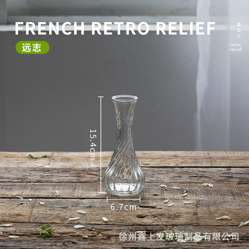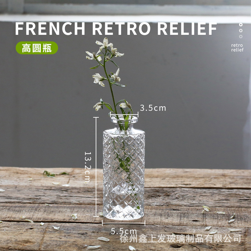 프랑스 복고풍 양각 유리 스타일 미니 작은 꽃병 투명 수경 꽃병 데스크탑 장식 장식품
