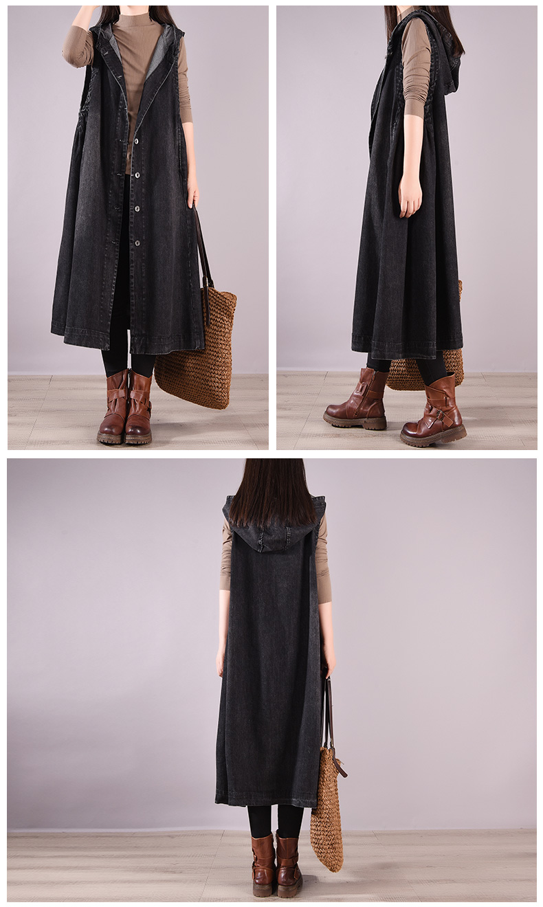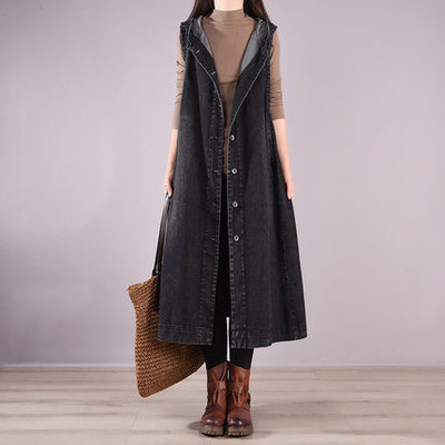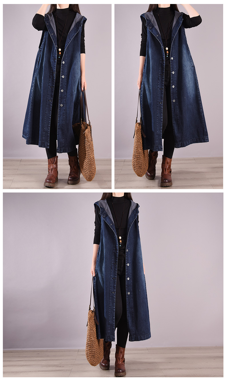 2022 봄 새로운 플러스 사이즈 여자의 느슨한 긴 외부 싱글 브레스트 데님 민소매 후드 조끼스토어 가기