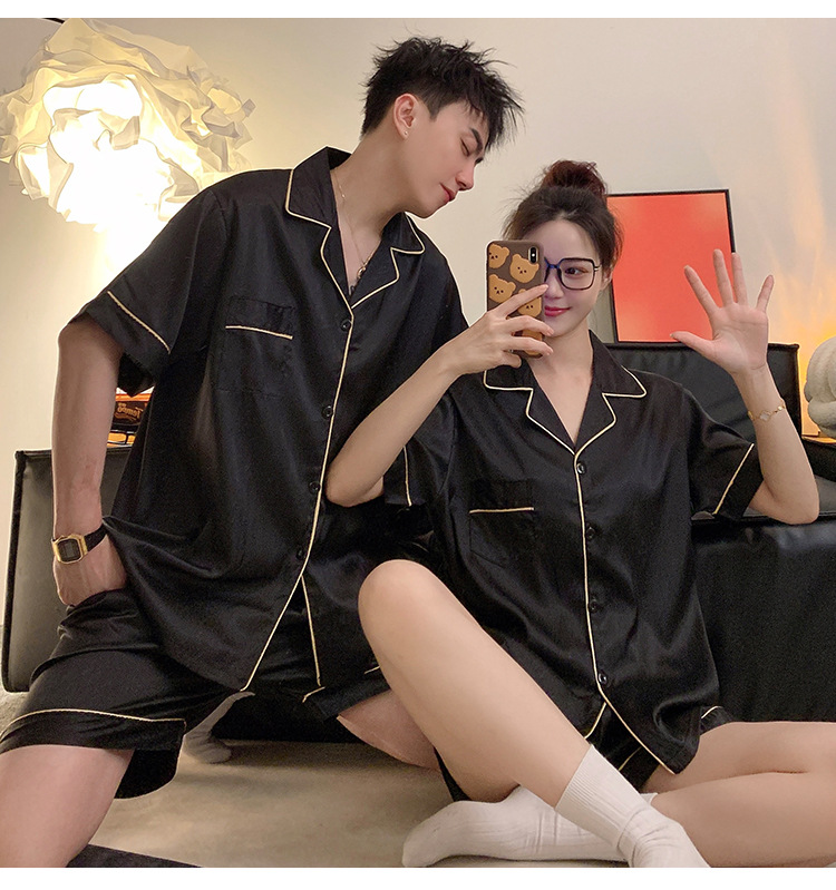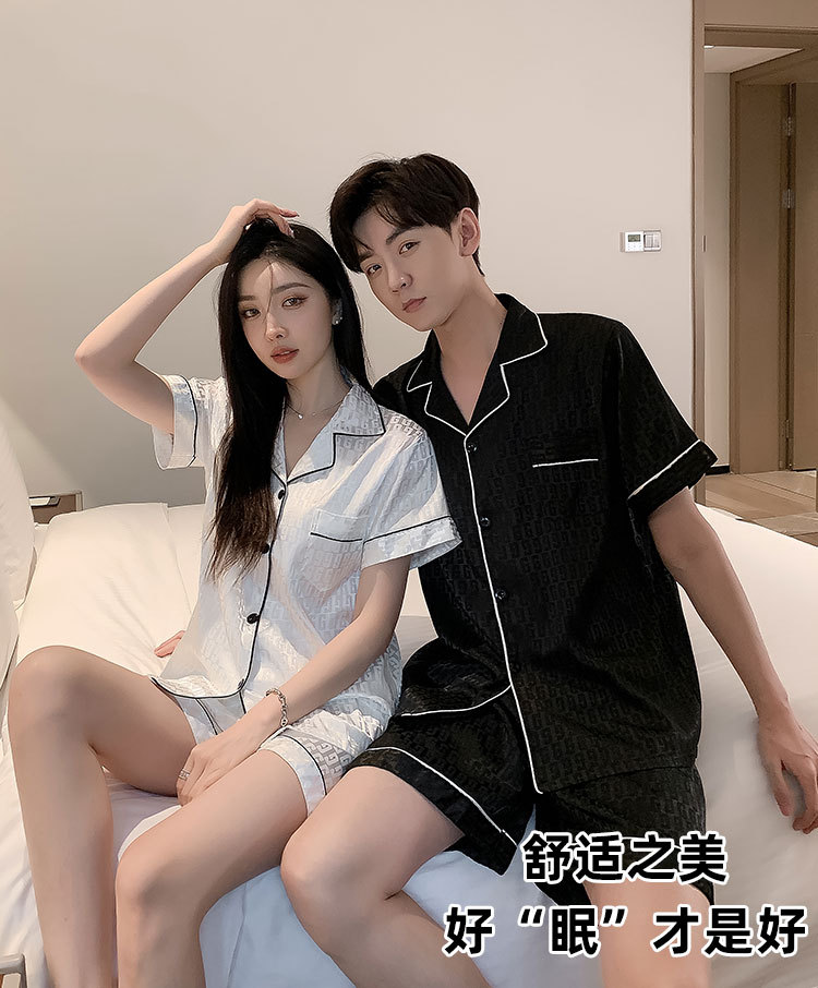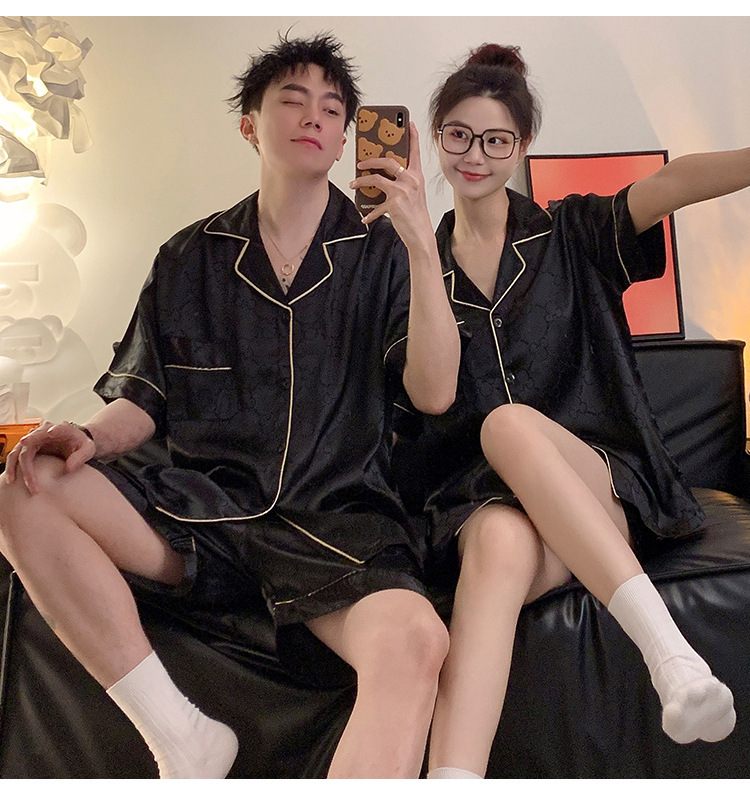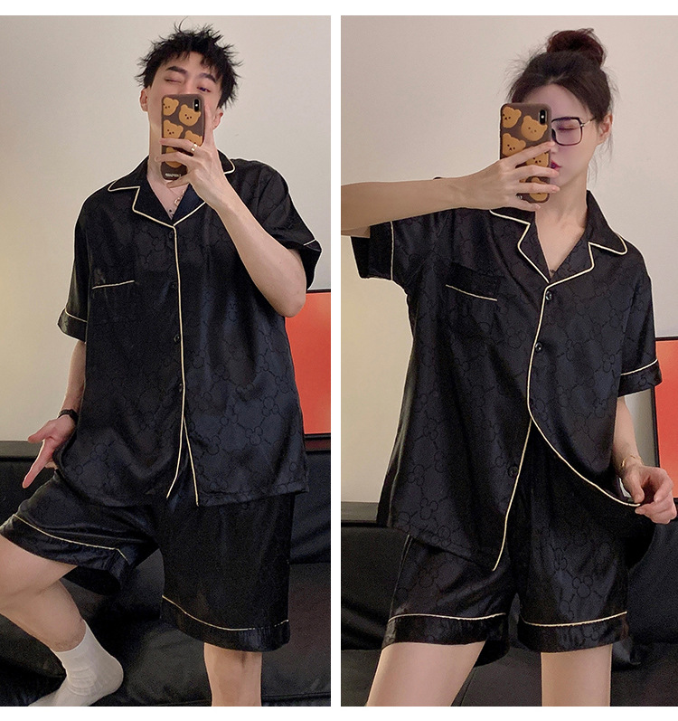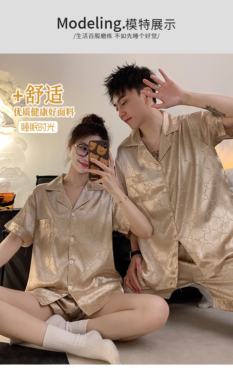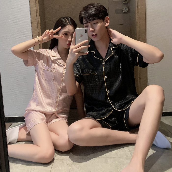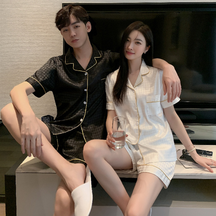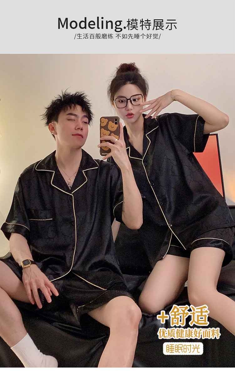 커플 잠옷 여성용 여름 아이스 실크 반팔 2024 신상 여름 남성용 실크 플러스 사이즈 홈웨어 세트