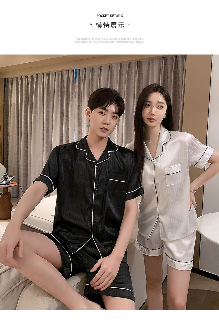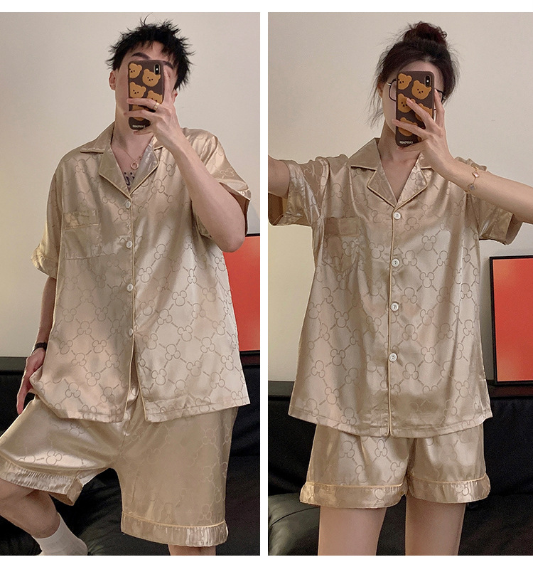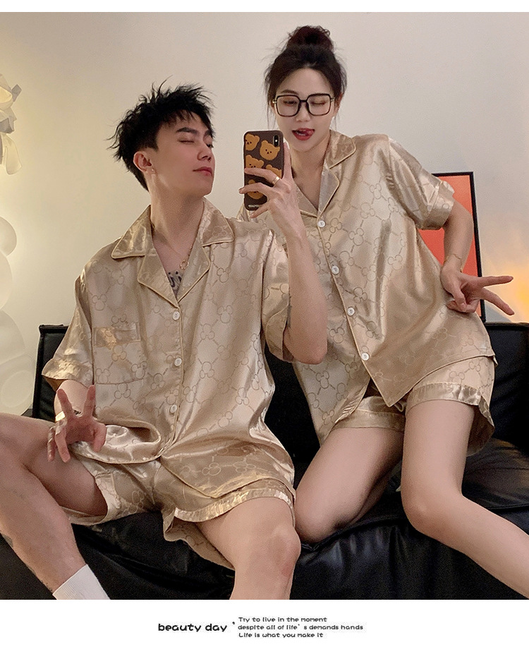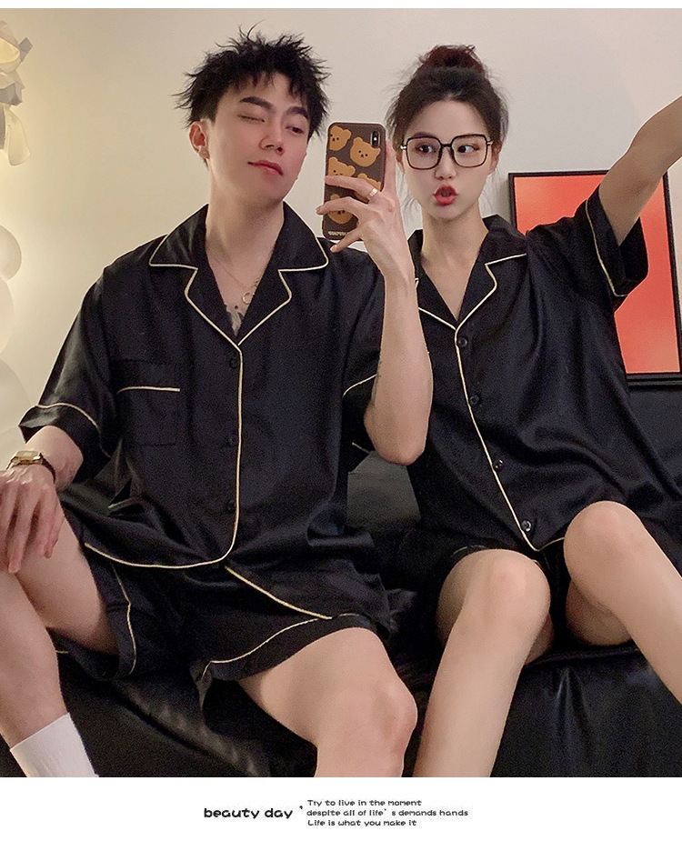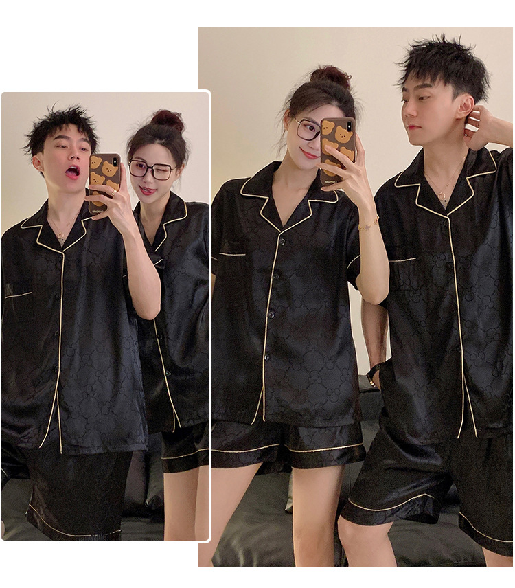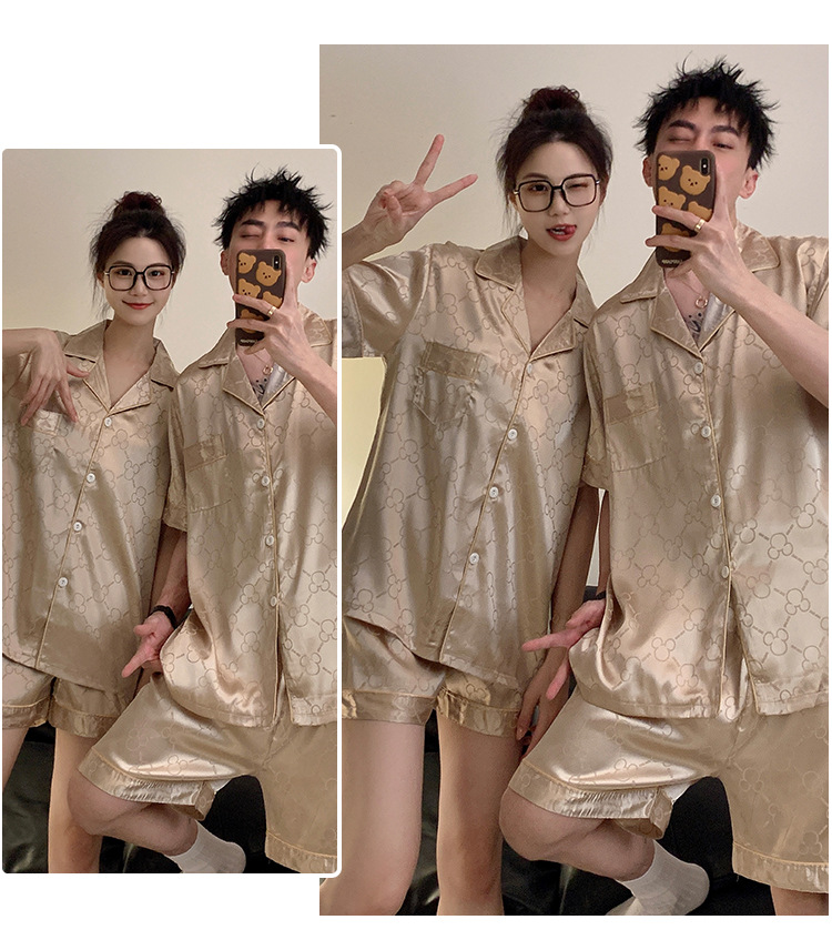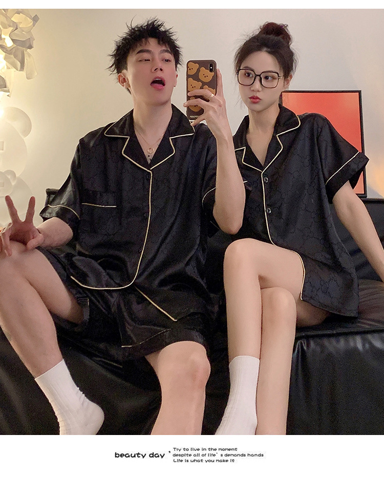 커플 잠옷 여성용 여름 아이스 실크 반팔 2024 신상 여름 남성용 실크 플러스 사이즈 홈웨어 세트