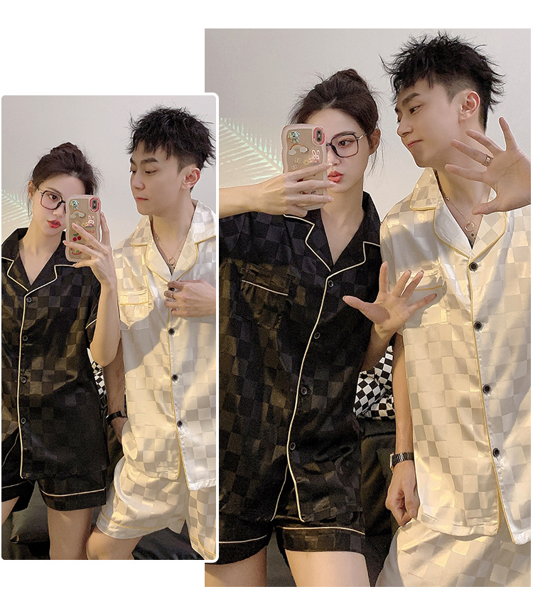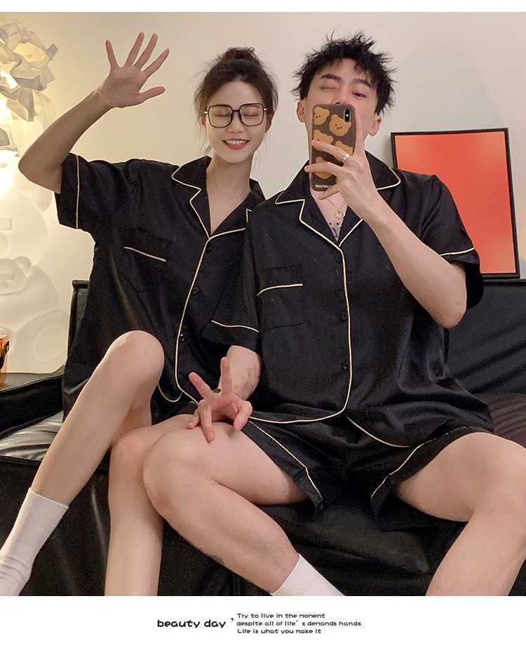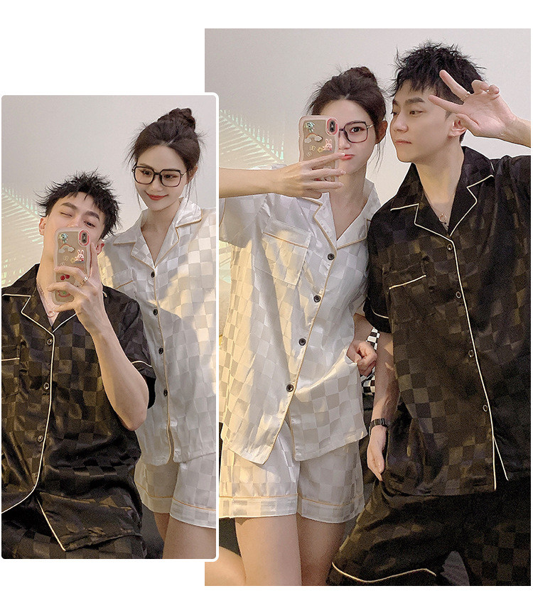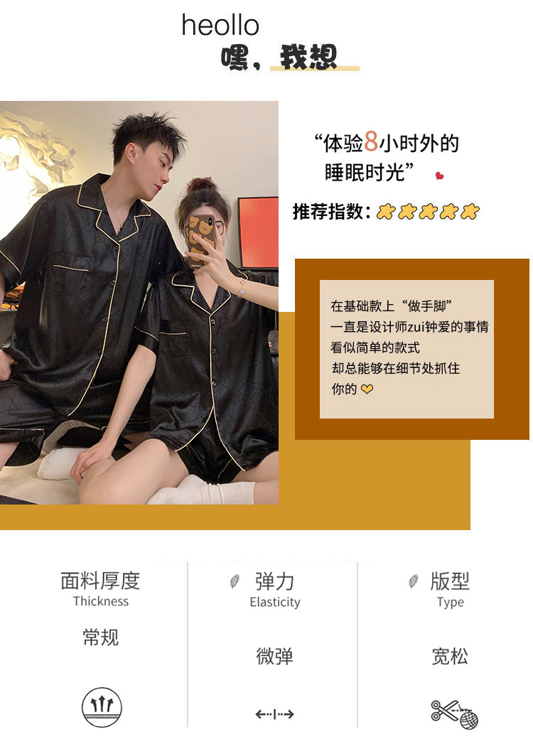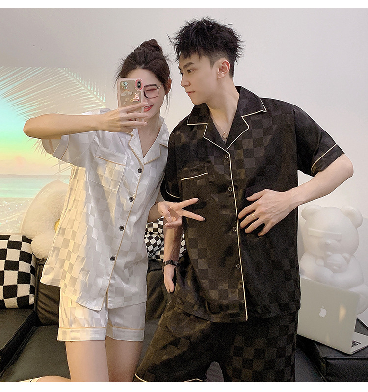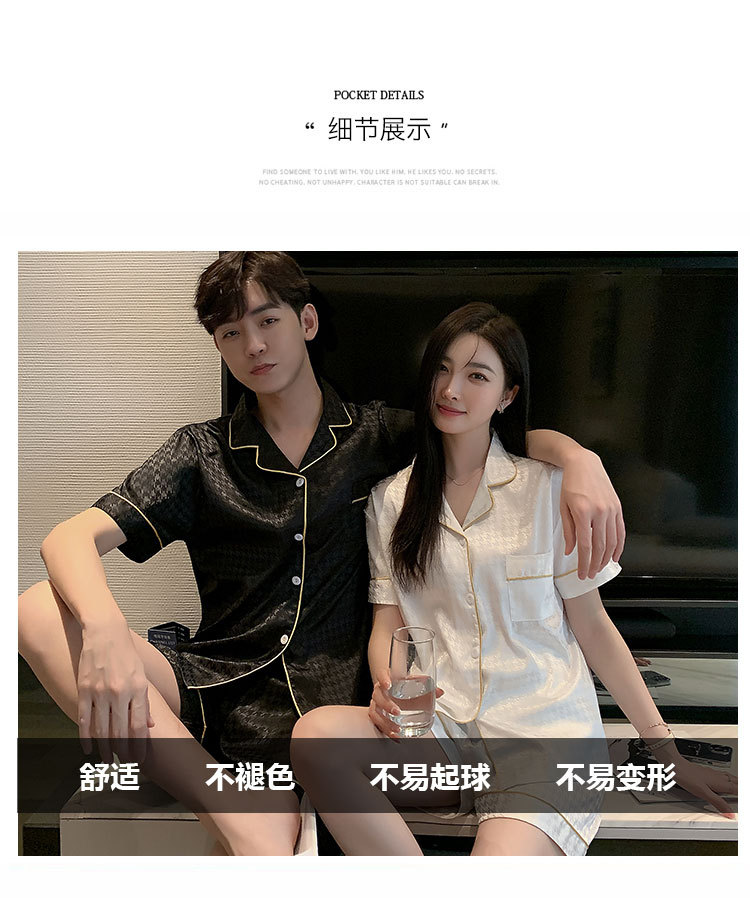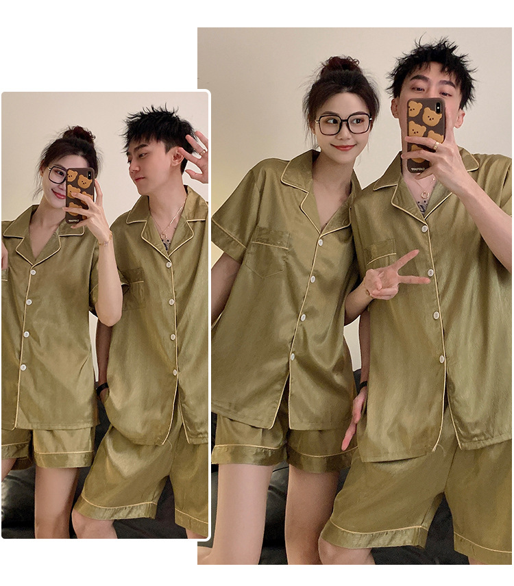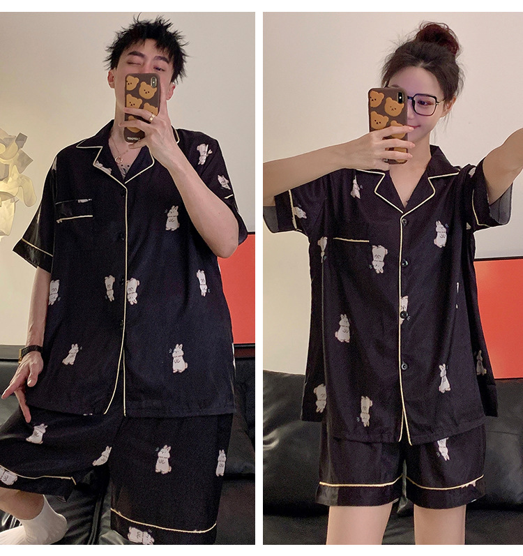 커플 잠옷 여성용 여름 아이스 실크 반팔 2024 신상 여름 남성용 실크 플러스 사이즈 홈웨어 세트