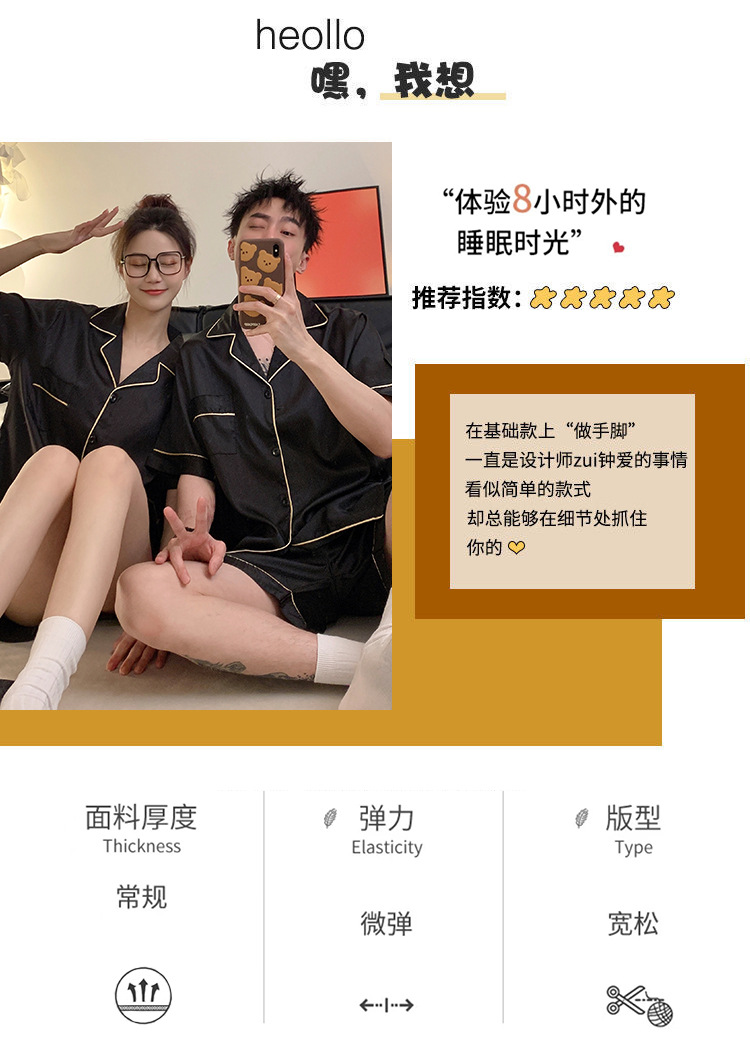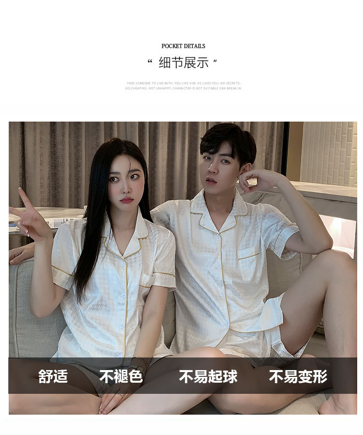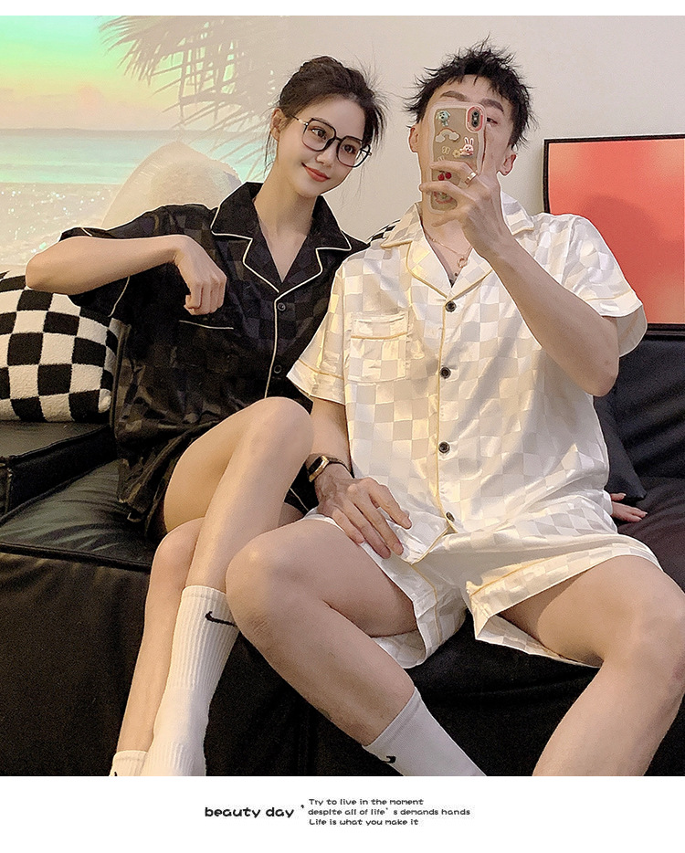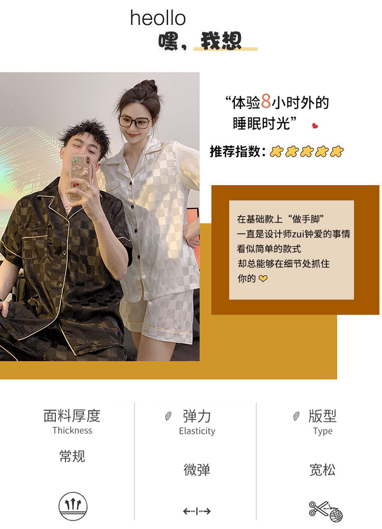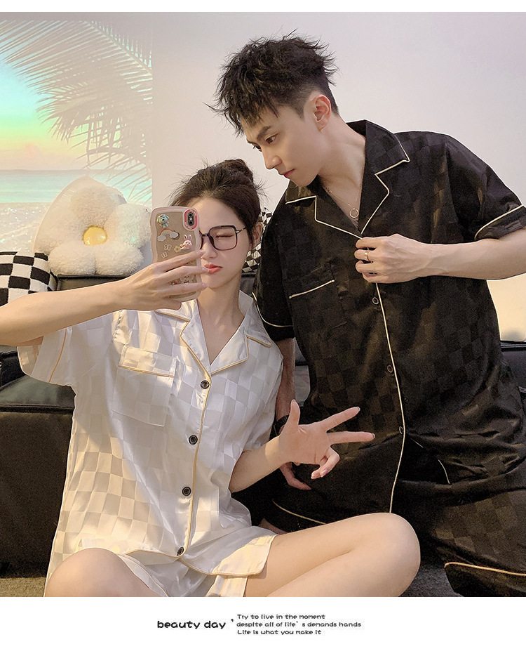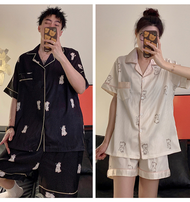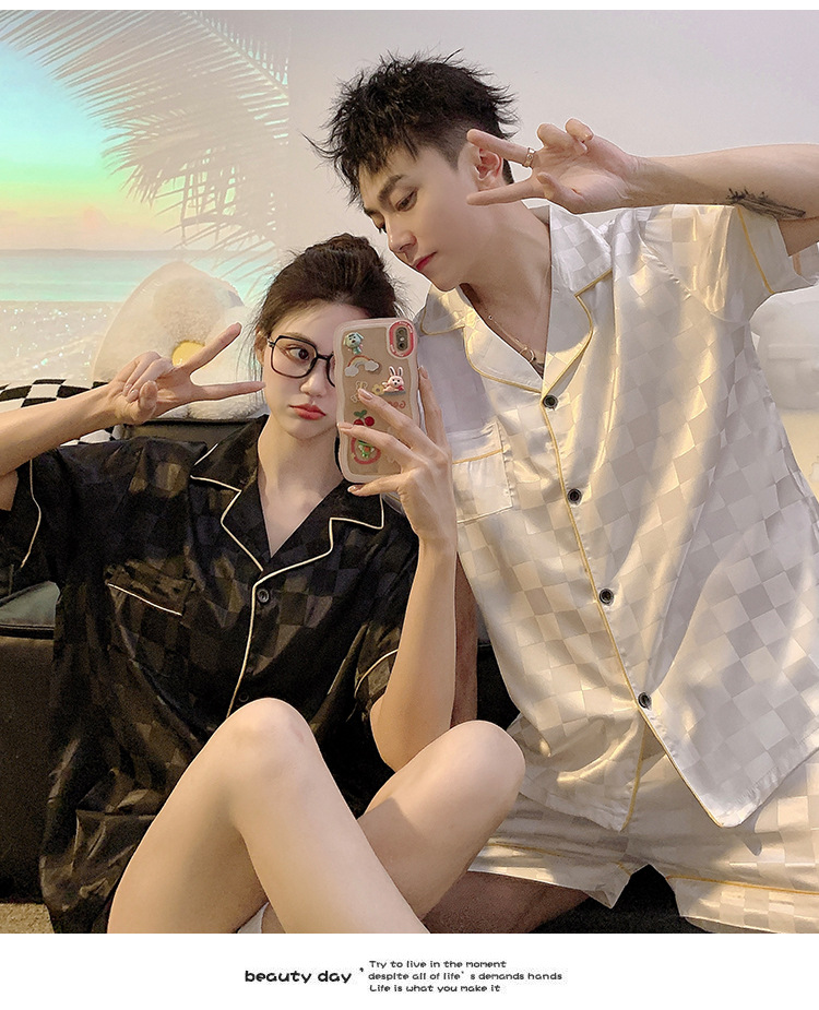 커플 잠옷 여성용 여름 아이스 실크 반팔 2024 신상 여름 남성용 실크 플러스 사이즈 홈웨어 세트
