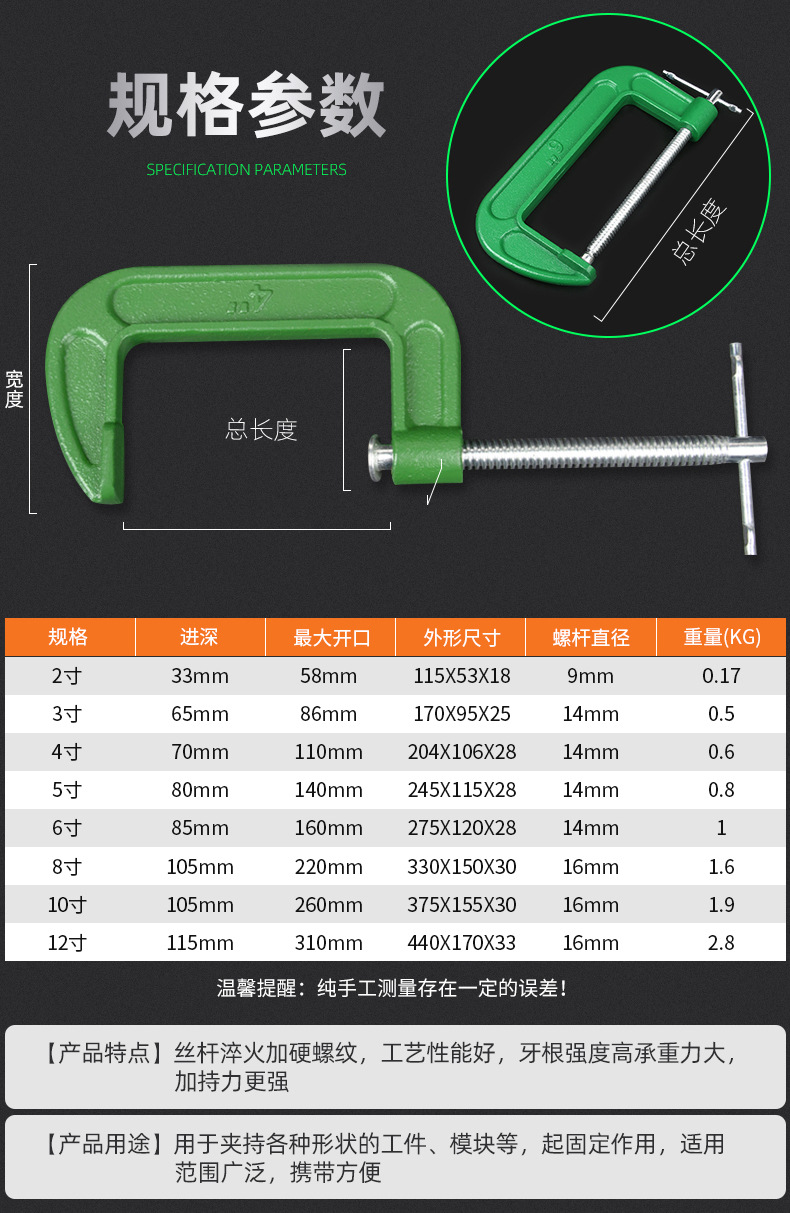 두꺼운 대형 금속 녹색 G 형 목공 클립 보편적 인 중장비 강한 빠른 고정 포지셔닝 목공 클립