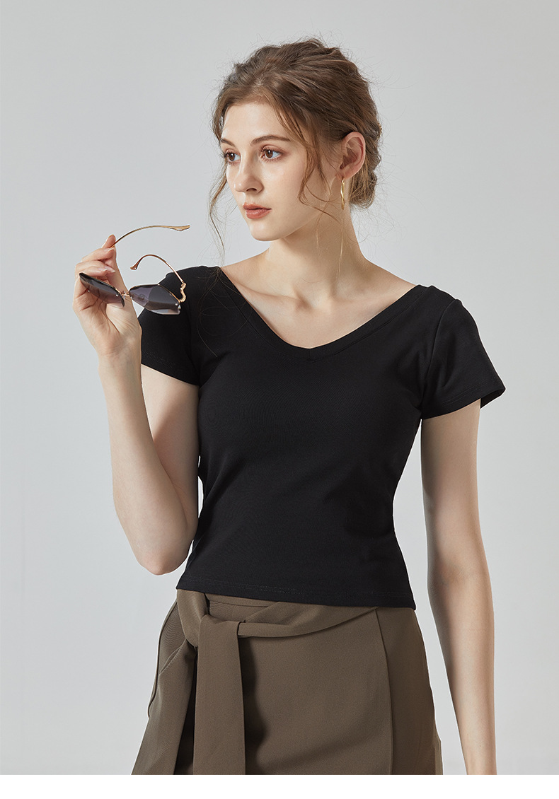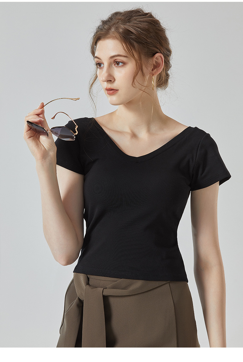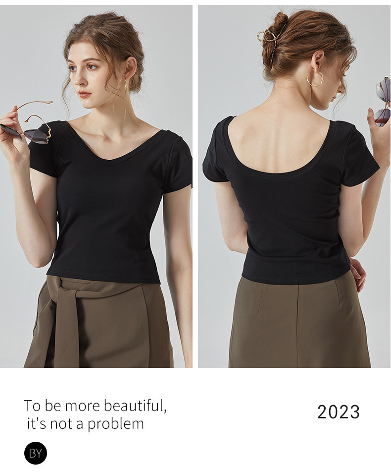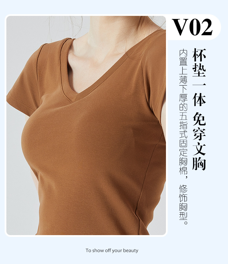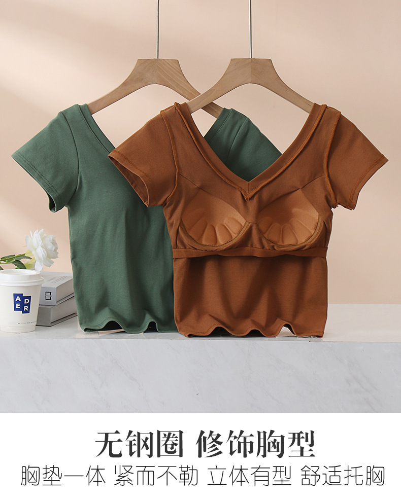 웨어 프리 브라 브이넥 반팔 티셔츠 여성용 퓨어 코튼 벨트 가슴 패드 컵 원피스 스몰 아름다운 등 슬림핏 여름 탑스토어 가기