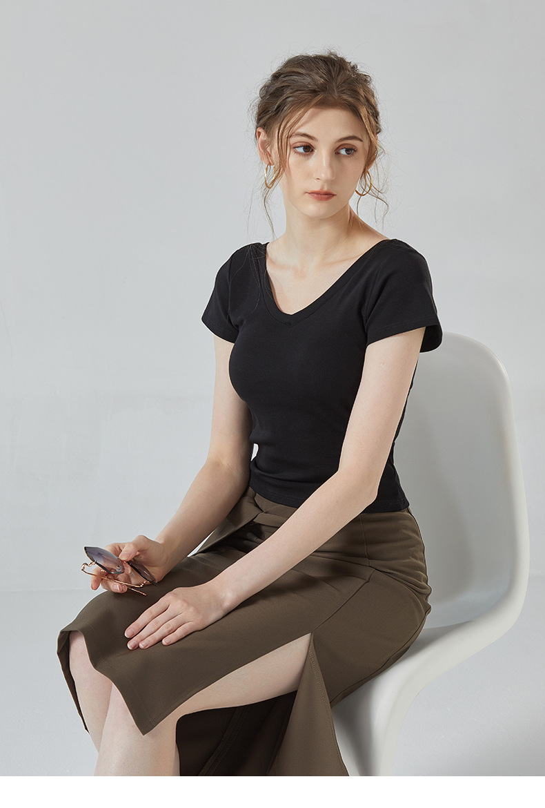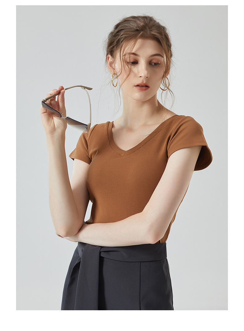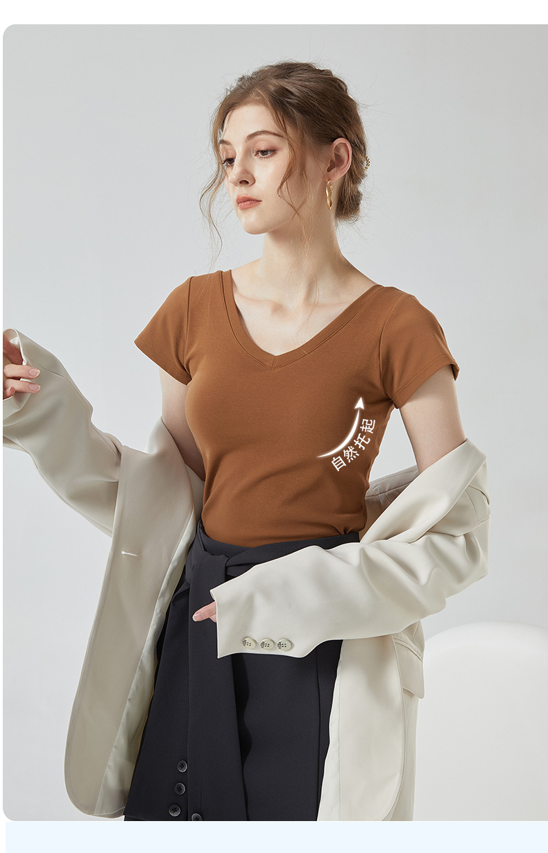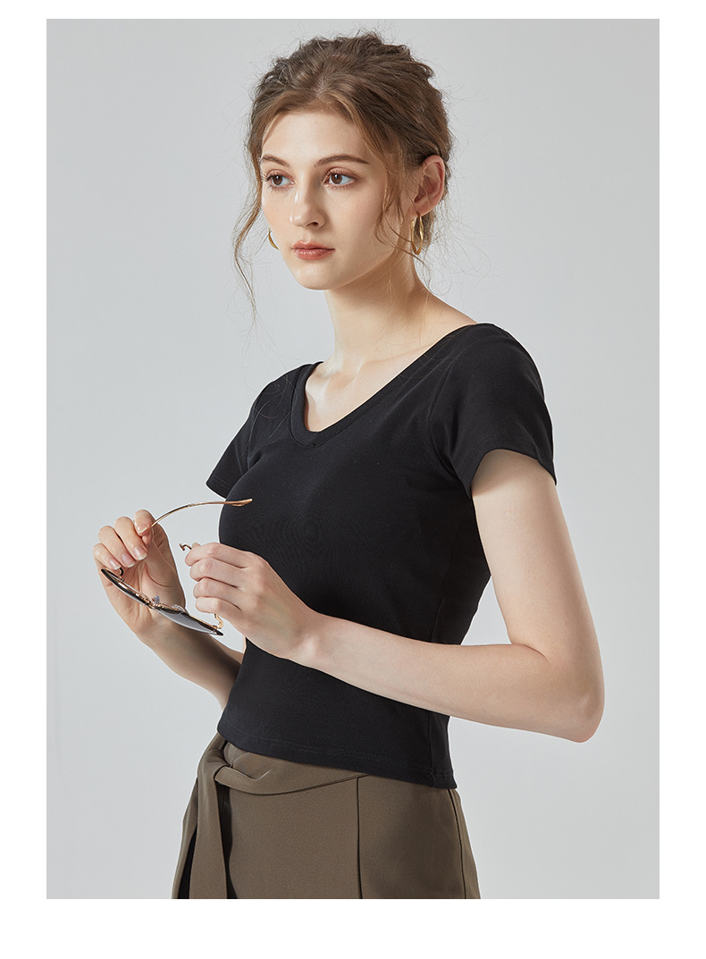웨어 프리 브라 브이넥 반팔 티셔츠 여성용 퓨어 코튼 벨트 가슴 패드 컵 원피스 스몰 아름다운 등 슬림핏 여름 탑스토어 가기