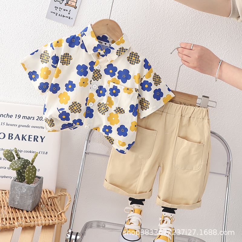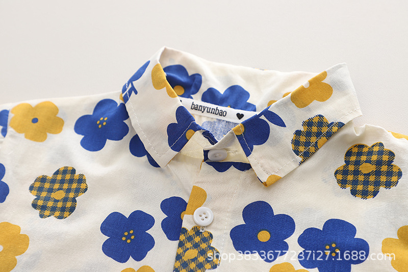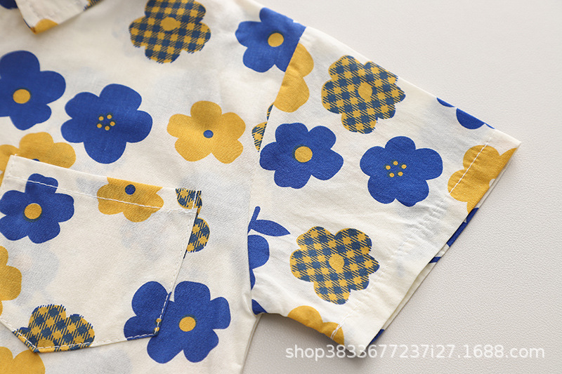 해바라기 반팔 세트 도매 아동 소년 소녀 전체 인쇄 옷깃 반팔 캐주얼 셔츠 아동 의류 투피스 세트스토어 가기