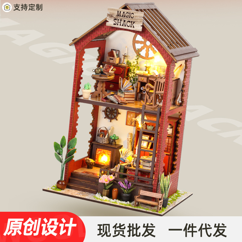 램프 창조적 인 선물 책 스탠드 장식품 손 조립 장난감이있는 국경 DIY 오두막 목조 빌라 미니어처 모델