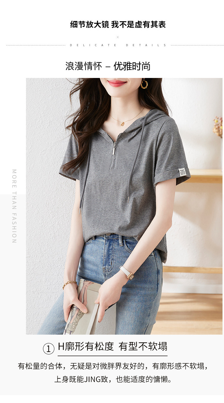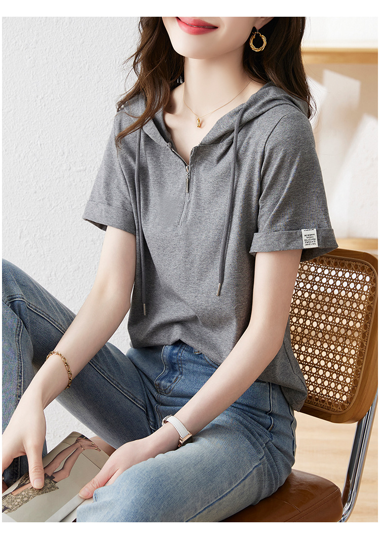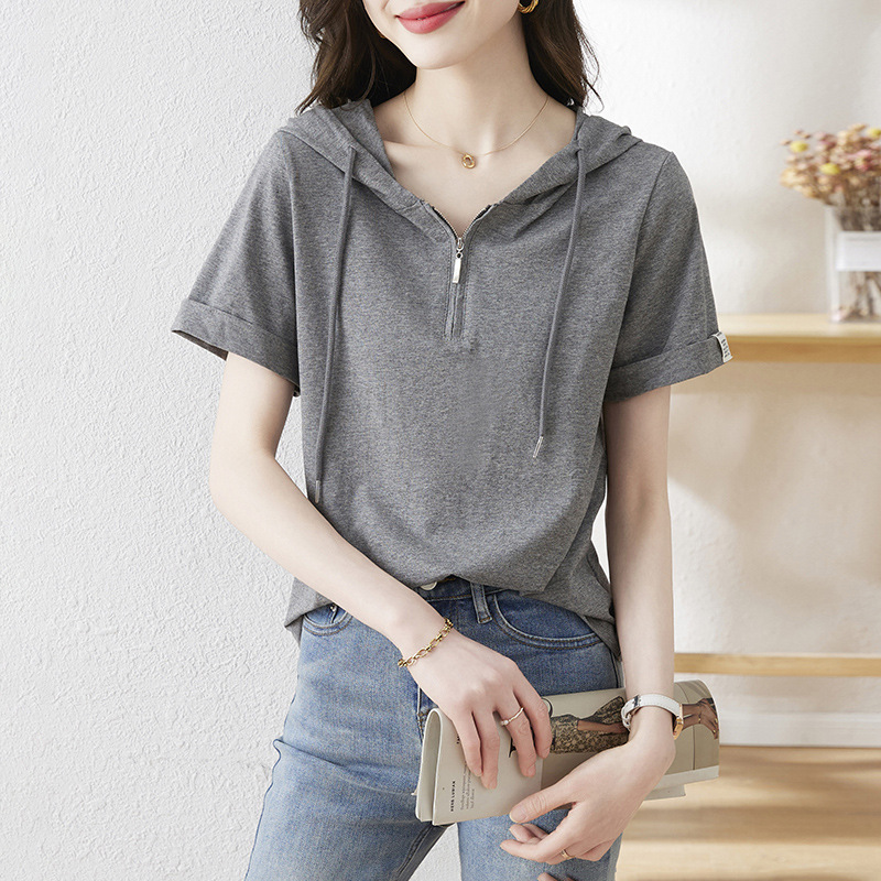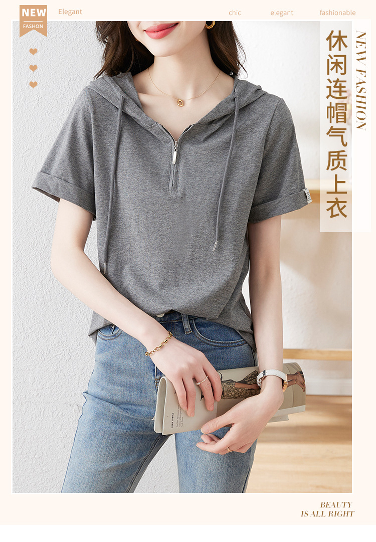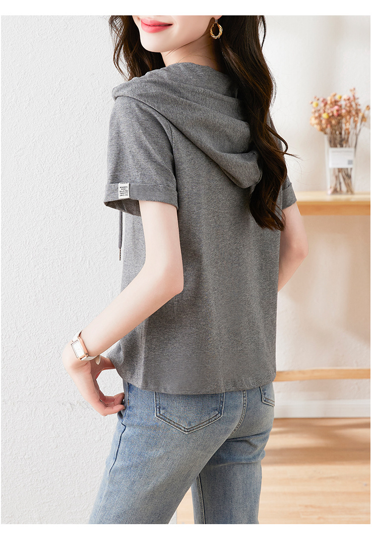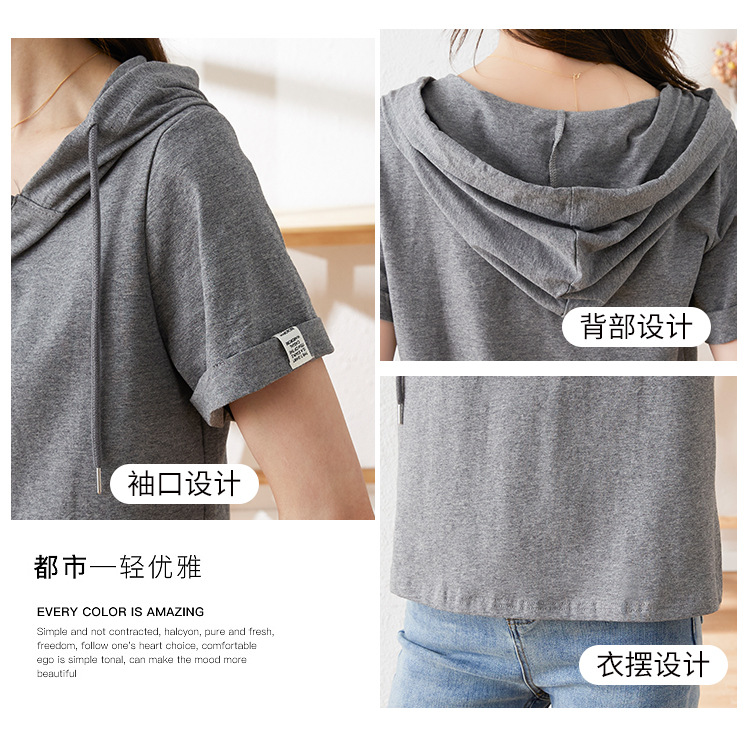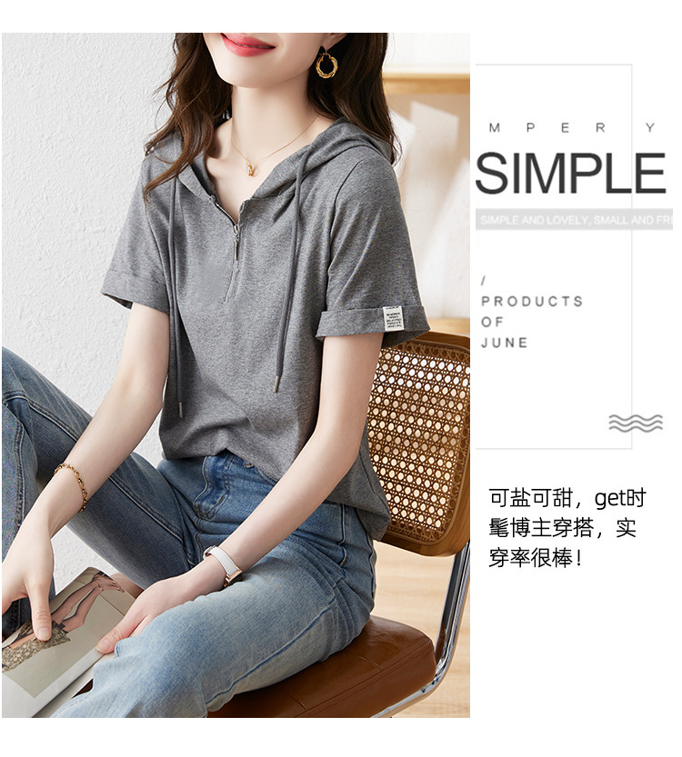 리얼 샷 스팟 캐주얼 후드 라벨 티셔츠 2023 여름 새로운 간단한 기질 올 매치 통기성 탑 여성