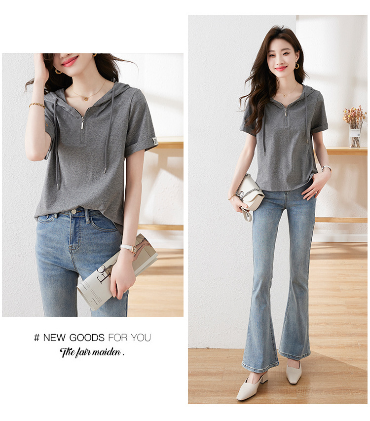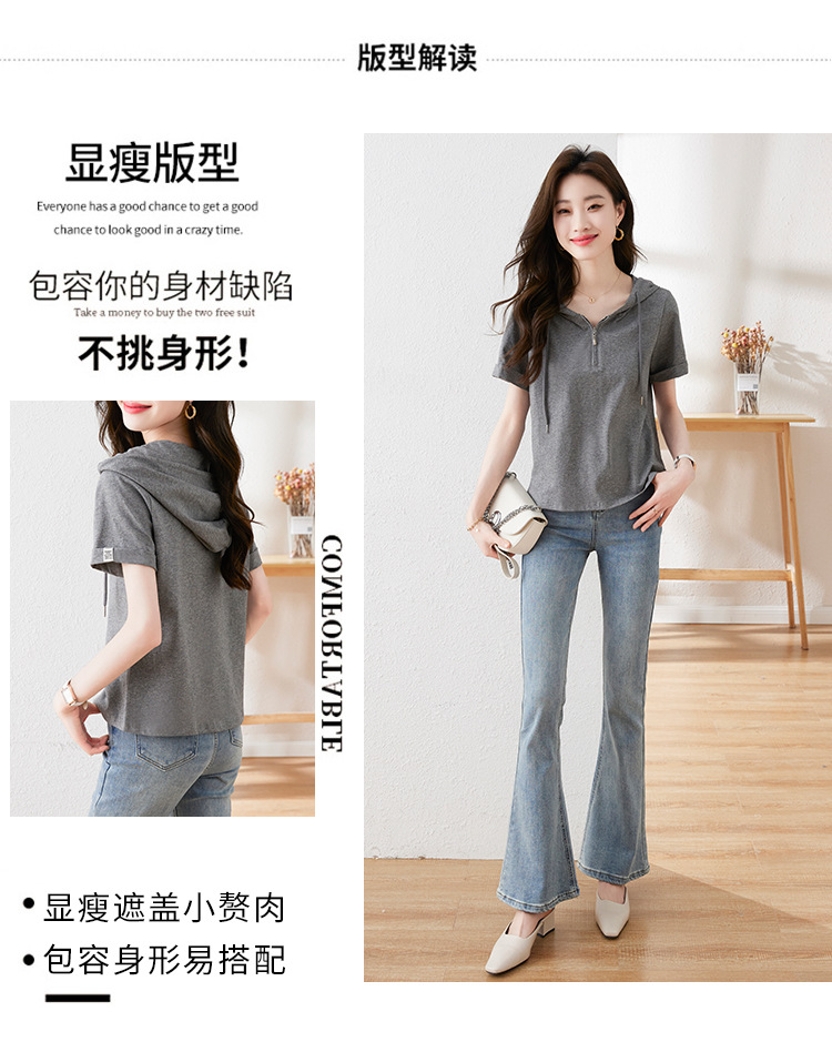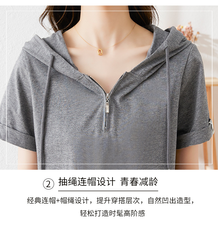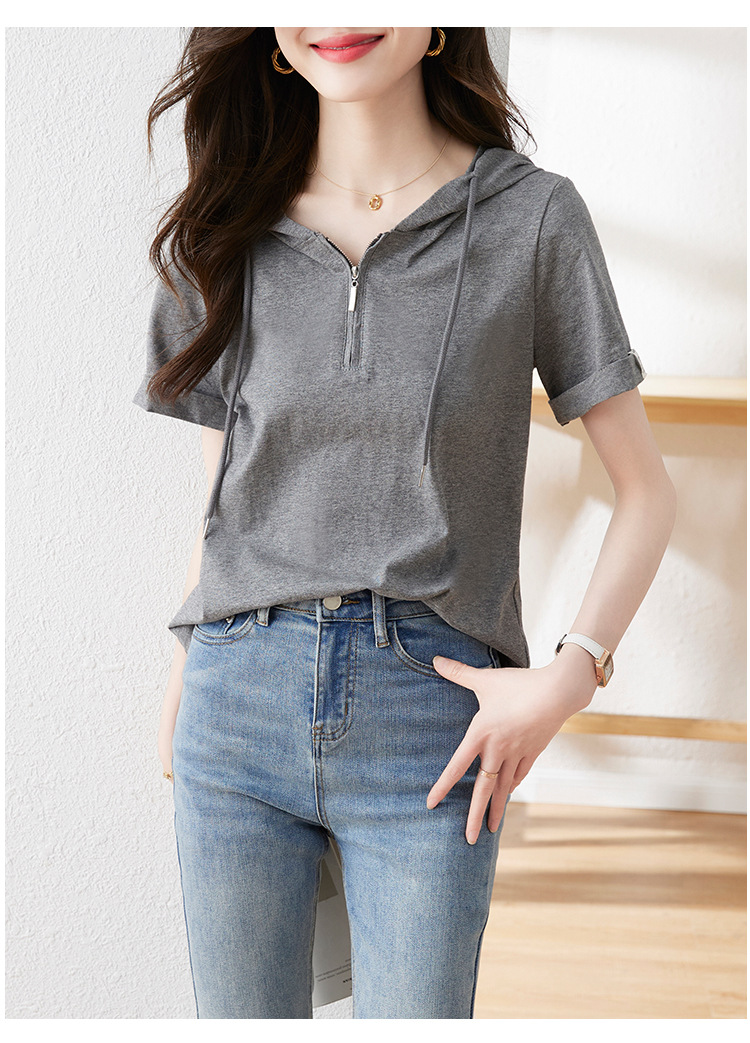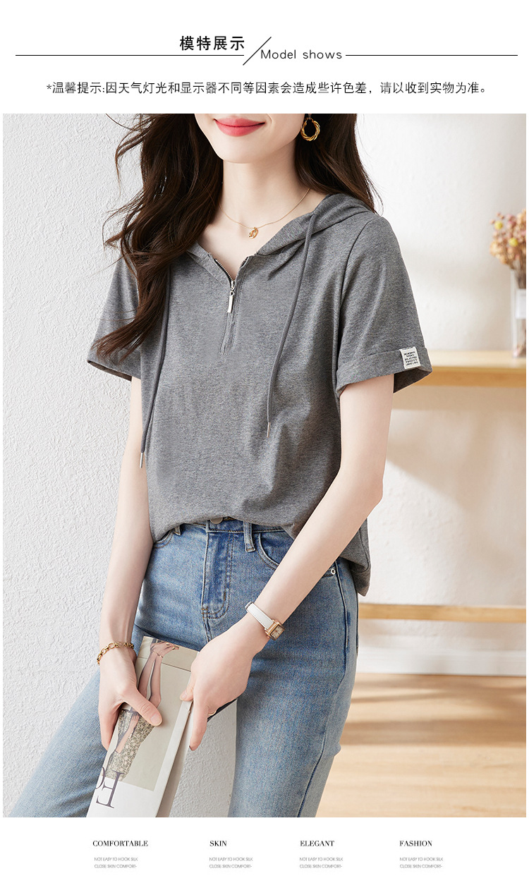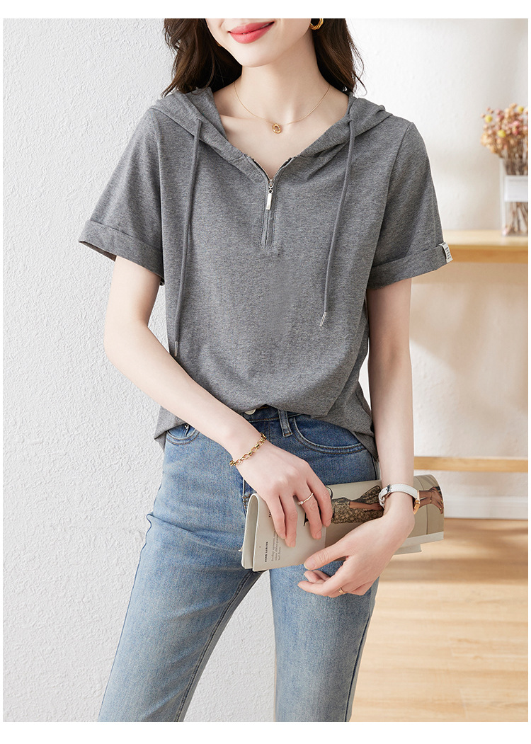 리얼 샷 스팟 캐주얼 후드 라벨 티셔츠 2023 여름 새로운 간단한 기질 올 매치 통기성 탑 여성