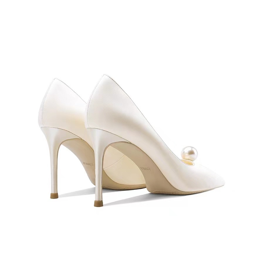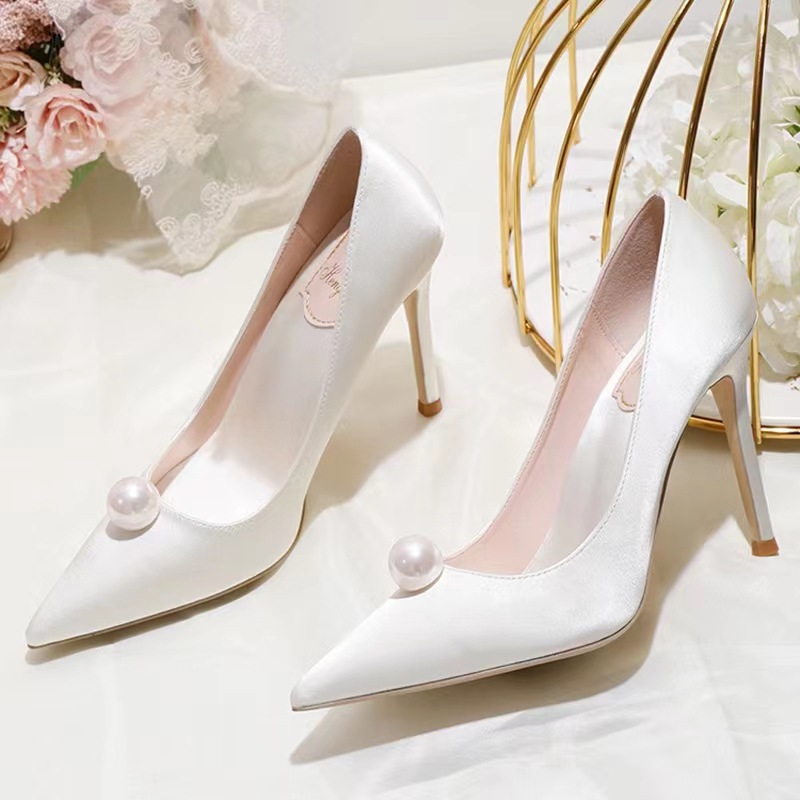 웨딩 슈즈 여성용 2023 새로운 진주 다이아몬드 버클 하이힐 스틸레토 슈즈 새틴 들러리 웨딩 원피스 웨딩 신부 신발스토어 가기