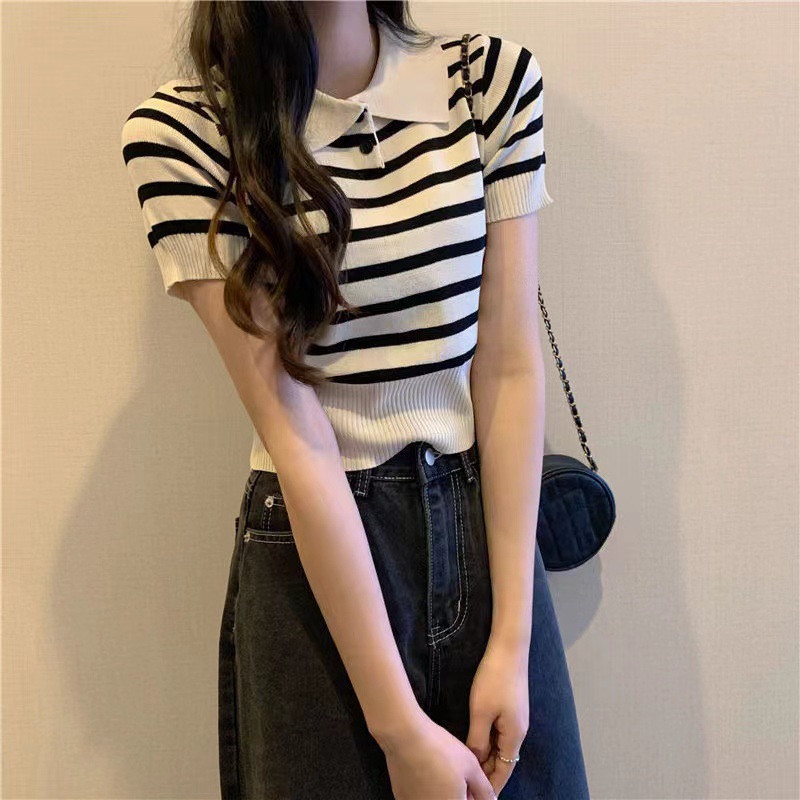 여름 새로운 한국 스타일 POLO 라펠 얇은 슬림핏 스트라이프 반팔 짧은 니트 셔츠 여성용스토어 가기