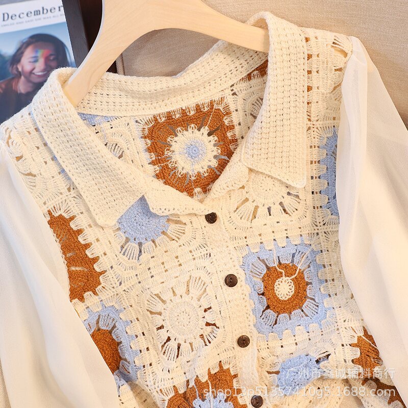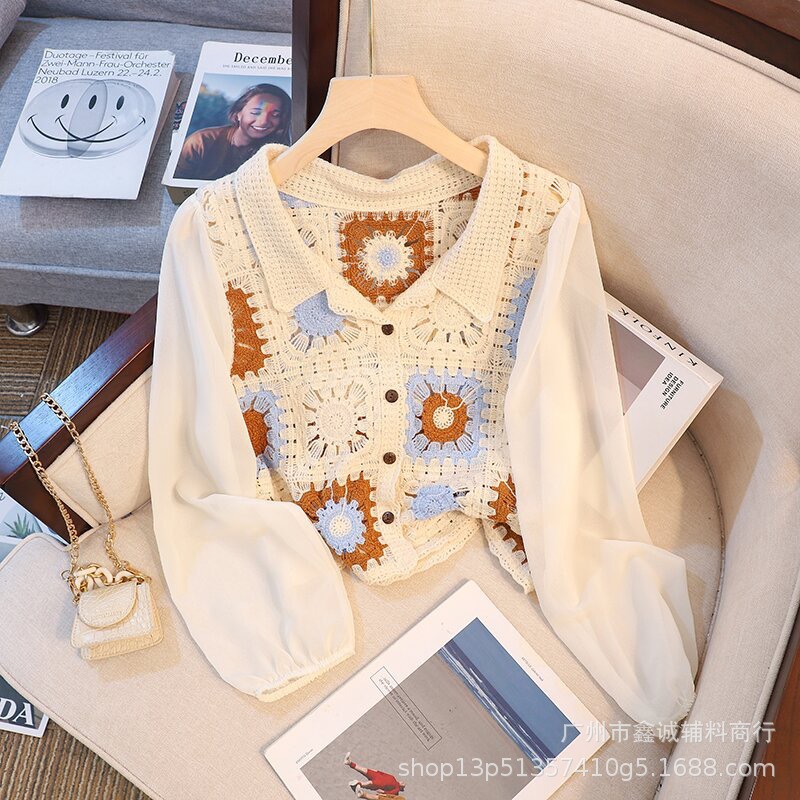 봄과 가을 새로운 자수 크로 셰 뜨개질 옷깃 얇은 쉬폰 셔츠 여성의 디자인 감각 향기로운 스타일 중공 느슨한 셔츠 탑