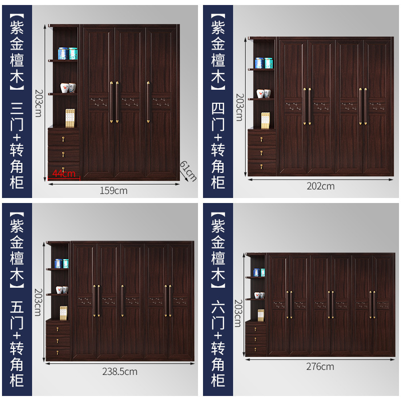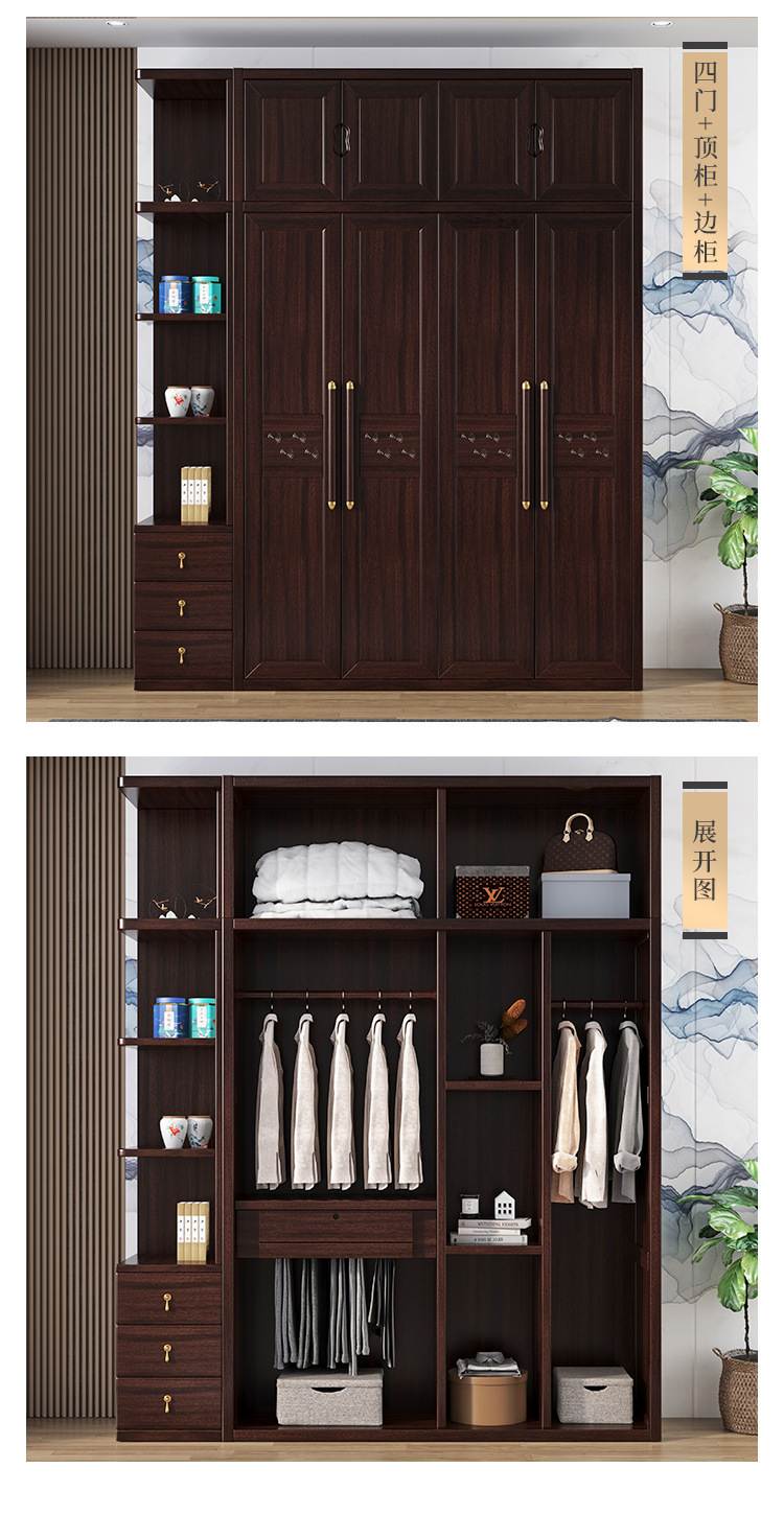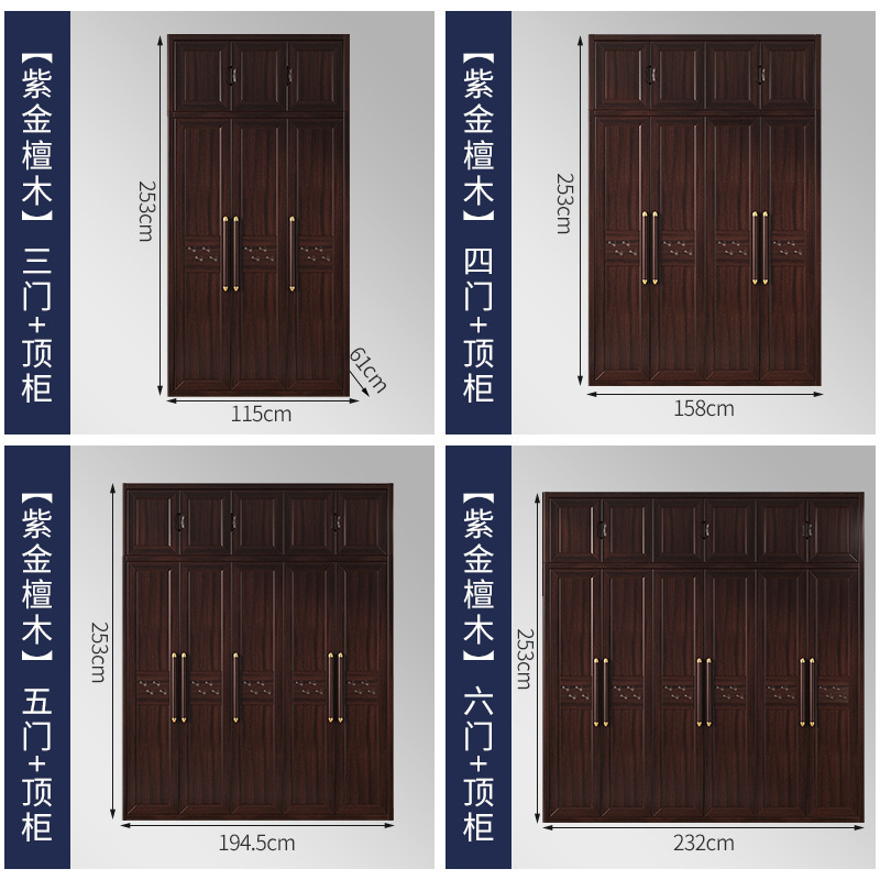 새로운 중국 스타일의 단단한 나무 옷장 보라색 백단 현대 대용량 옷장 침실 4 도어 목재 캐비닛 보관 가구스토어 가기