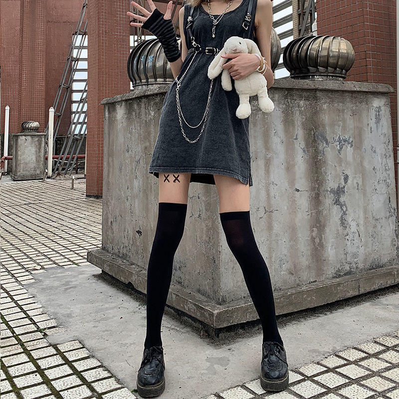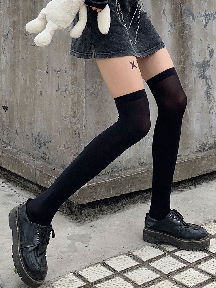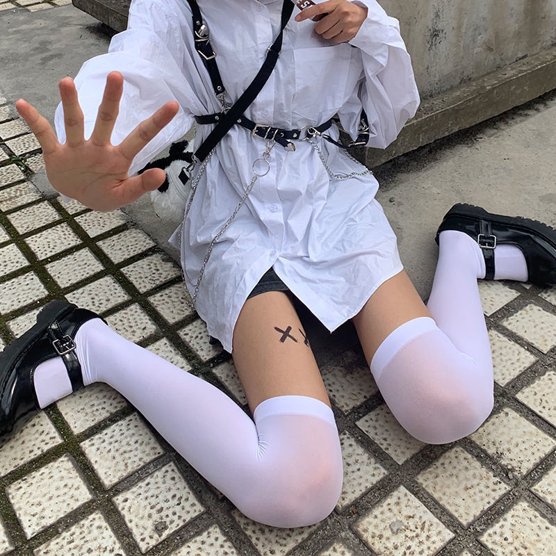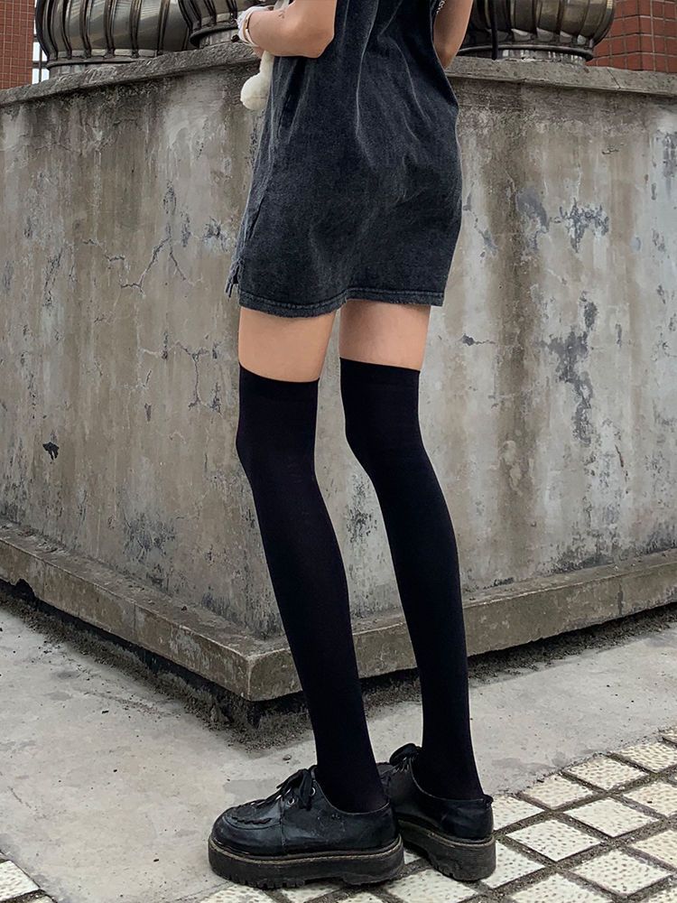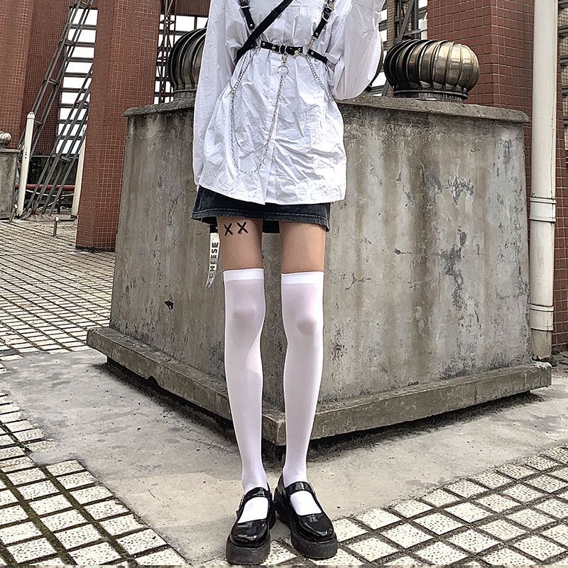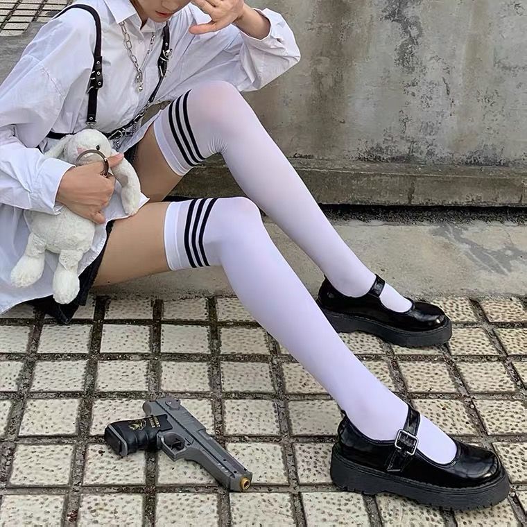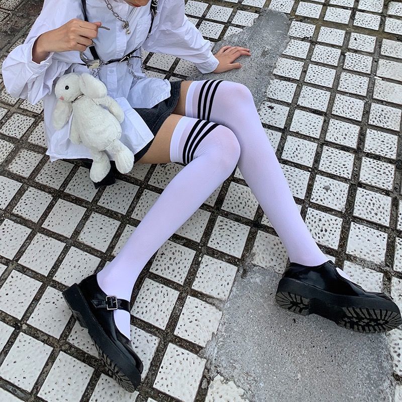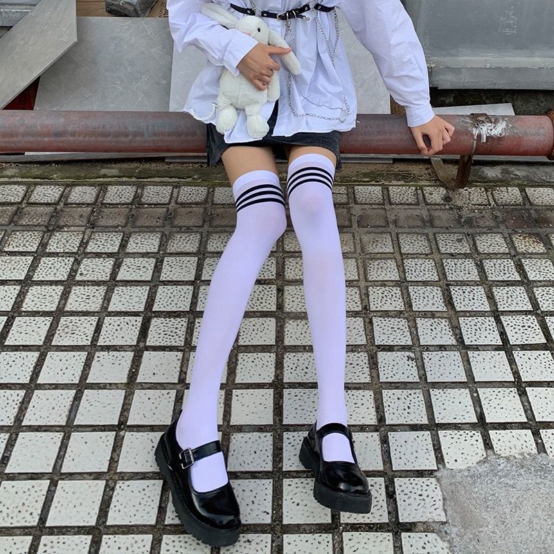 여성용 롱스타킹, 무릎 위까지 오는 양말, 여름용, 컬리지 스타일, 흰색, 봄, 가을용, 얇은, 허벅지까지 오는, JK 스타일, 하이스타킹, 세 줄 스트라이프 양말스토어 가기