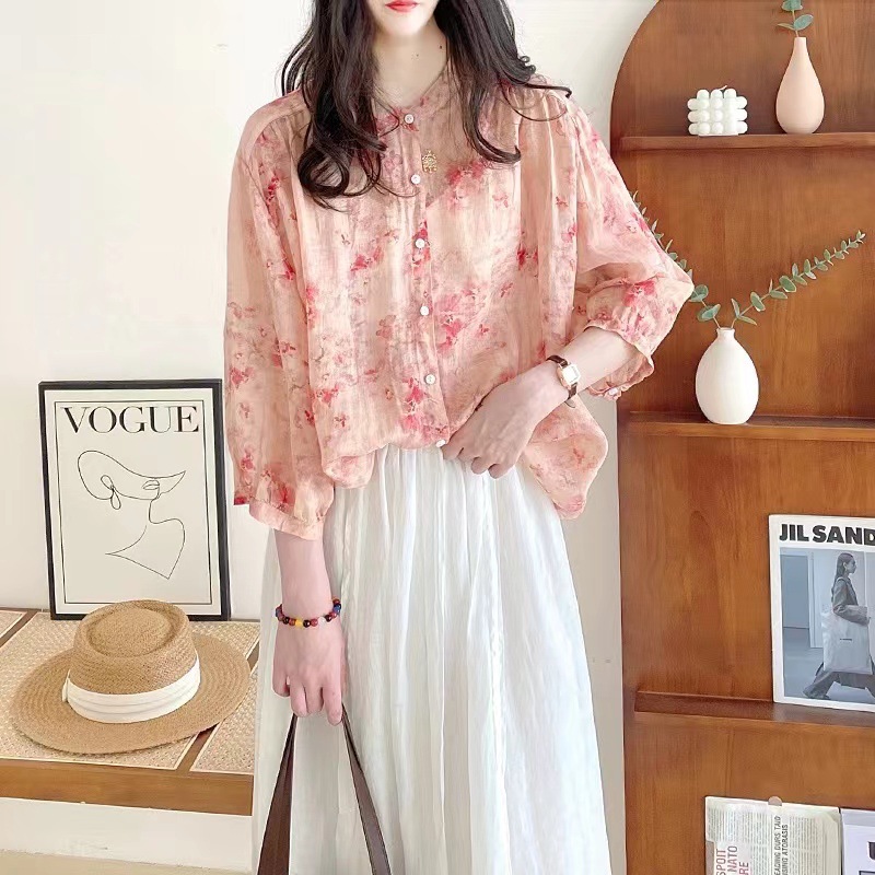 여름 새로운 라운드 넥 세븐 포인트 슬리브 싱글 브레스트 캐주얼 예술적 루즈 프린트 셔츠