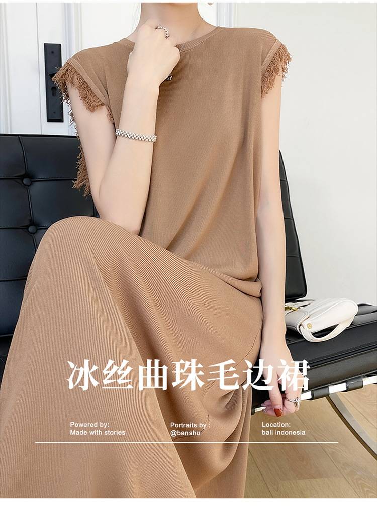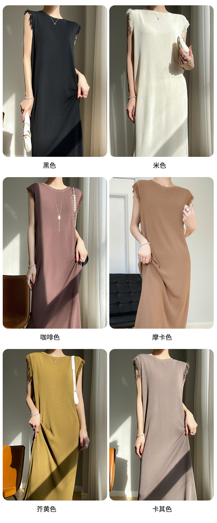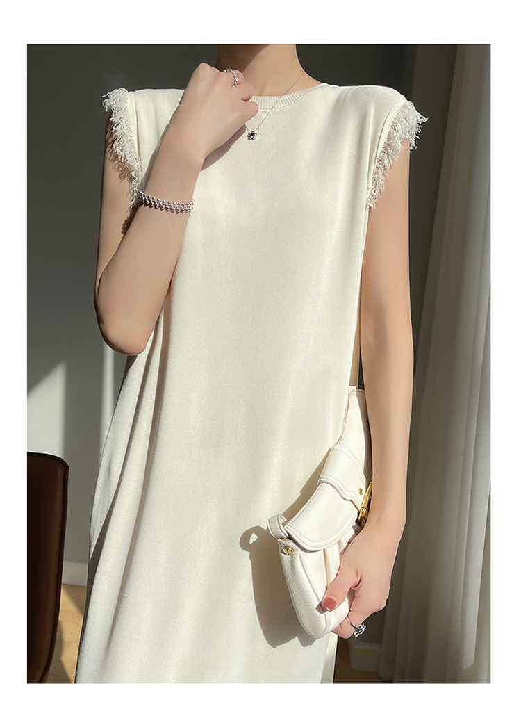 여름 와이드 숄더 민소매 롱 니트 원피스 심플 라운드 넥 느슨한 레이드 백 드레이핑 무릎 위 무릎 원피스