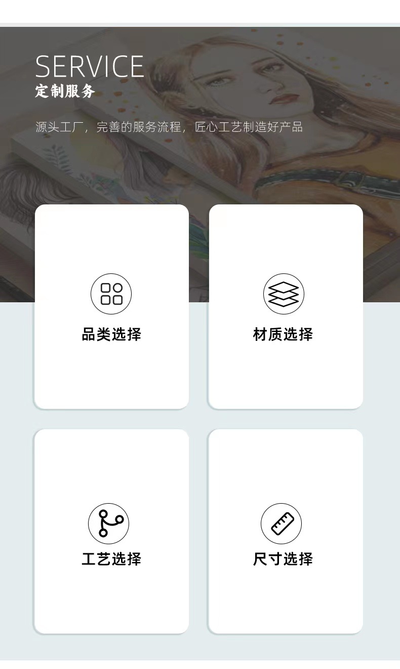 产品特点:无酸性纸、防霉抗蛀;不含漂白剂、保护双眼;易于上铅、表现力强;耐磨抗擦、不易损坏。