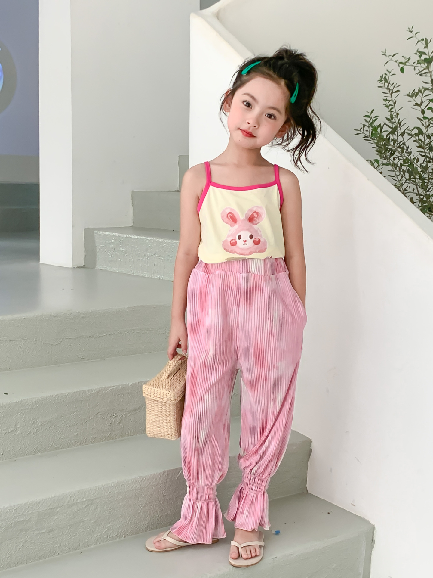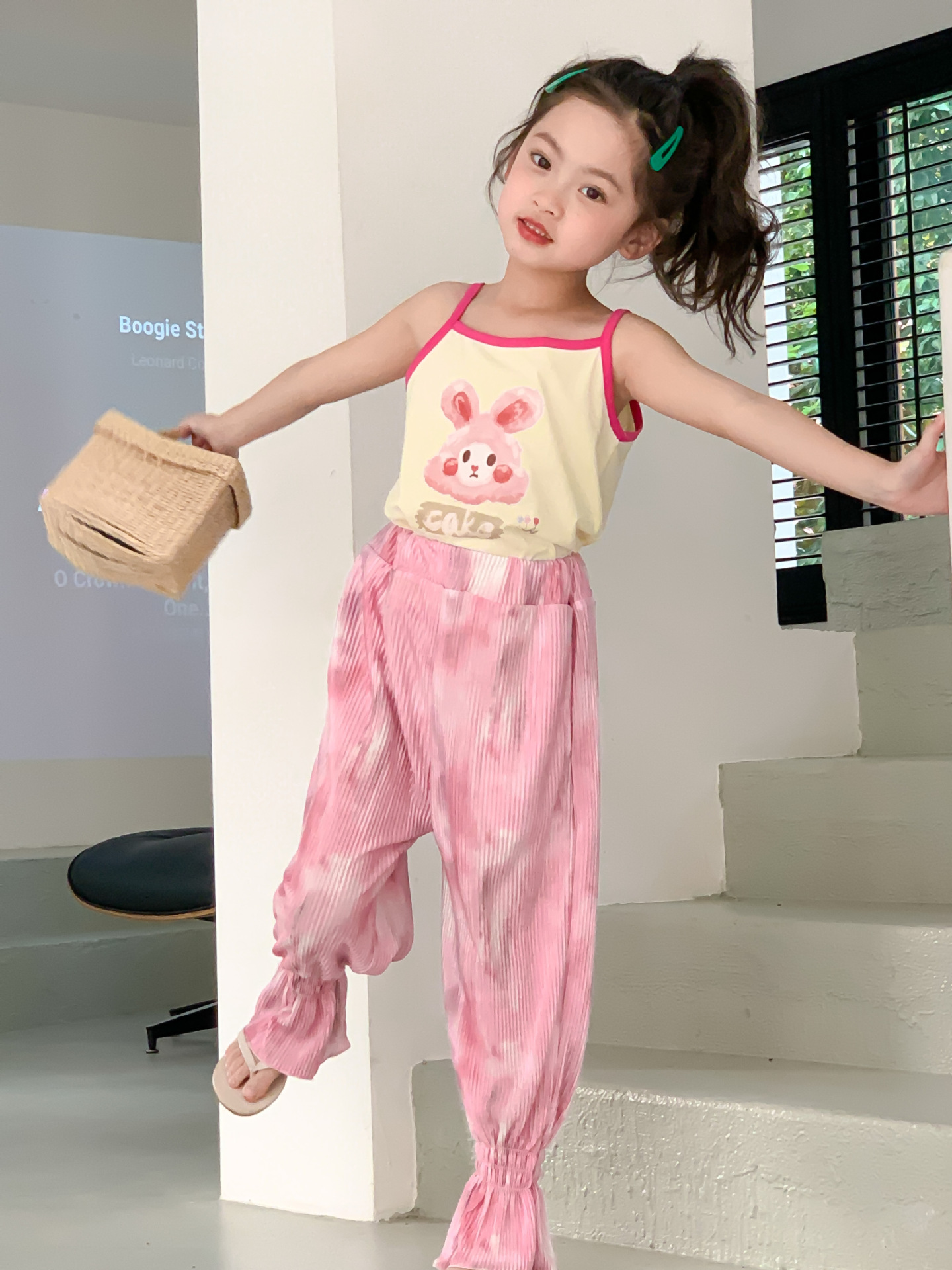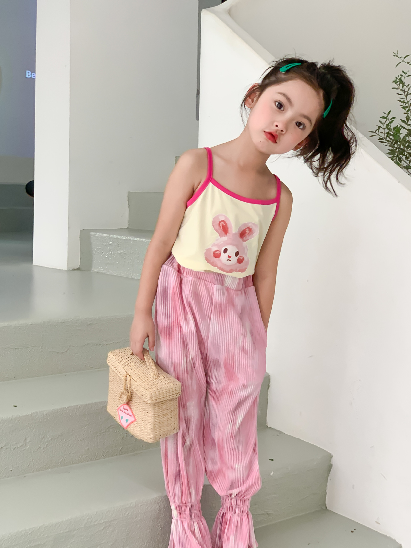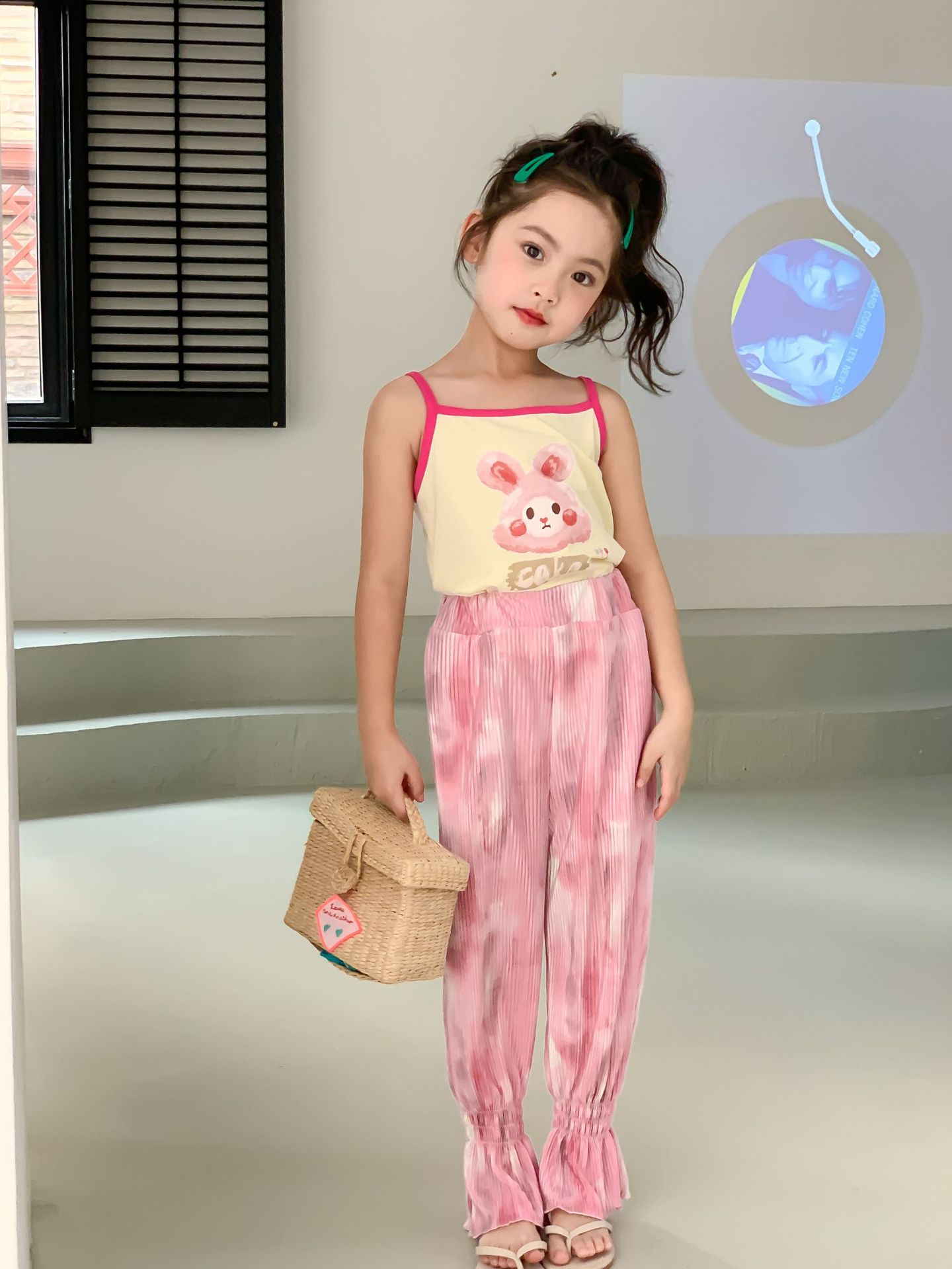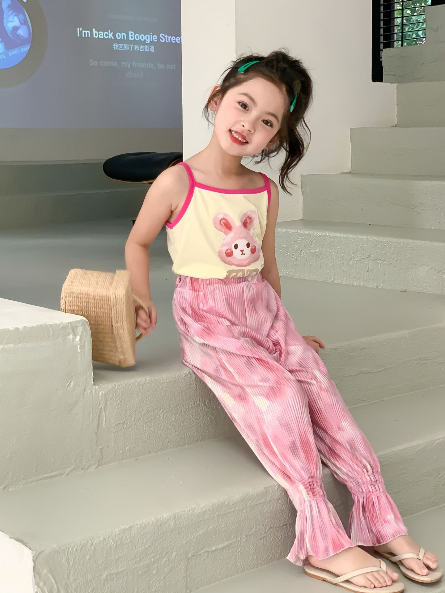 소녀의 만화 니트 슬링 + 쉬폰 바지 투피스 세트 Instagram 아동복 2023 여름 원피스 여성 아기 귀여운 세트