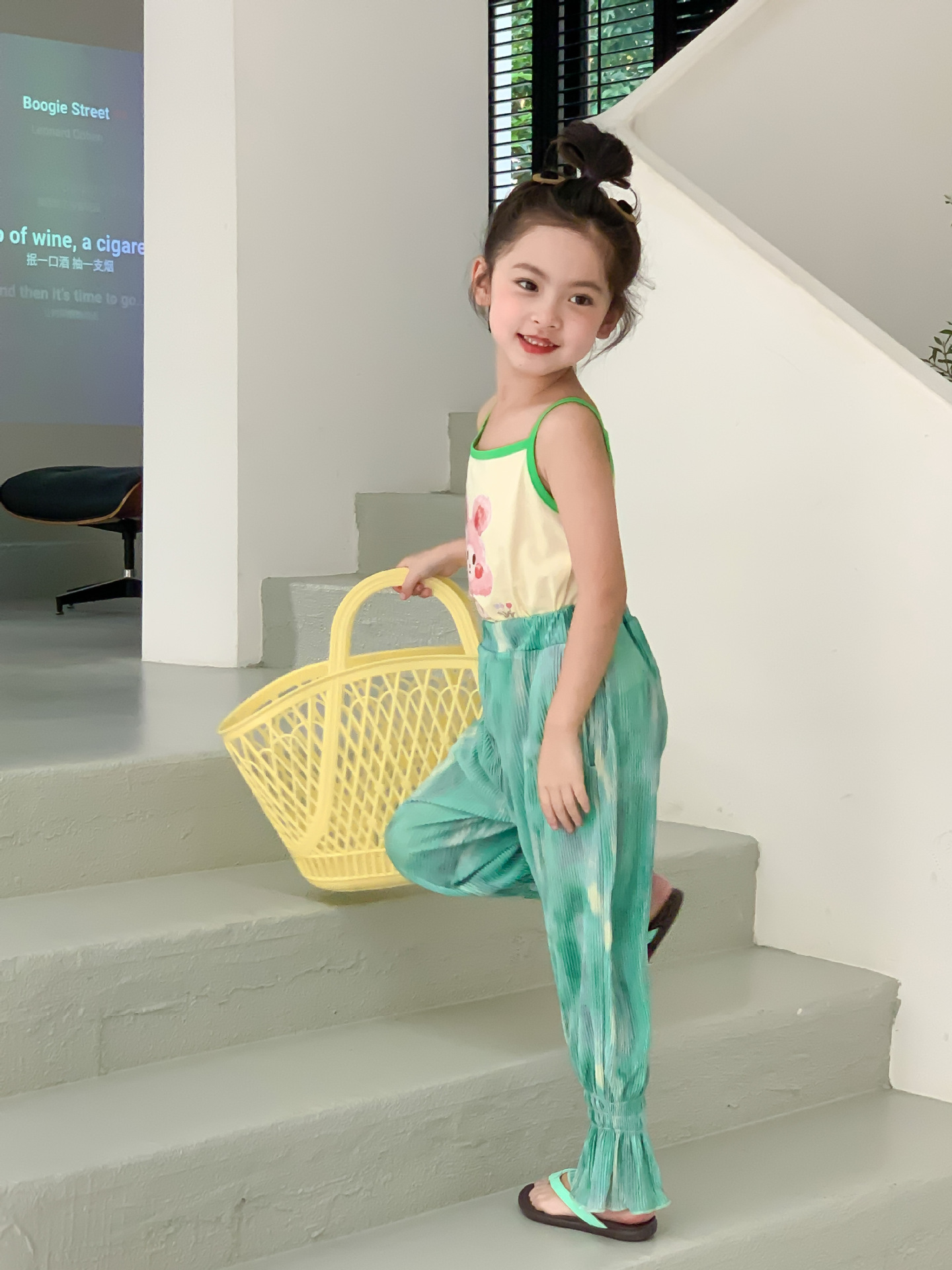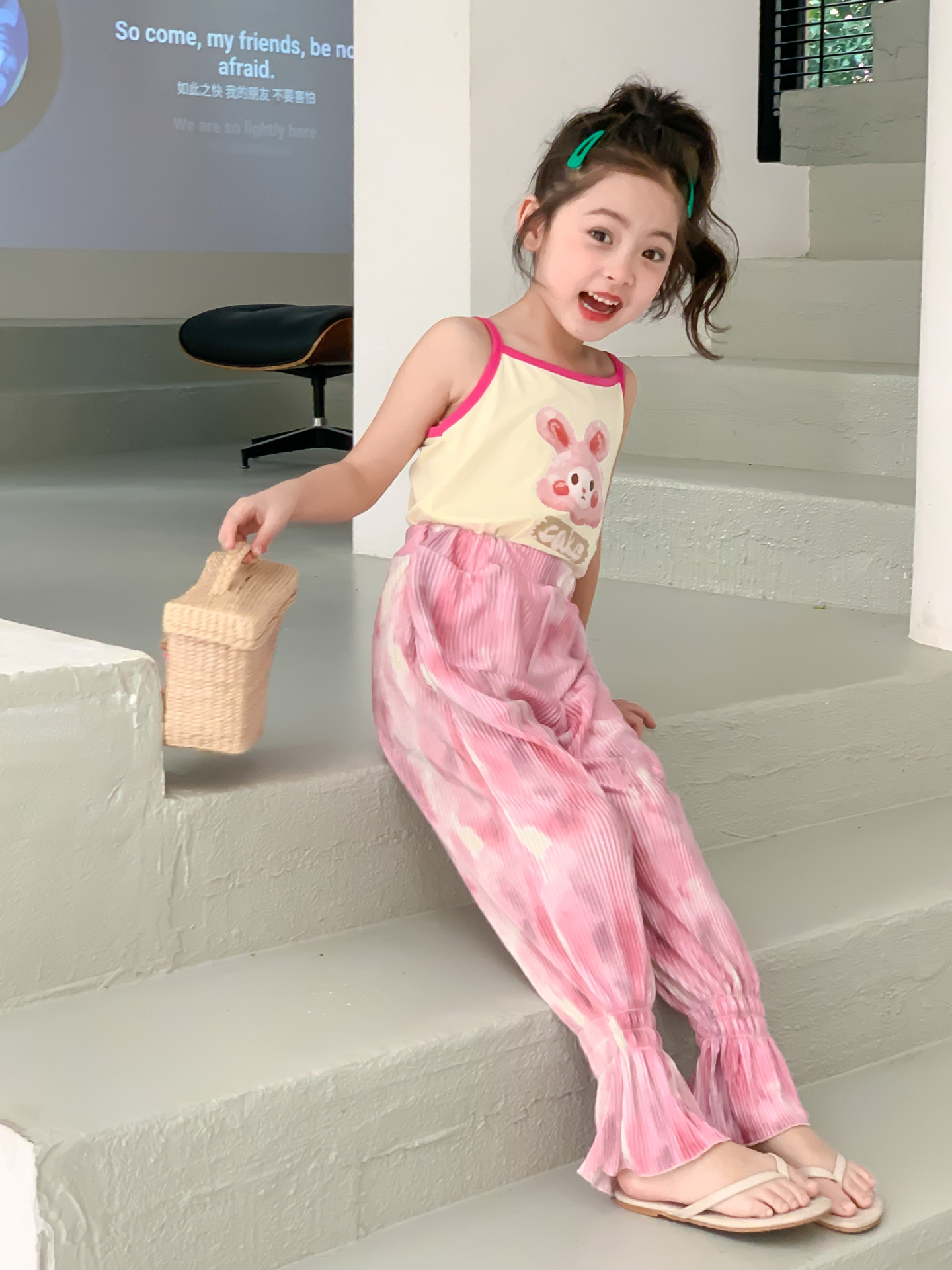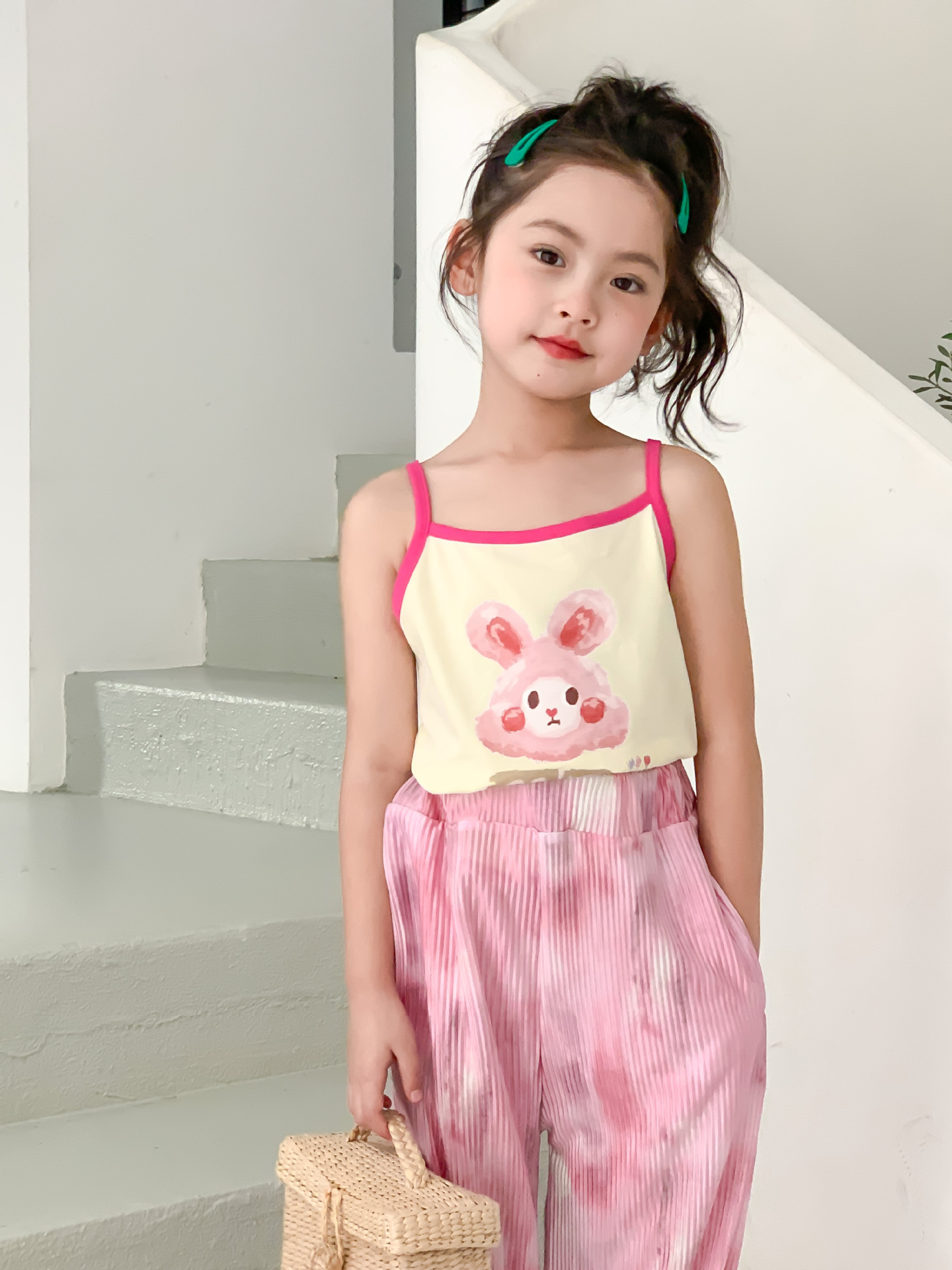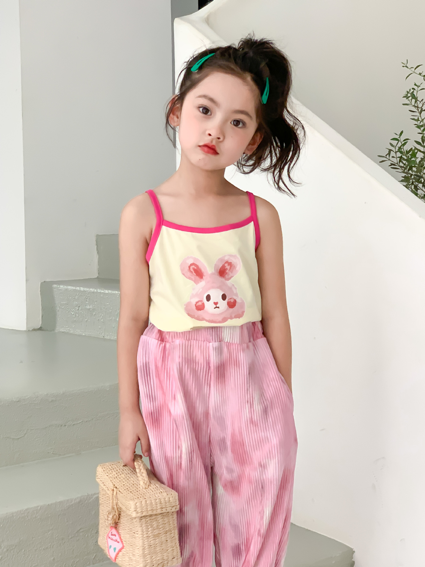 소녀의 만화 니트 슬링 + 쉬폰 바지 투피스 세트 Instagram 아동복 2023 여름 원피스 여성 아기 귀여운 세트