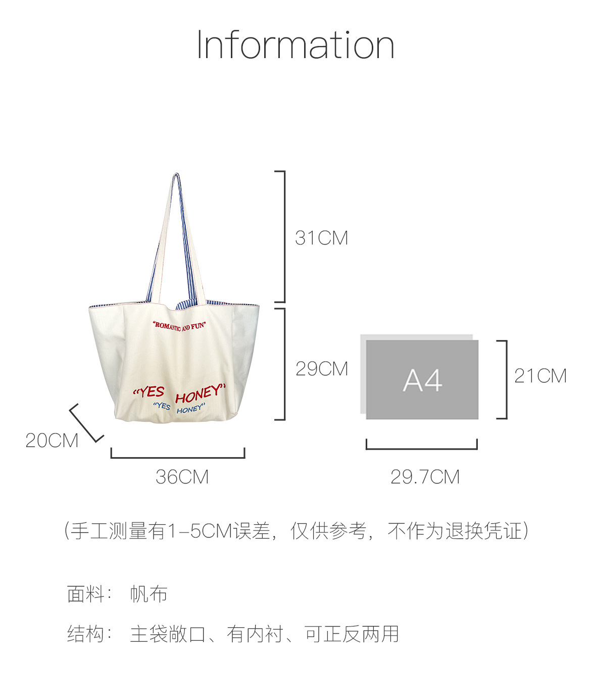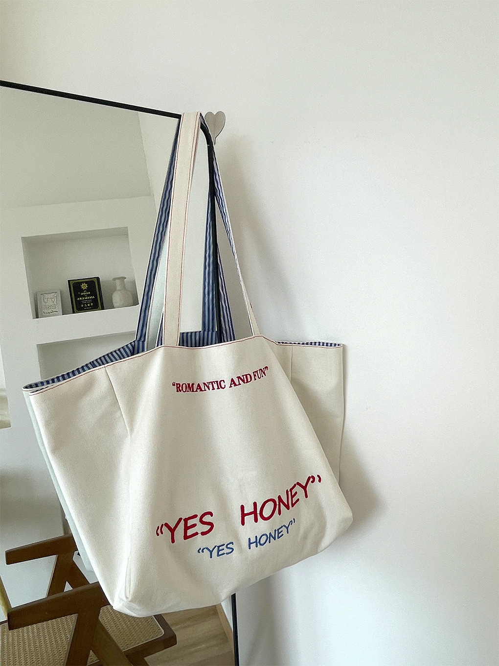 대용량 토트백 더블 사이드 백 스트라이프 숄더백 질감 자수 대학생 캔버스 가방 여성 통근 가방