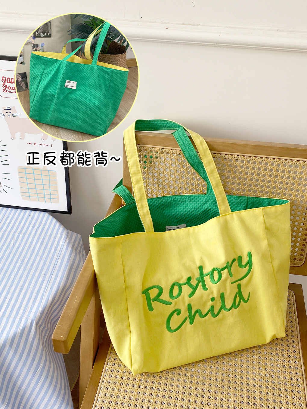 대용량 토트백 더블 사이드 백 스트라이프 숄더백 질감 자수 대학생 캔버스 가방 여성 통근 가방스토어 가기