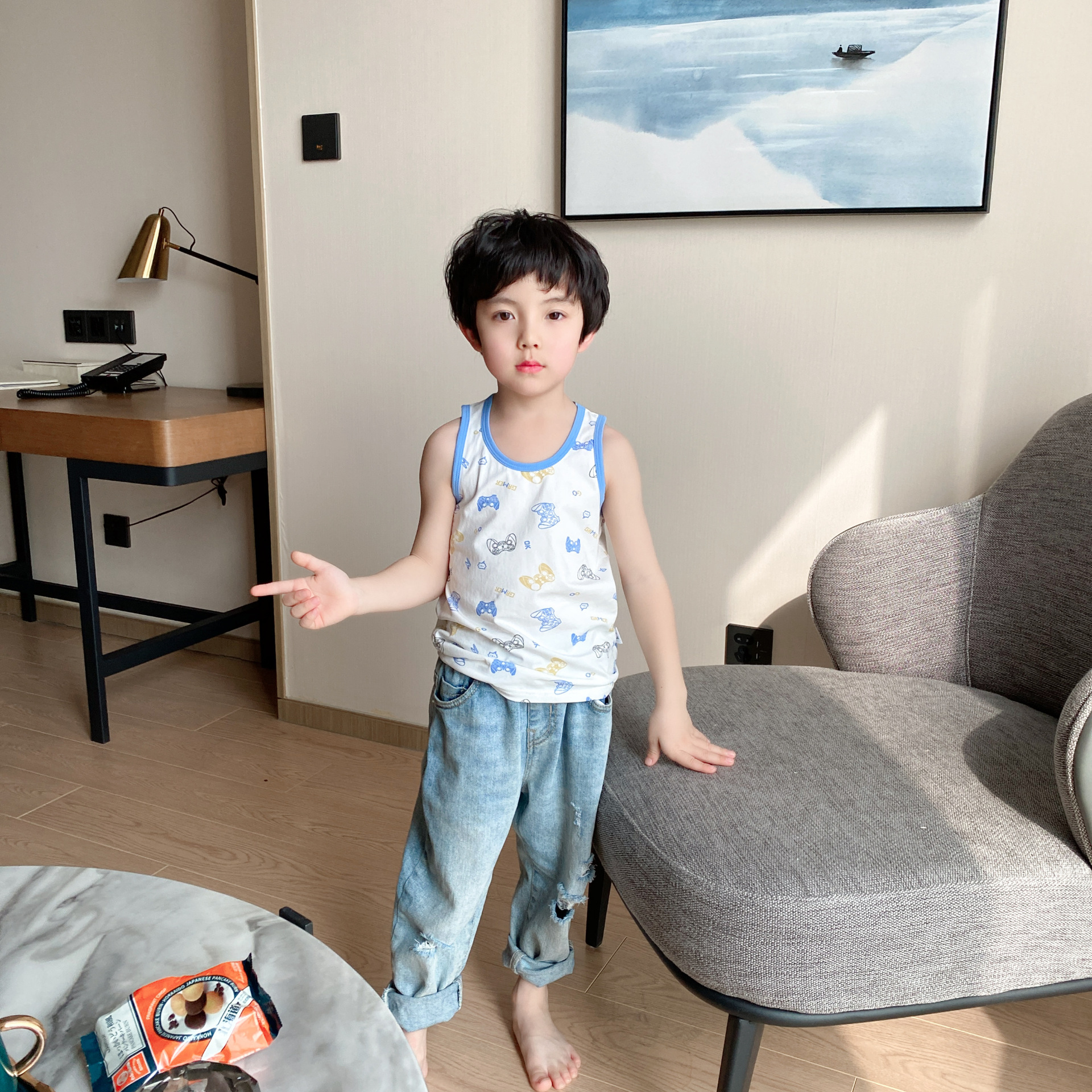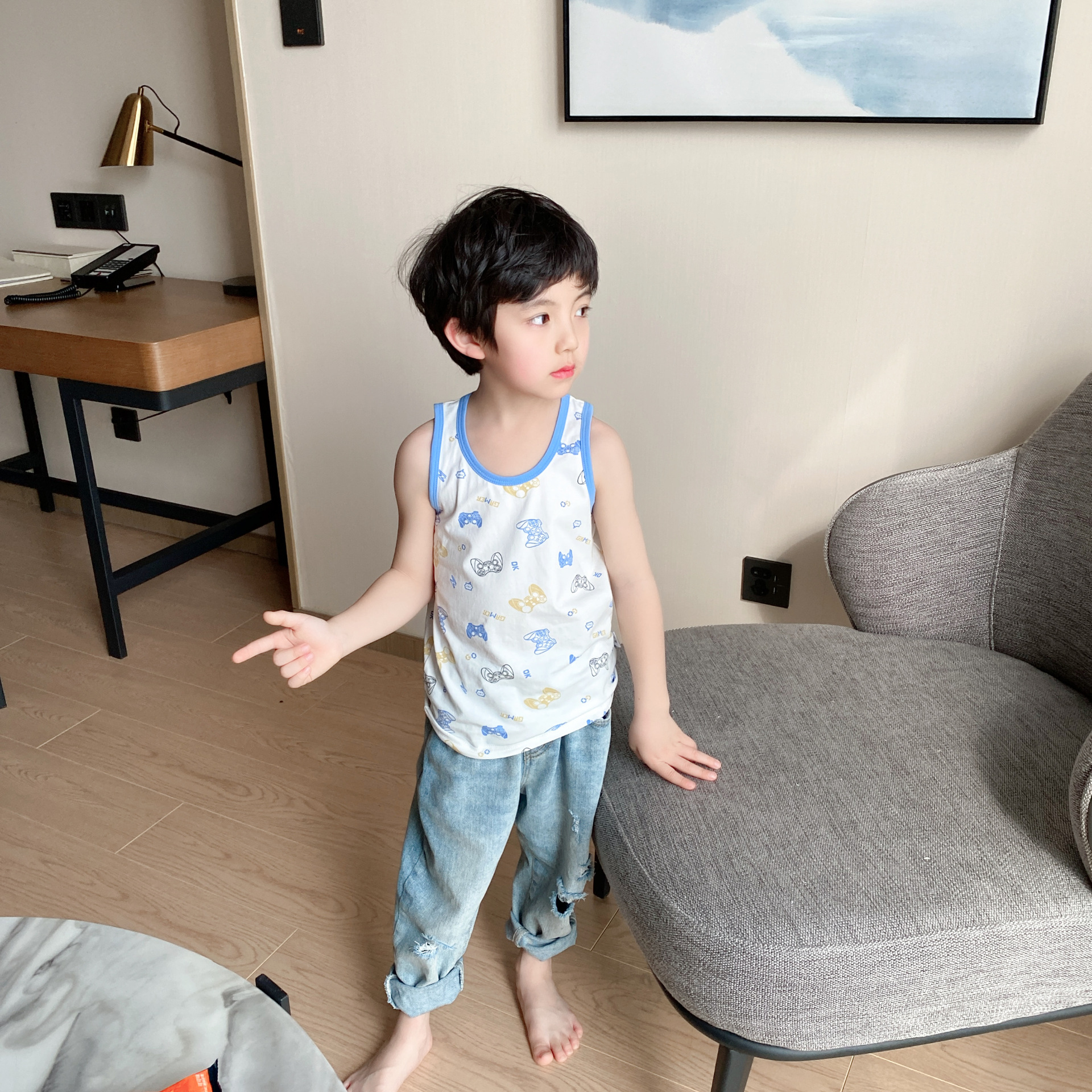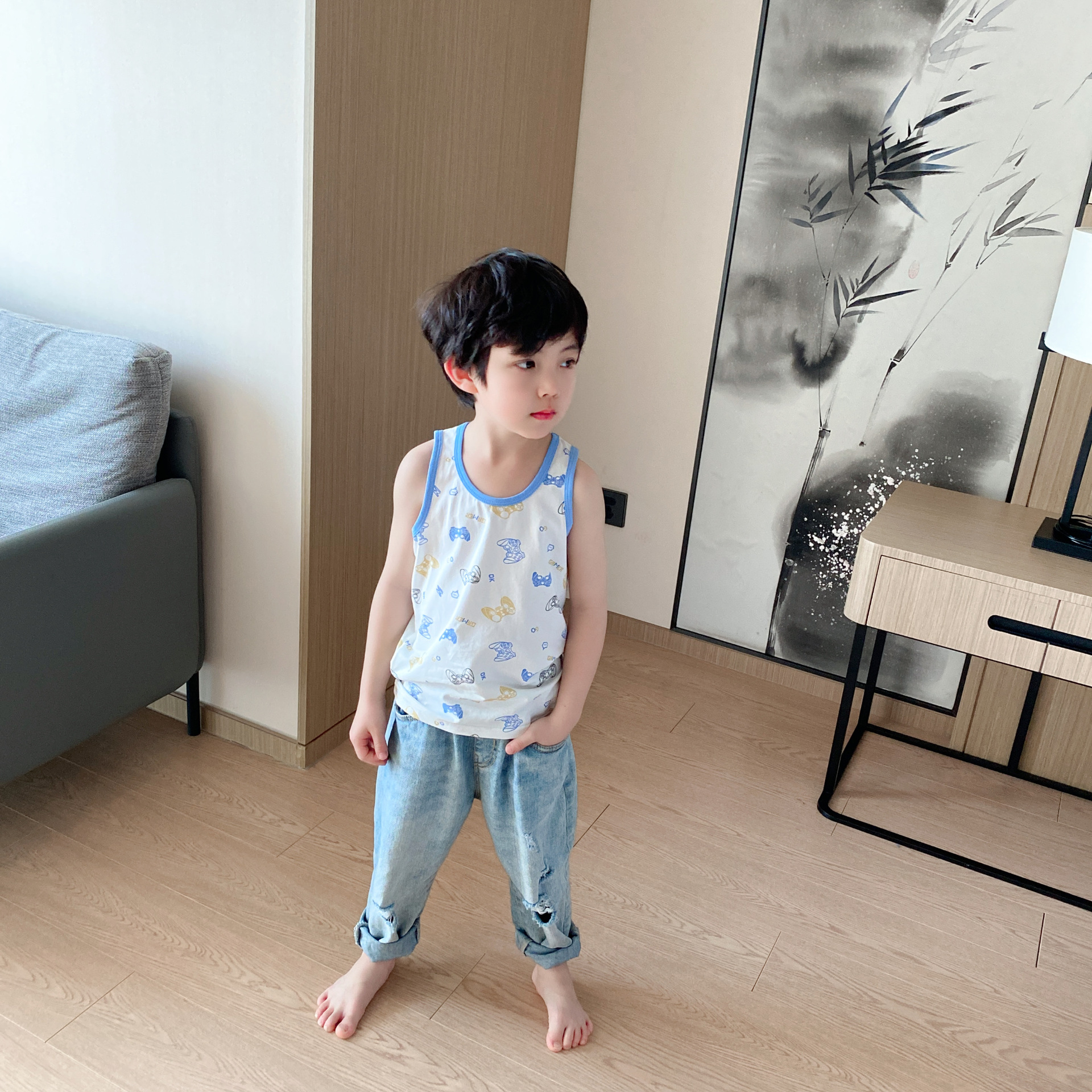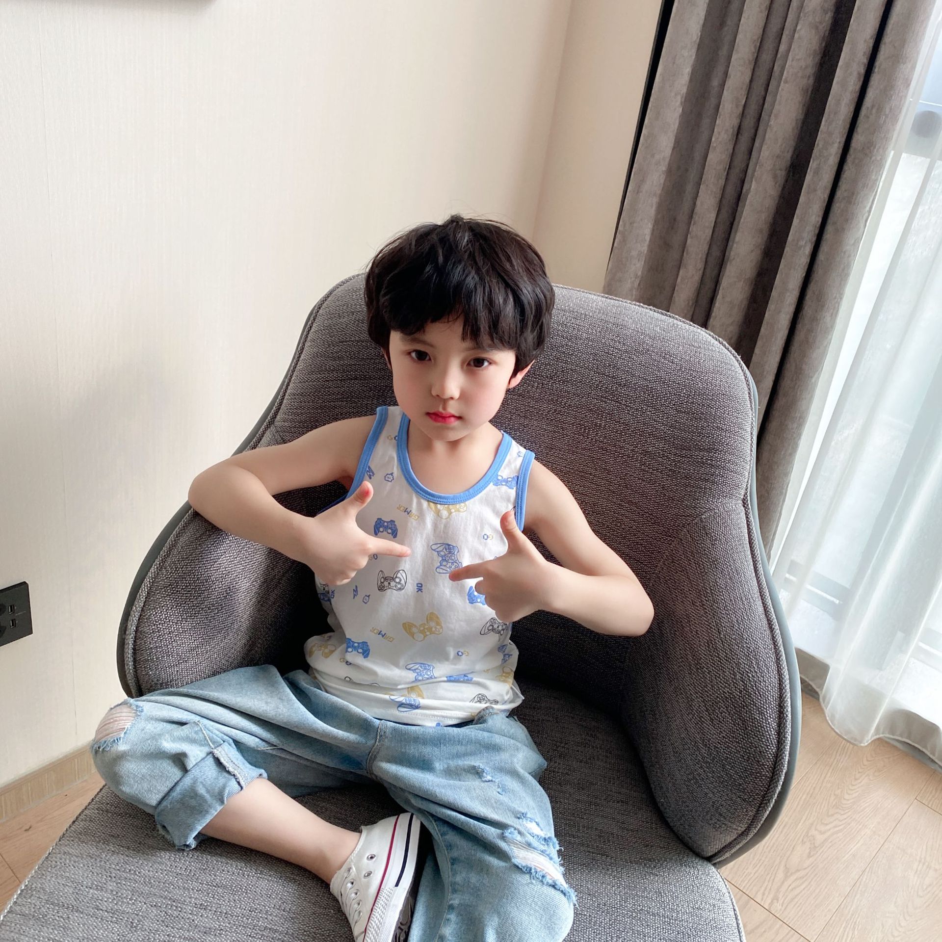 3 피스 세트 봄과 여름 새로운 라이크라 코튼 새로운 어린이 조끼 소녀 바닥 조끼 얇은 내복 소년 조끼스토어 가기