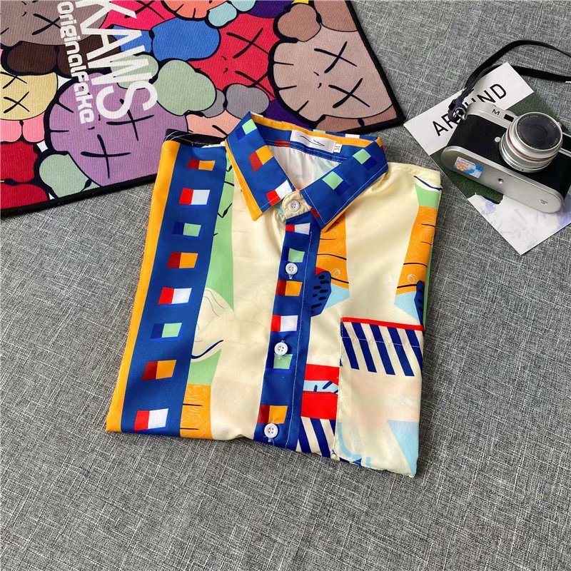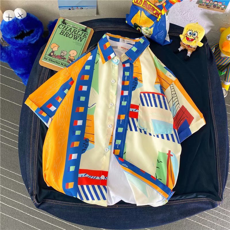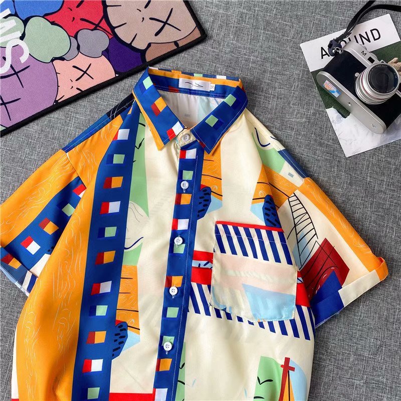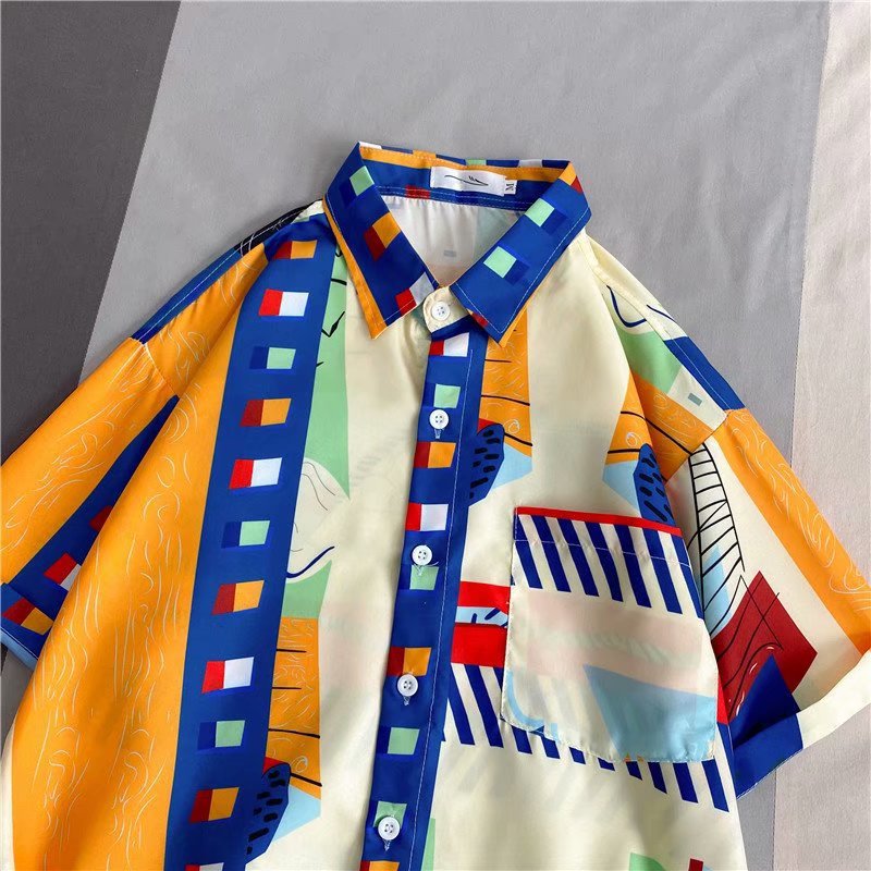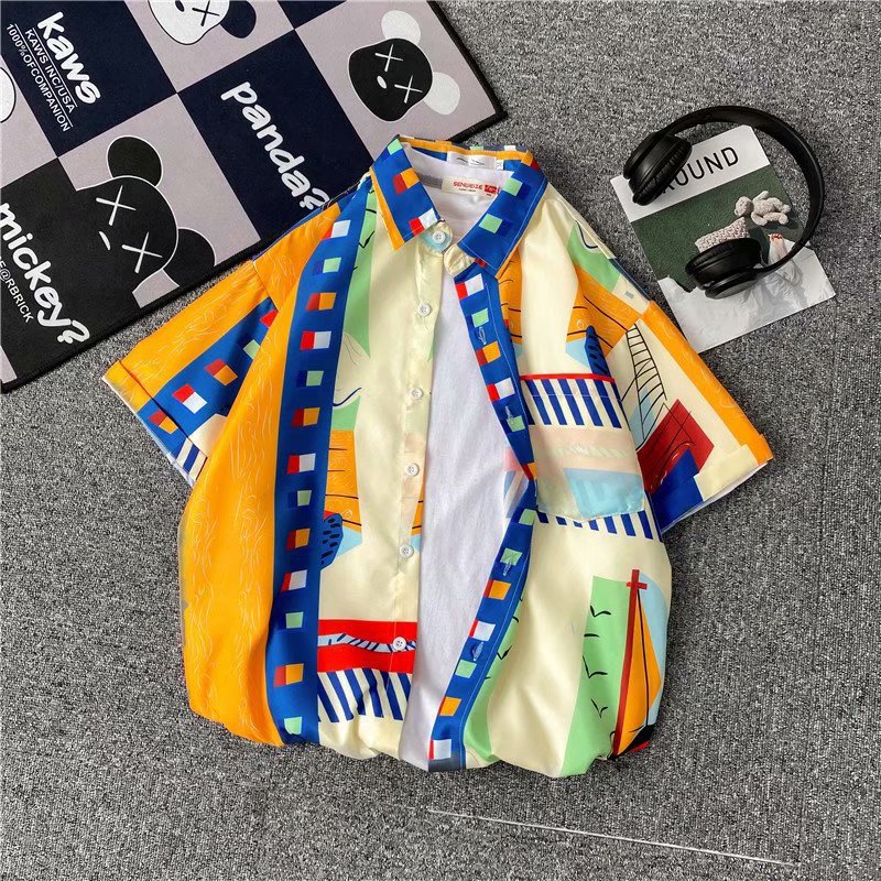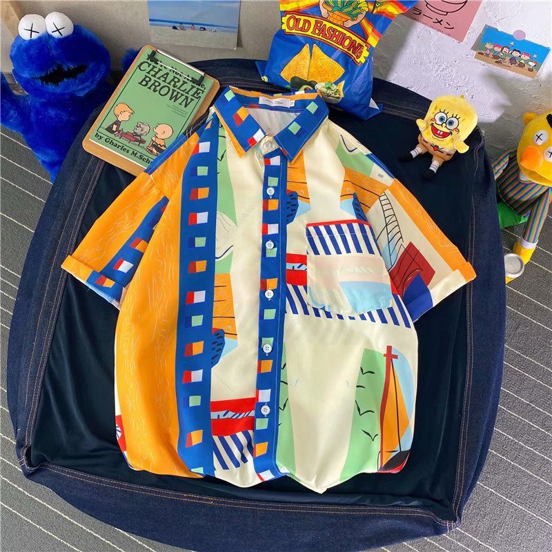 홍콩 스타일 남성과 여성을위한 반팔 꽃 셔츠 여름 일본식 캐주얼 비치 셔츠 유행 느슨한 하와이안 재킷