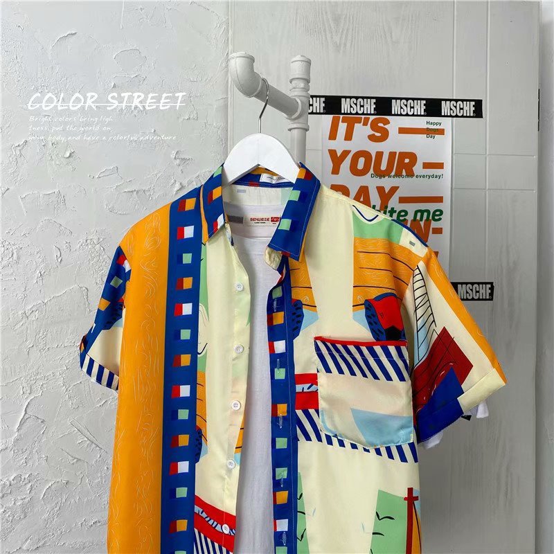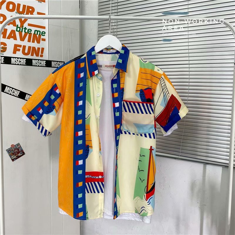 홍콩 스타일 남성과 여성을위한 반팔 꽃 셔츠 여름 일본식 캐주얼 비치 셔츠 유행 느슨한 하와이안 재킷스토어 가기