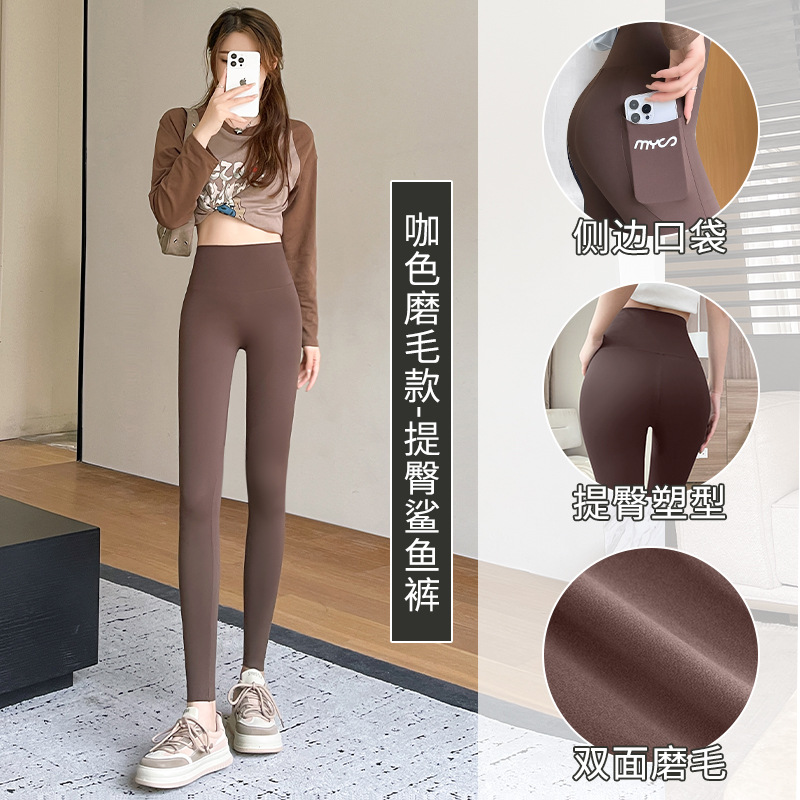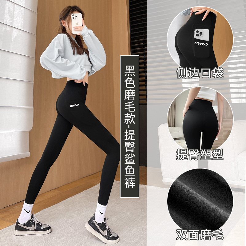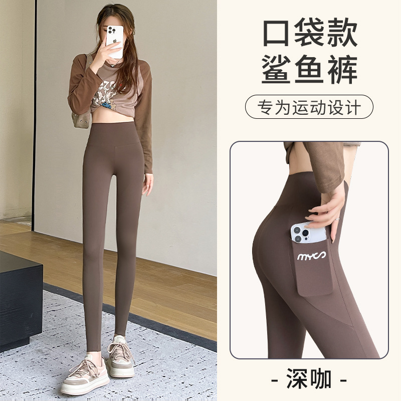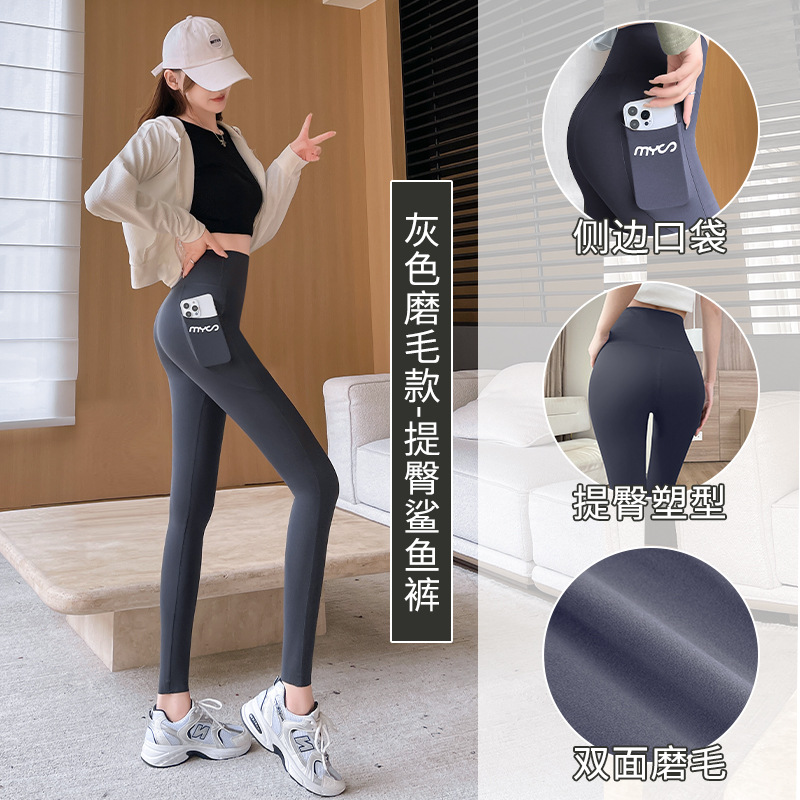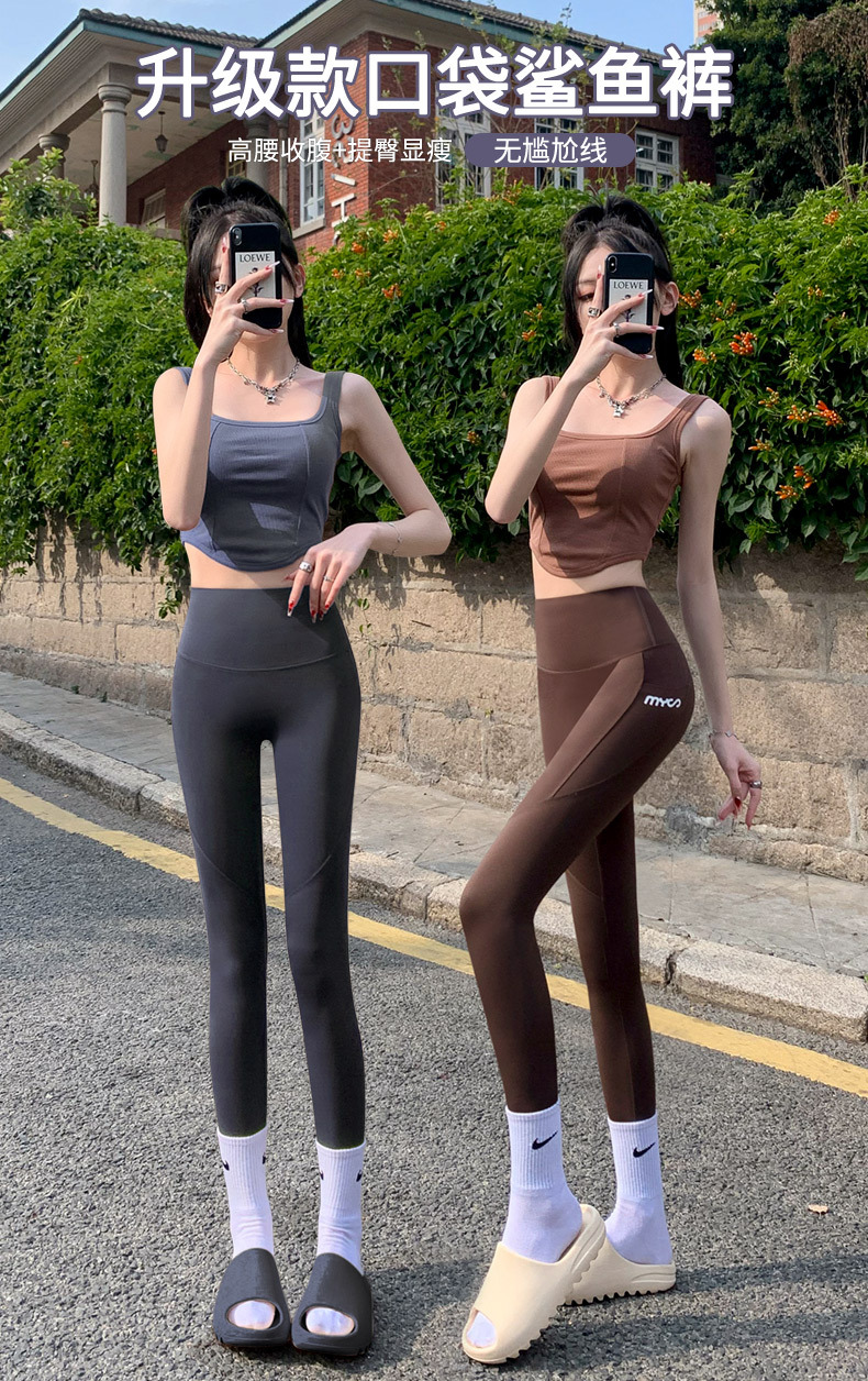 레깅스 여성의 가을과 겨울 새로운 상어 바지 사이드 포켓 스포츠 하이 웨이스트 복부 팅커 당혹 라인 바비 요가 바지 트렌디