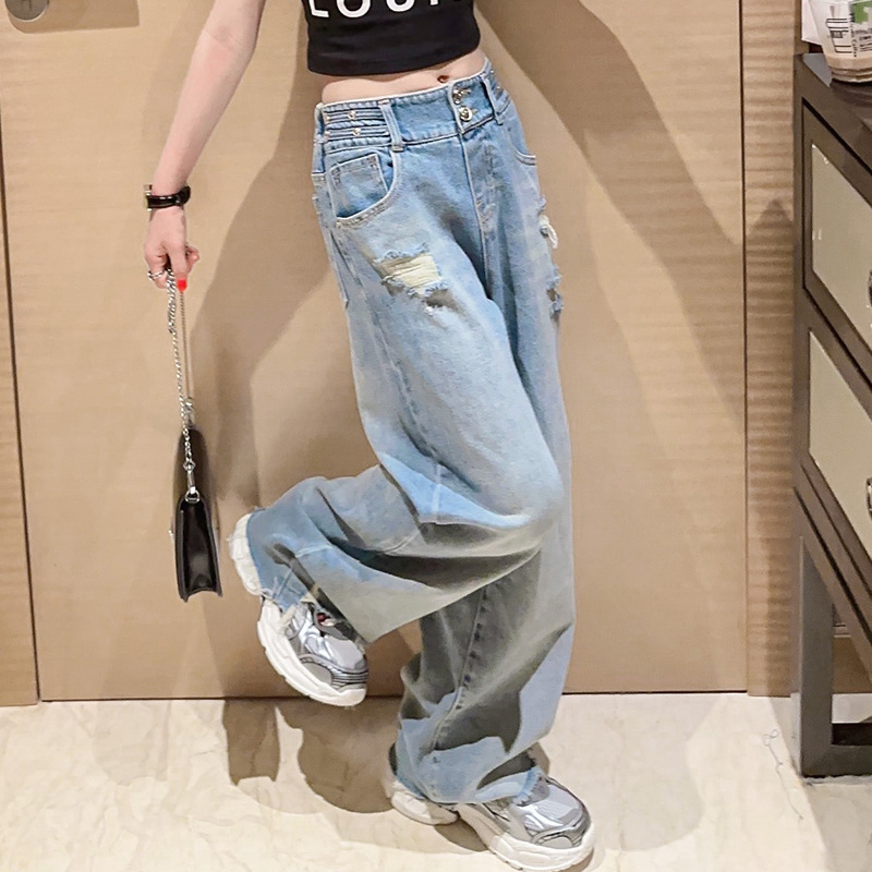 여아 청바지 여름 2023 새로운 여름 찢어진 바지 어린이 더블 버클 청바지 여아 와이드 레그 팬츠스토어 가기