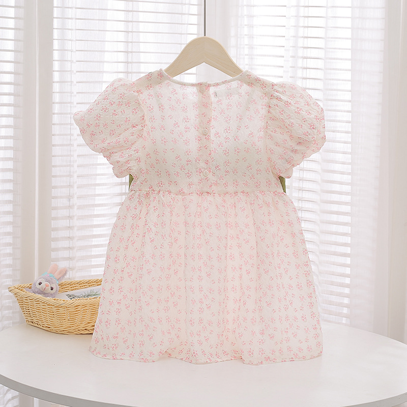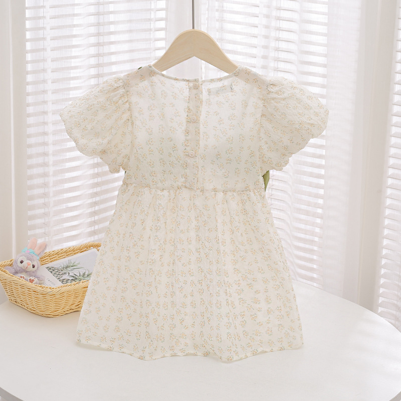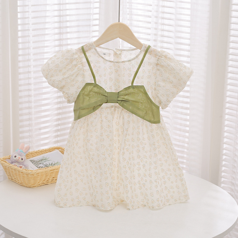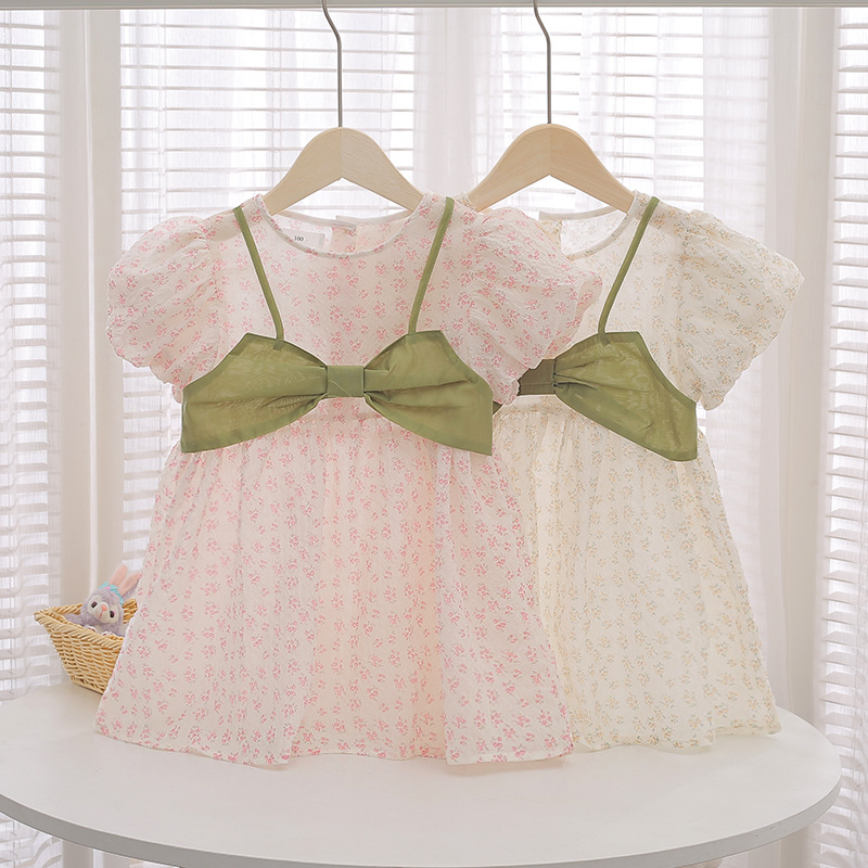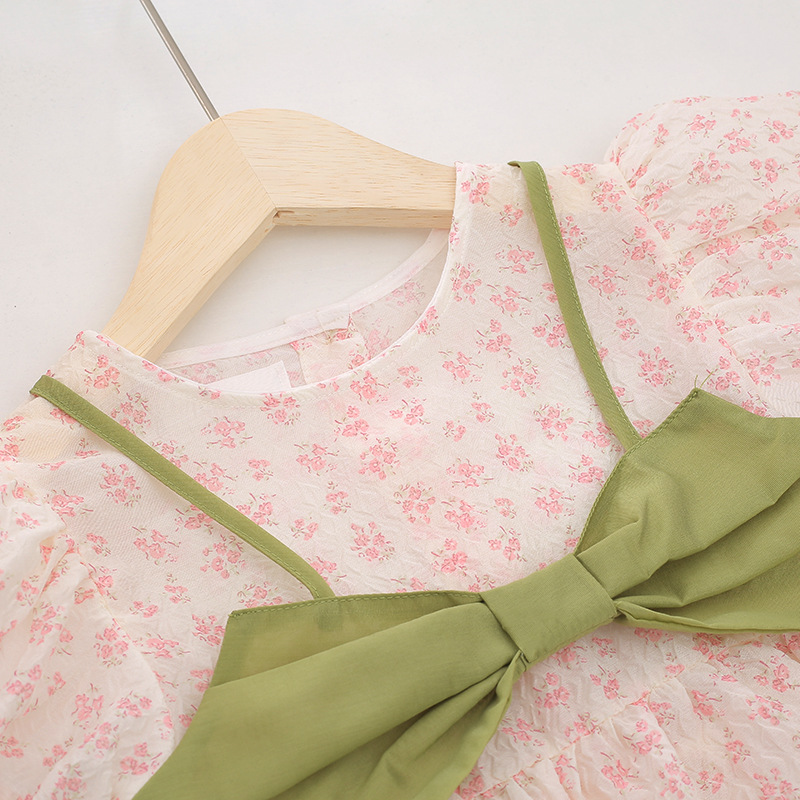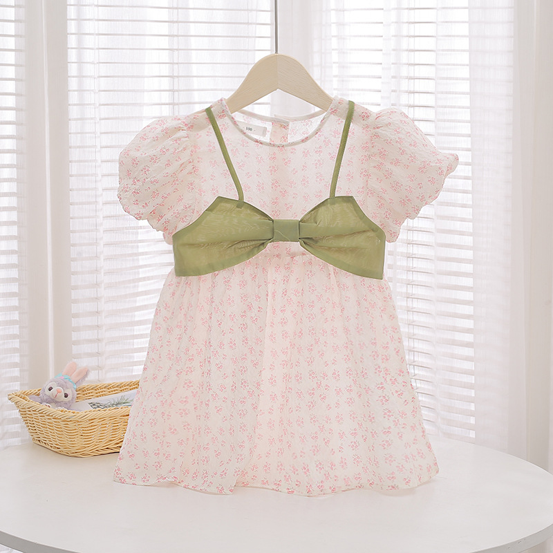 어린이 치마 2023 새로운 스타일 메쉬 꽃 작은 슬링 원피스 여자의 소매 전체 인쇄 작은 샤넬 스타일 보우 스커트스토어 가기