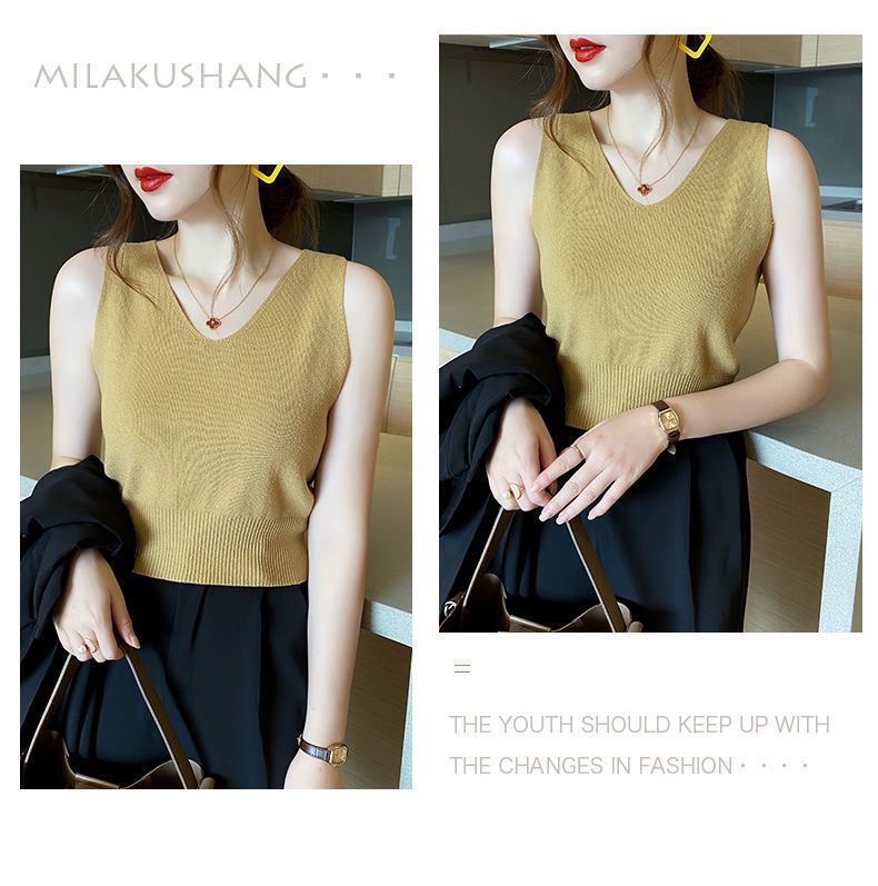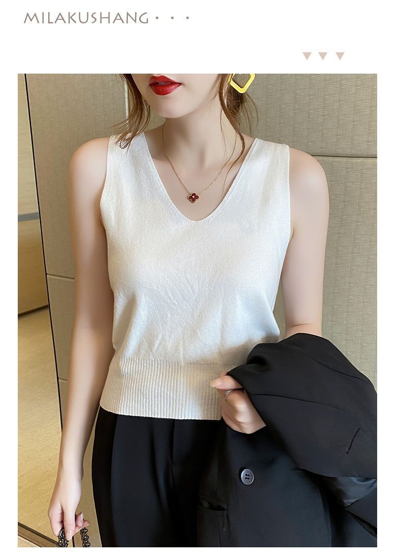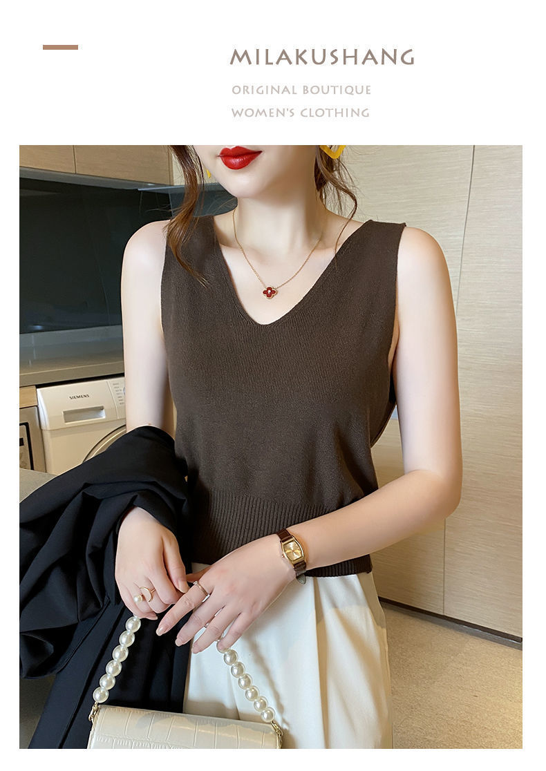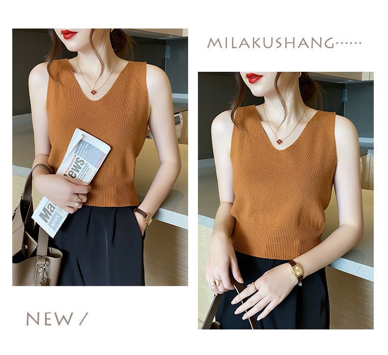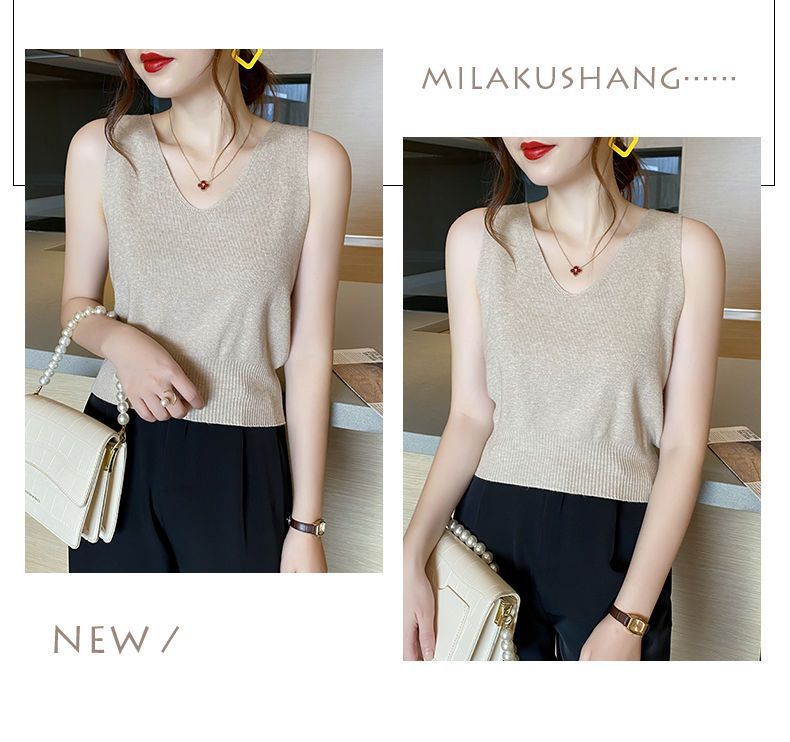 세트 베이스 셔츠 여자의 여름 아이스 실크 V-넥 조끼 탑 프랑스 시크 작은 슬링 니트웨어 겉옷스토어 가기