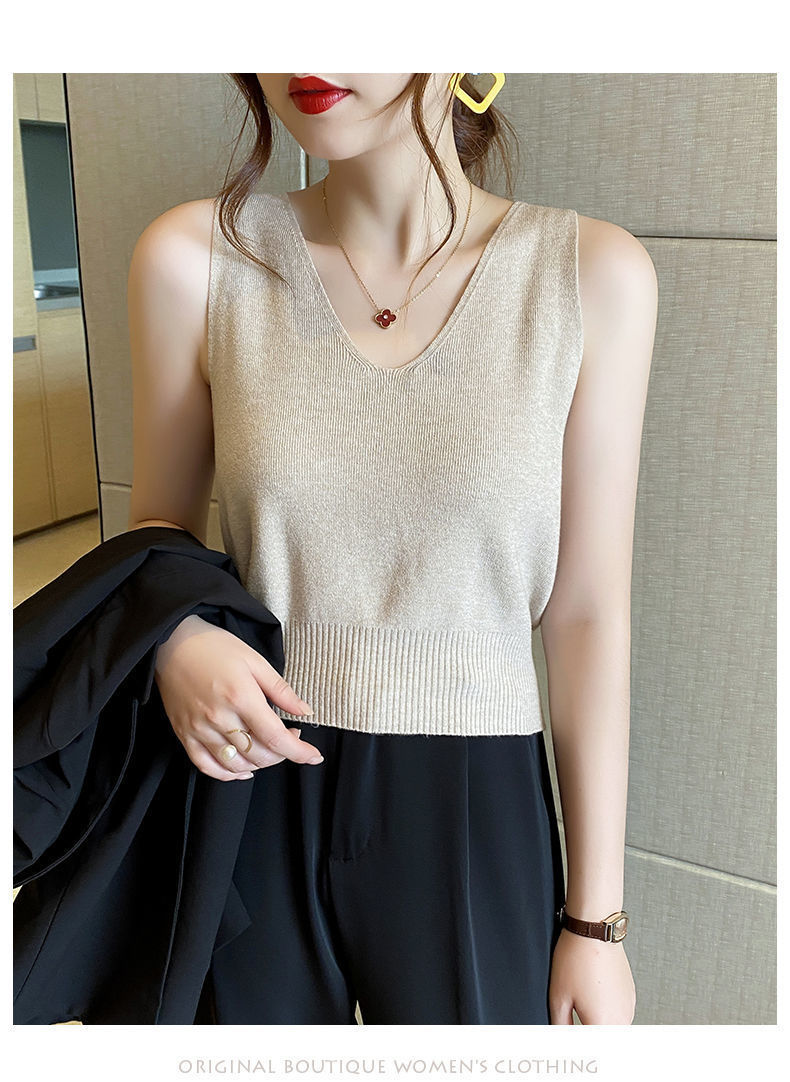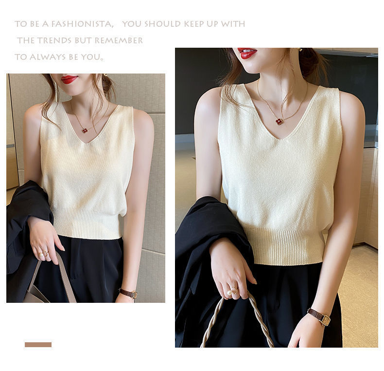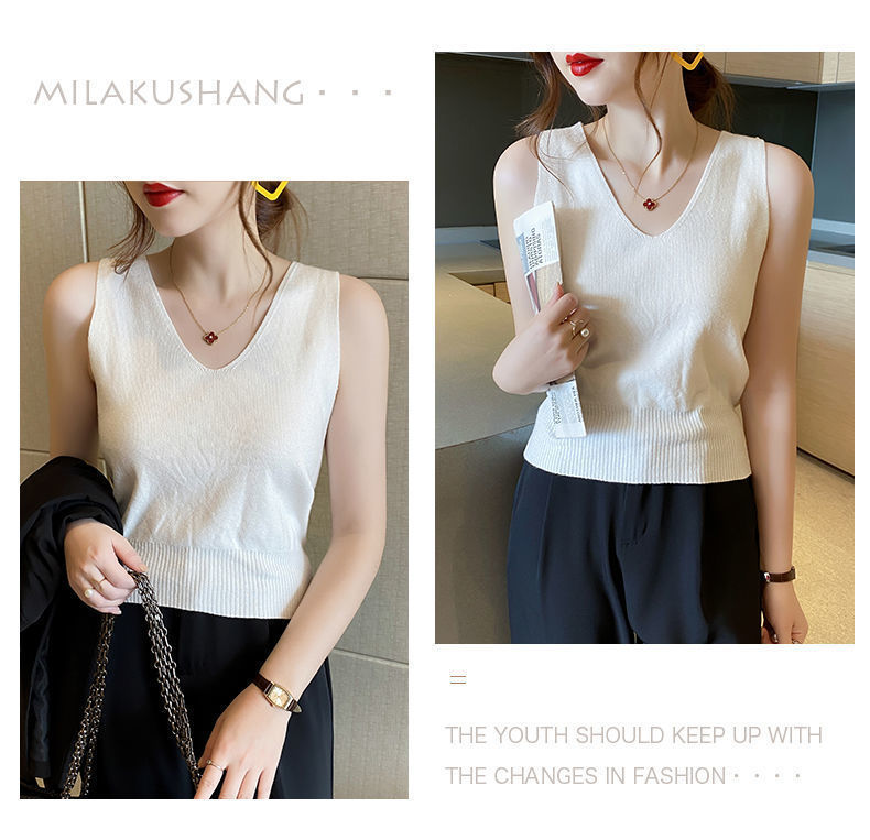 세트 베이스 셔츠 여자의 여름 아이스 실크 V-넥 조끼 탑 프랑스 시크 작은 슬링 니트웨어 겉옷