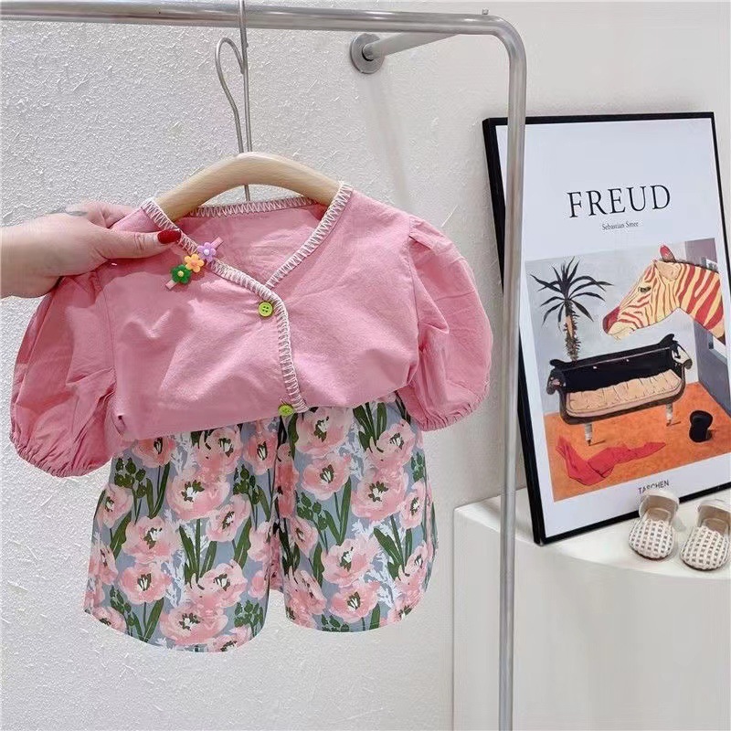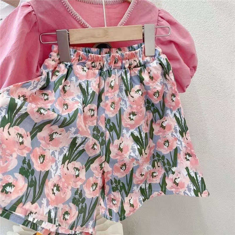 여아 면 웨스턴 스타일 플로럴 프린세스 세트 2023 여름 여아 반팔 탑 반바지 한국식 투피스 세트스토어 가기