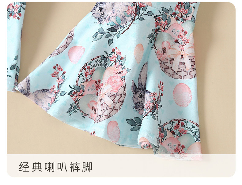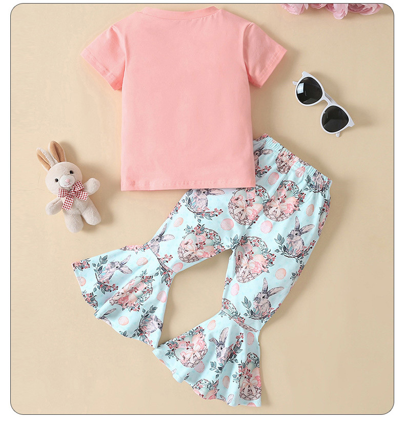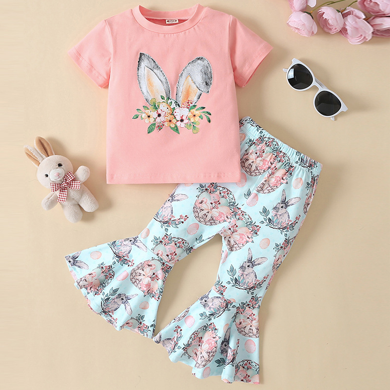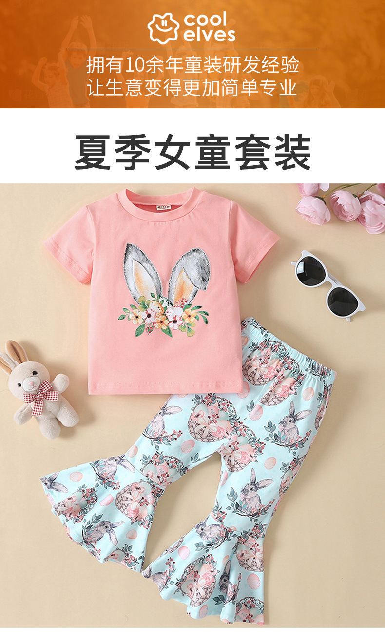 아동 의류 기본 소스 2023 새로운 반팔 소녀 여름 면 티셔츠 토끼 인쇄 플레어 바지 소녀 세트