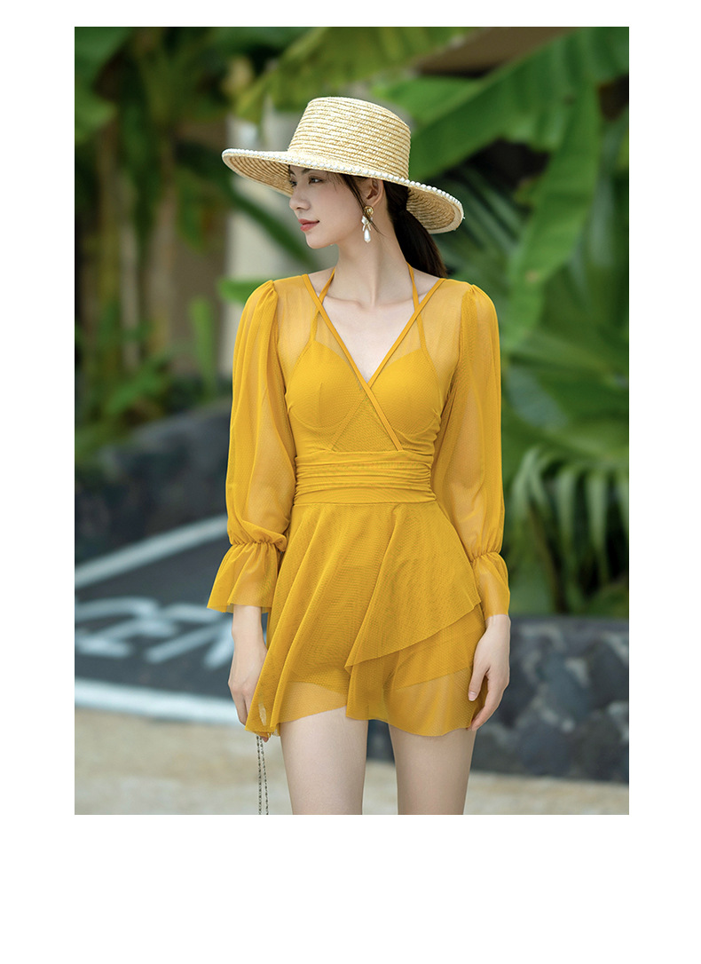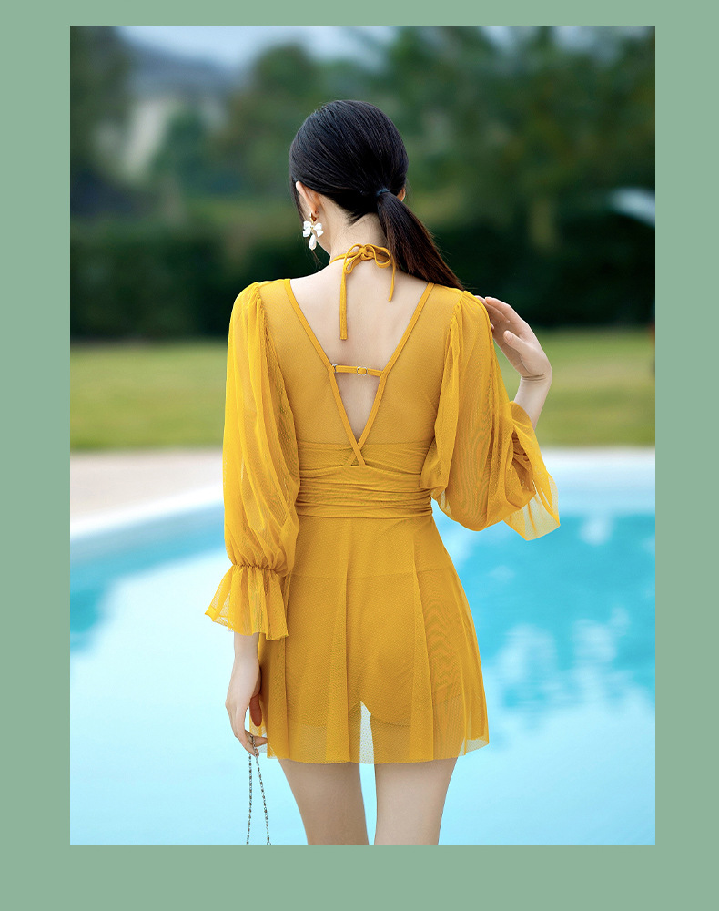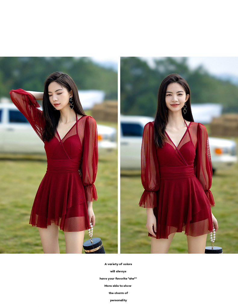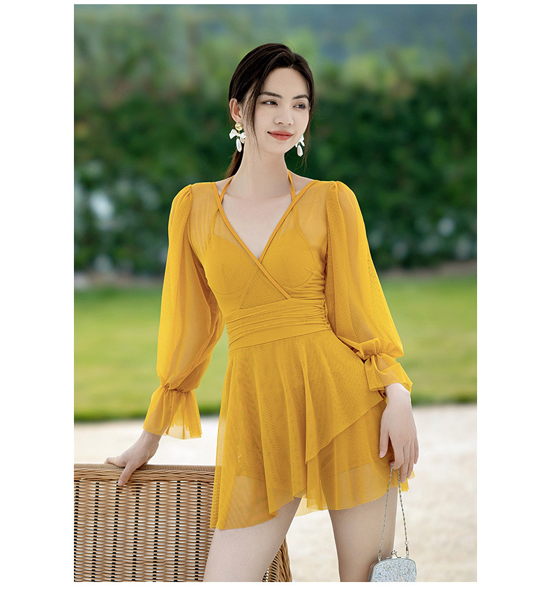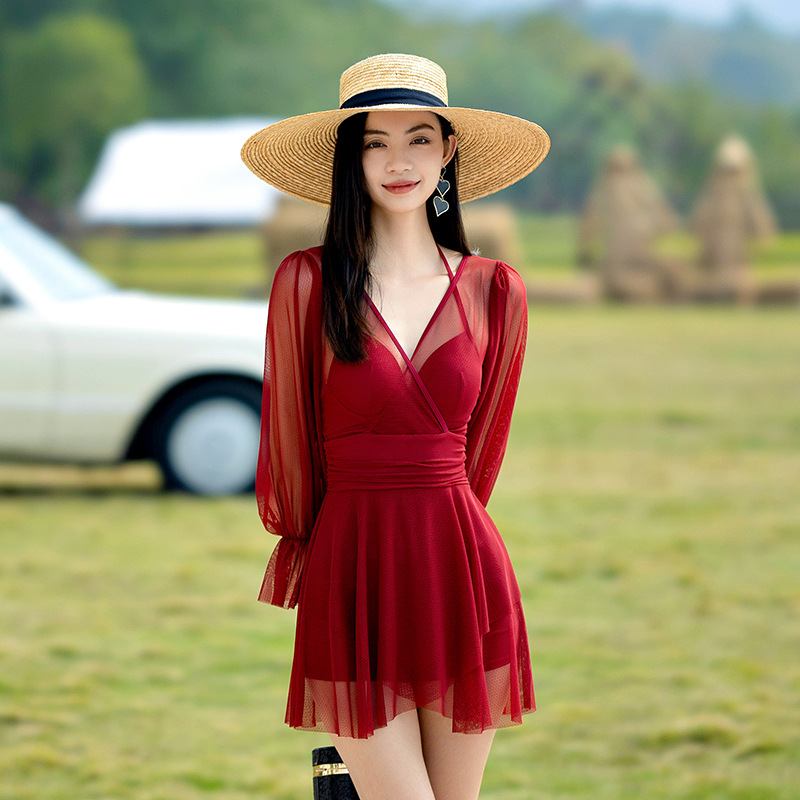 수영복 여성용 하이 웨이스트 배꼽 덮기 슬리밍 긴팔 원피스 수영복 여성용 여름 새로운 한국 스타일 보수적 인 해변 휴가 수영복