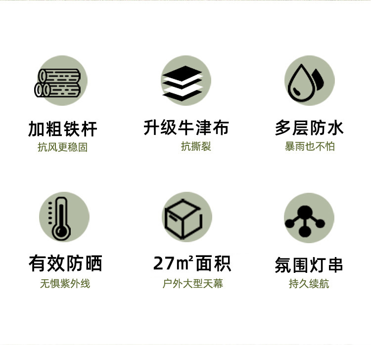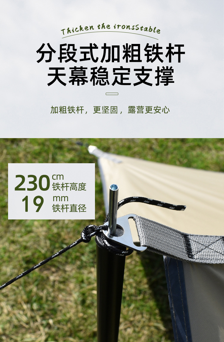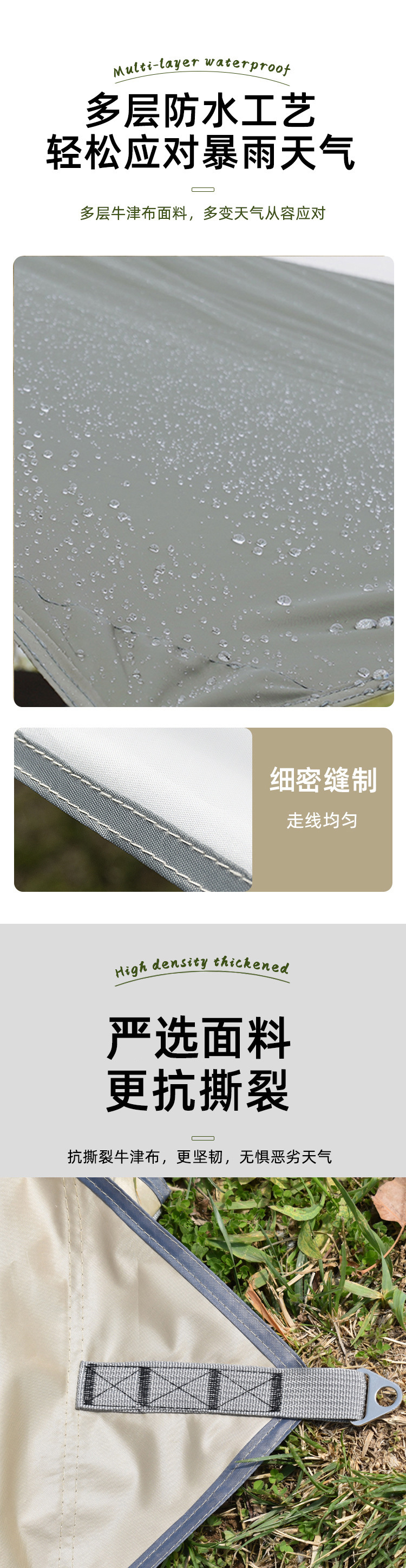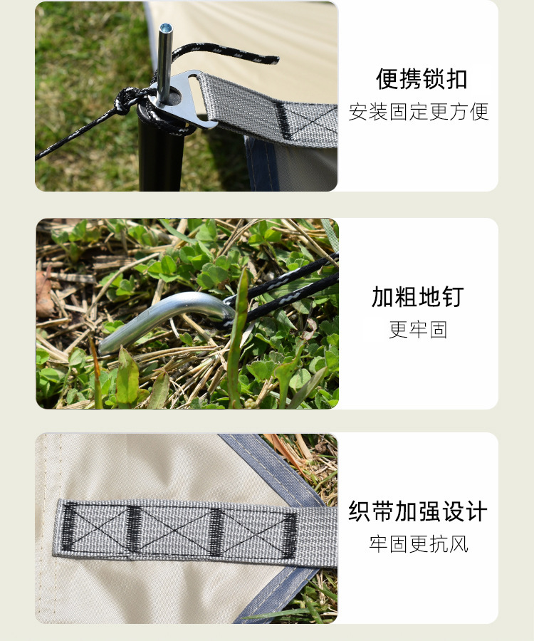 天幕接缝处的针眼有压胶,不漏雨,防晒防雨