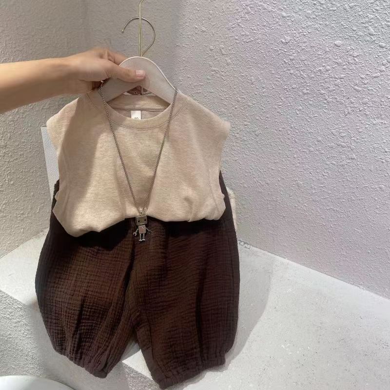 소년 조끼 정장 여름 아동 의류 2025 새로운 어린이 아기 민소매 중소 어린이 자른 바지 투피스 세트 유행스토어 가기