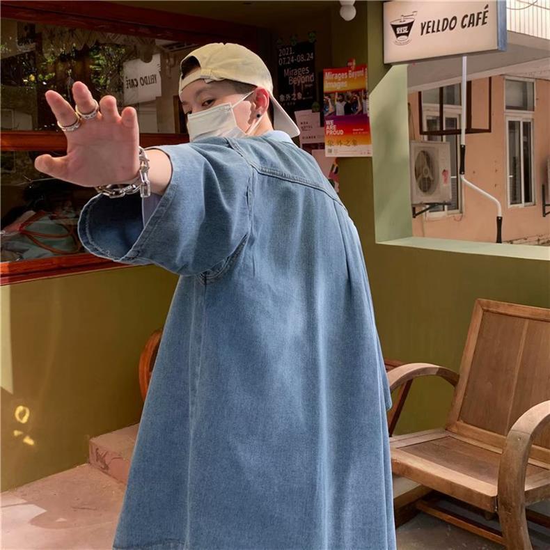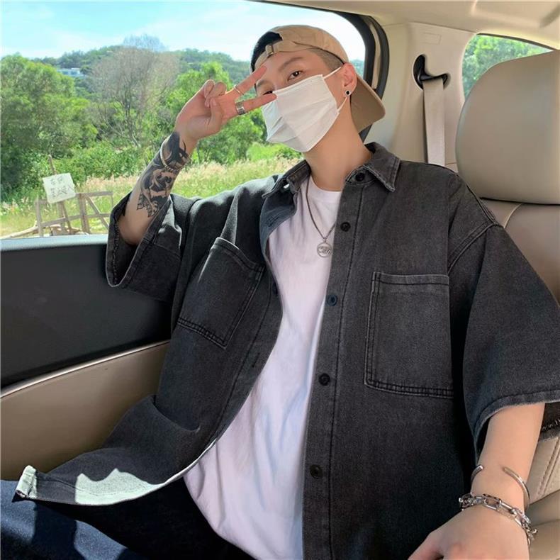 슈아이 셔츠 남자의 반팔 여름 홍콩 스타일 일본 데님 셔츠 캐주얼 트렌디 얇은 7 소매 카고 탑스토어 가기