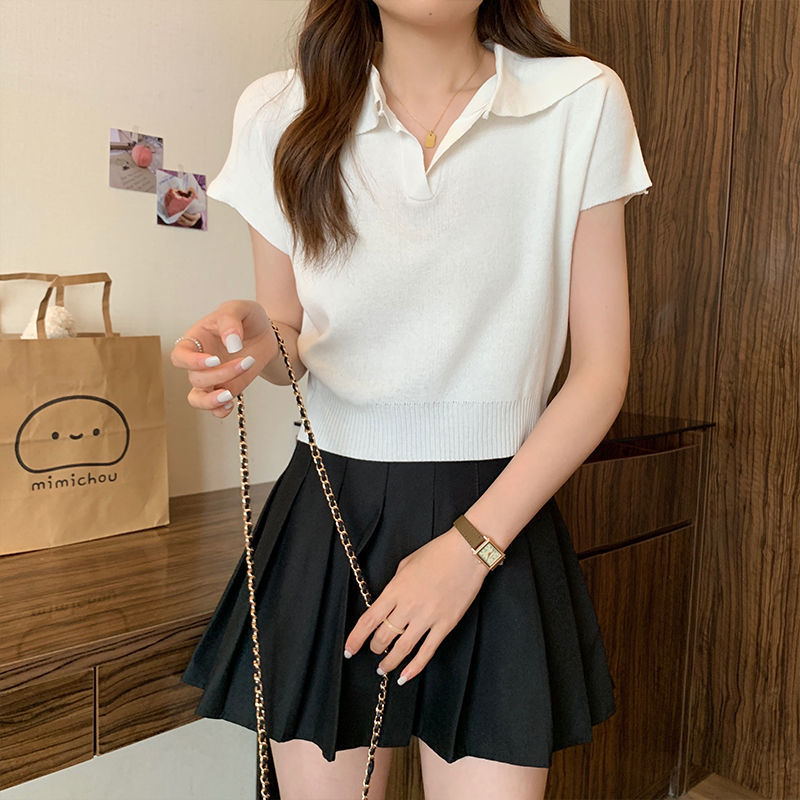2023 새로운 디자인 센스 틈새 폴로 칼라 니트 셔츠 반팔 티셔츠 여성용 신선한 스타일 여름 쇼트 탑 트렌디스토어 가기