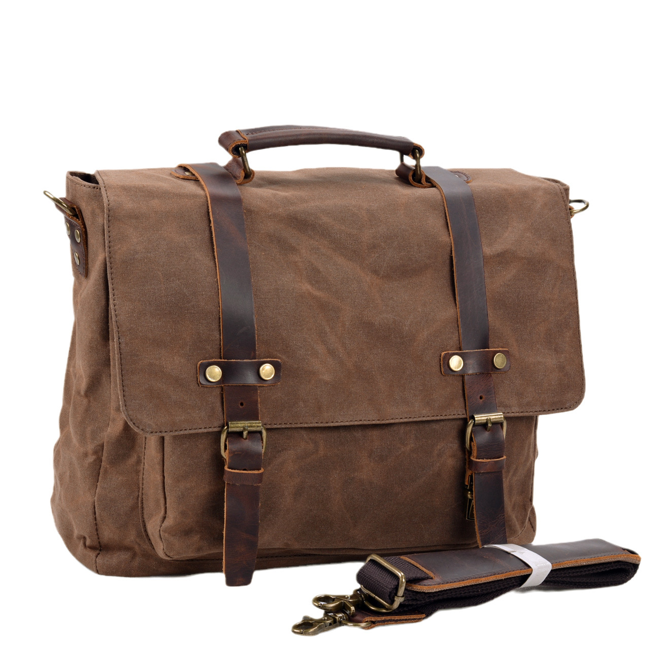 此款公文包包采用过蜡防水帆布配头层疯马牛皮,复古做旧。